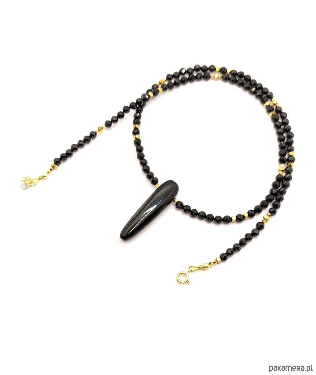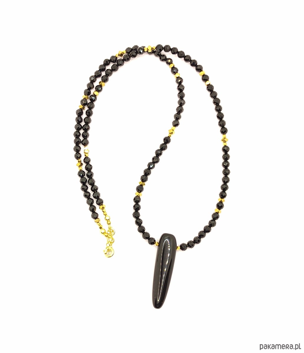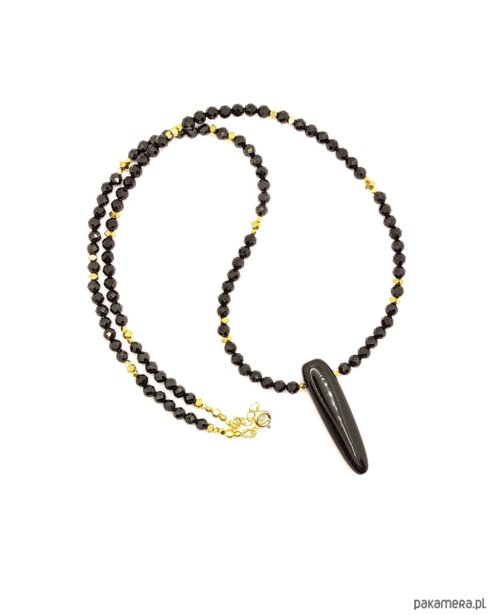 Pełen mocy naszyjnik z grotem. Sznur fasetowanych, czarnych turmalinów zwieńczony został onyksowym grotem. Zawieszka ma długość minimum 3 cm, pięknie lśni. Ten wyrazisty element nadaje niepowtarzalnego charakteru, przyciąga uwagę i budzi respekt. Ze względu na rozmiary pięknie leży zarówno na ciele, jak również na swetrze czy do marynarki.