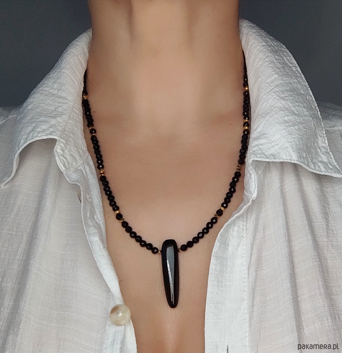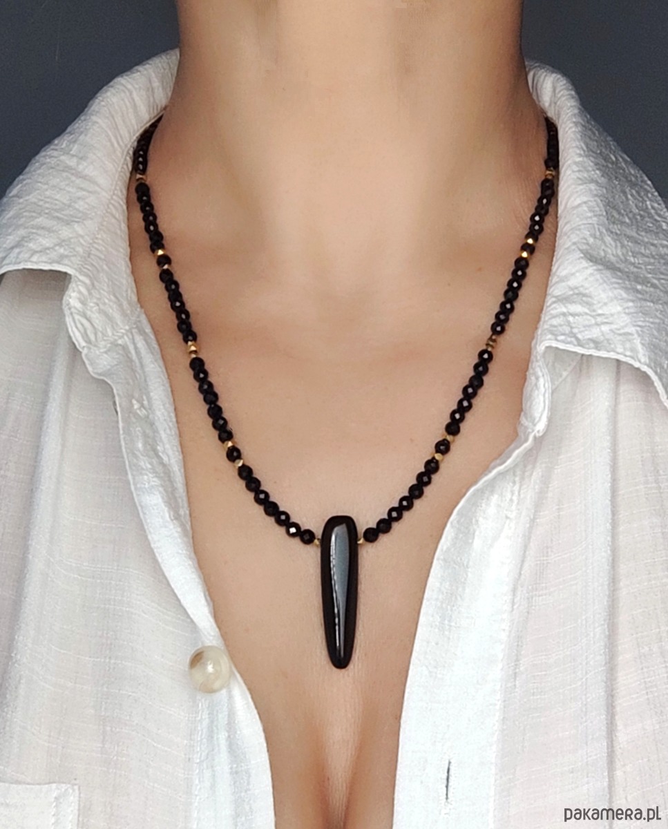 Pełen mocy naszyjnik z grotem. Sznur fasetowanych, czarnych turmalinów zwieńczony został onyksowym grotem. Zawieszka ma długość minimum 3 cm, pięknie lśni. Ten wyrazisty element nadaje niepowtarzalnego charakteru, przyciąga uwagę i budzi respekt. Ze względu na rozmiary pięknie leży zarówno na ciele, jak również na swetrze czy do marynarki.