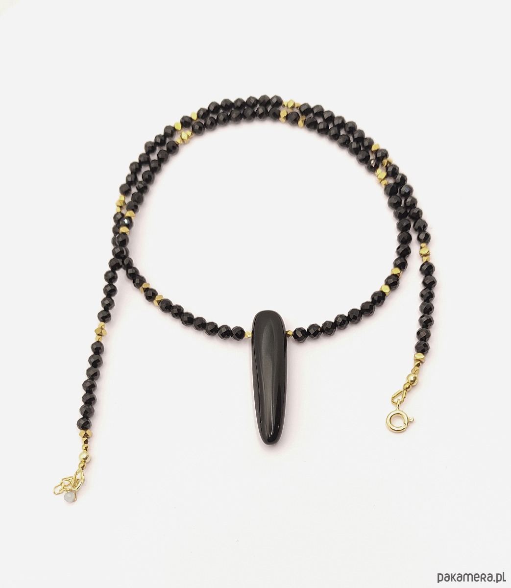 Pełen mocy naszyjnik z grotem. Sznur fasetowanych, czarnych turmalinów zwieńczony został onyksowym grotem. Zawieszka ma długość minimum 3 cm, pięknie lśni. Ten wyrazisty element nadaje niepowtarzalnego charakteru, przyciąga uwagę i budzi respekt. Ze względu na rozmiary pięknie leży zarówno na ciele, jak również na swetrze czy do marynarki.