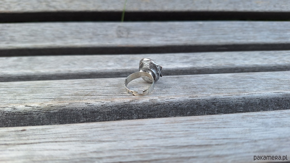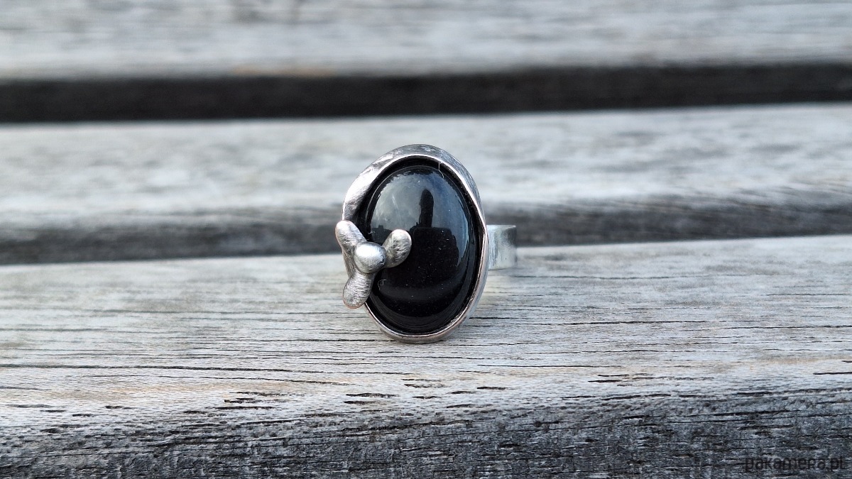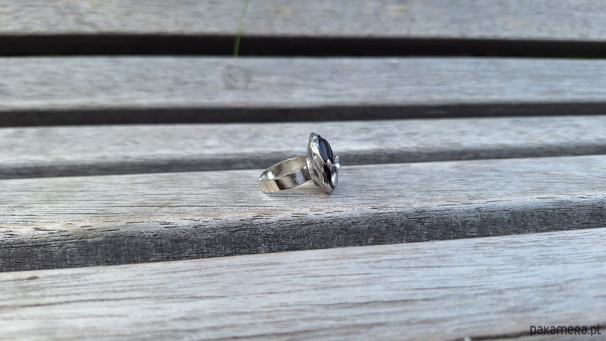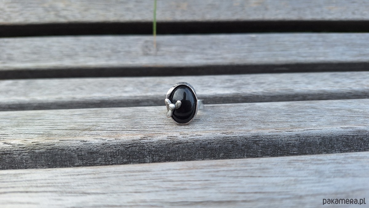 Pierścionek wykonany z miedzi, cyny i onyksu. Wymiary ok. 1.8 na 1.4 cm. Regulowany. Nie jest ciężki.