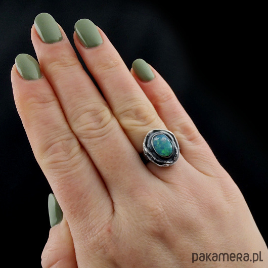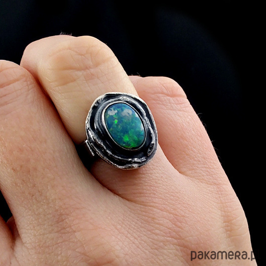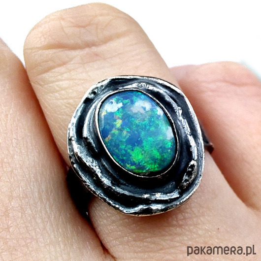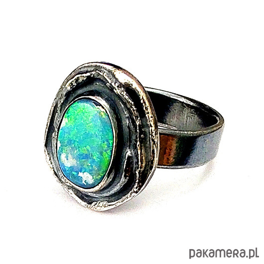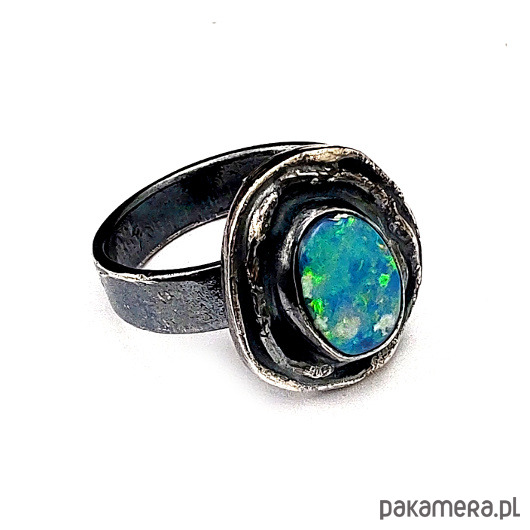 Oryginalny pierścionek z naturalnym opalem australijskim (dublet). Okaz o pięknej opalizacji. Oprawa kamienia 17 x 15 mm. Obrączka zrobiona ze srebra pr. 925, oksydowana, szerokość 5 mm. Rozmiar jubilerski 14, mogę powiększyć pierścionek do max 18. Waga 6.66 g. Pierścień zostanie zapakowany w ozdobne pudełeczko.