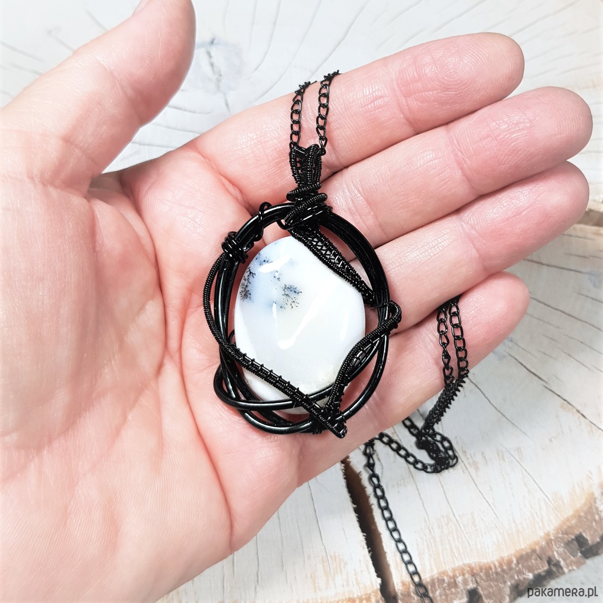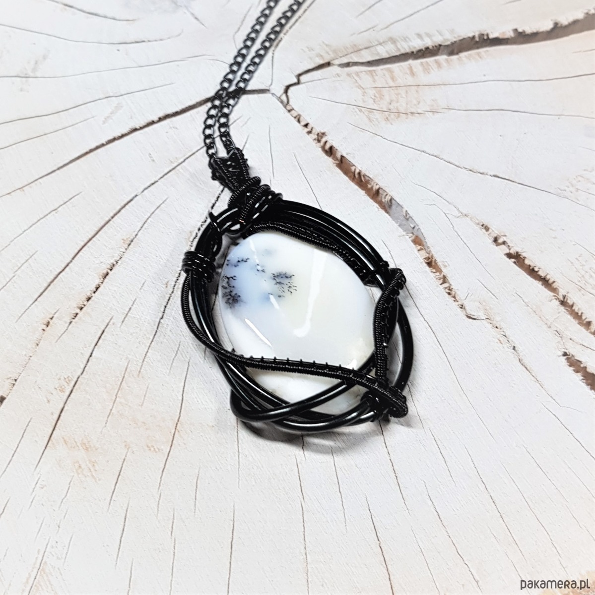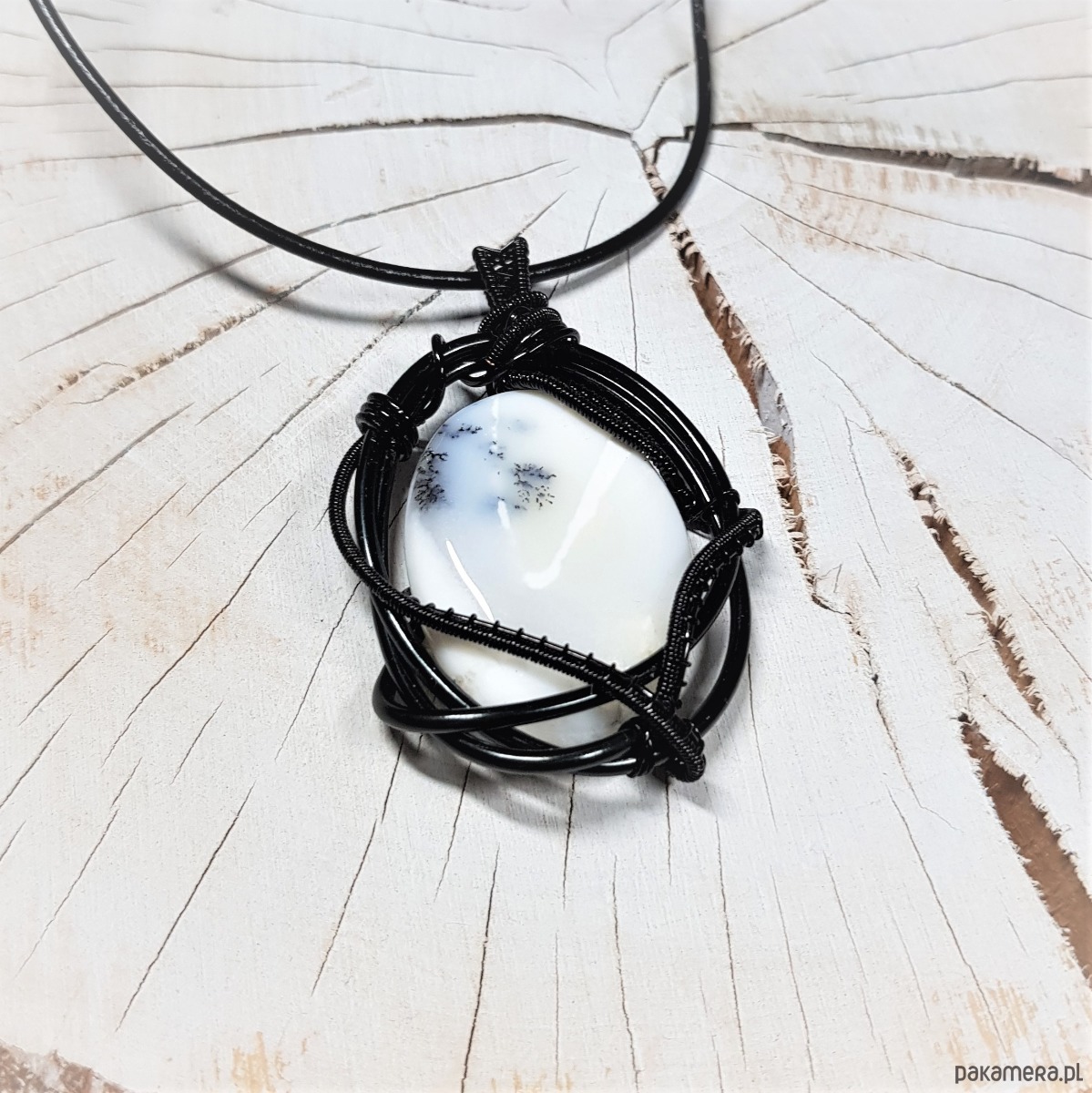 Zawieszka wykonana ręcznie w czarnym drucie powlekanym metodą wire-wrappingu której głównym elementem jest naturalny opal dendrytowy . Wymiary zawieszki 58x39mm z gratisowym łańcuszkiem długości około 48-50 cm lub rzemykiem do wyboru.