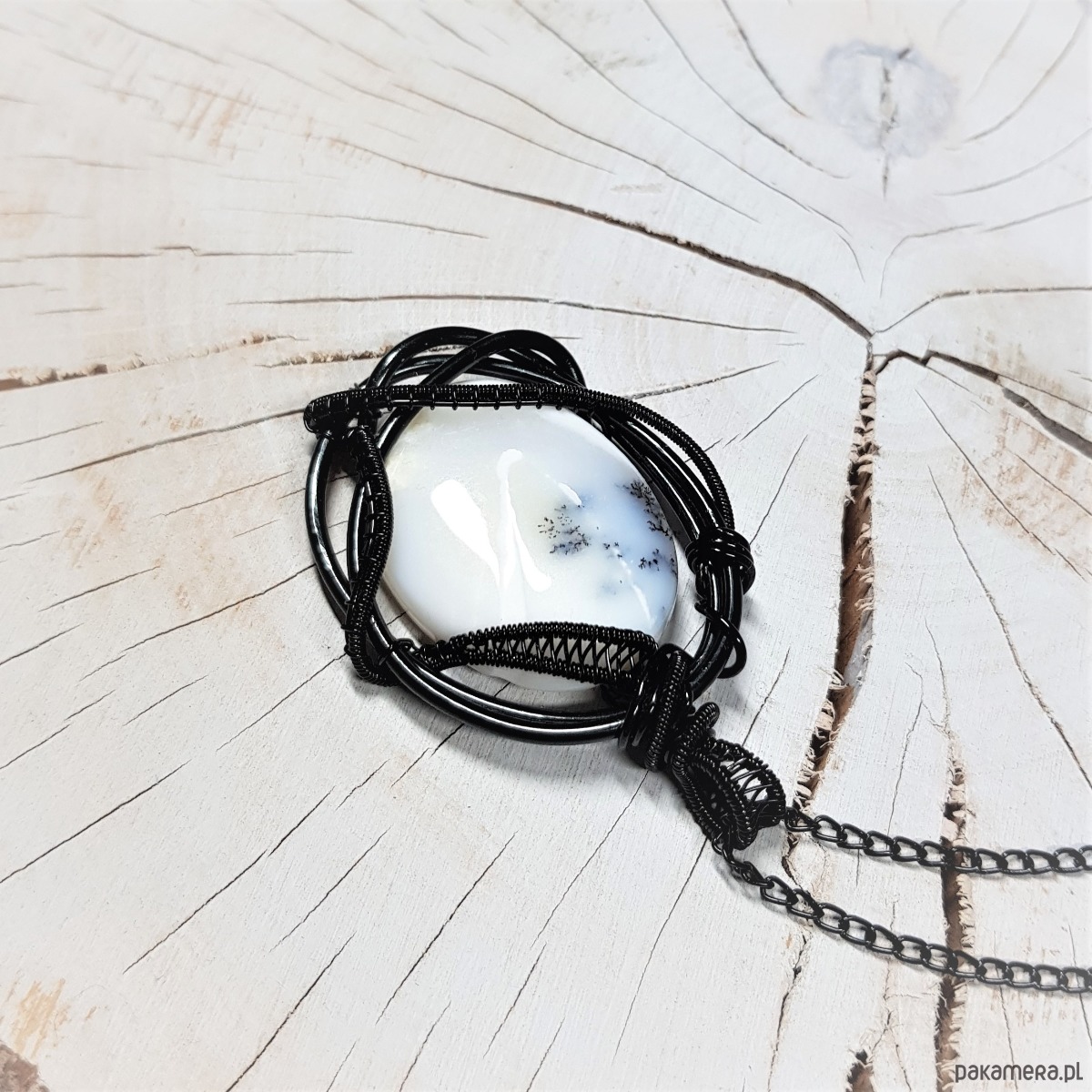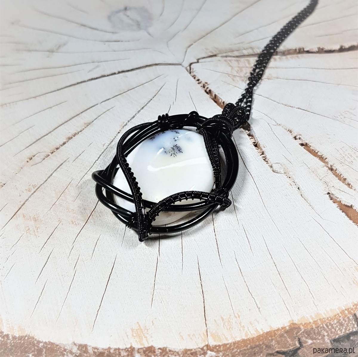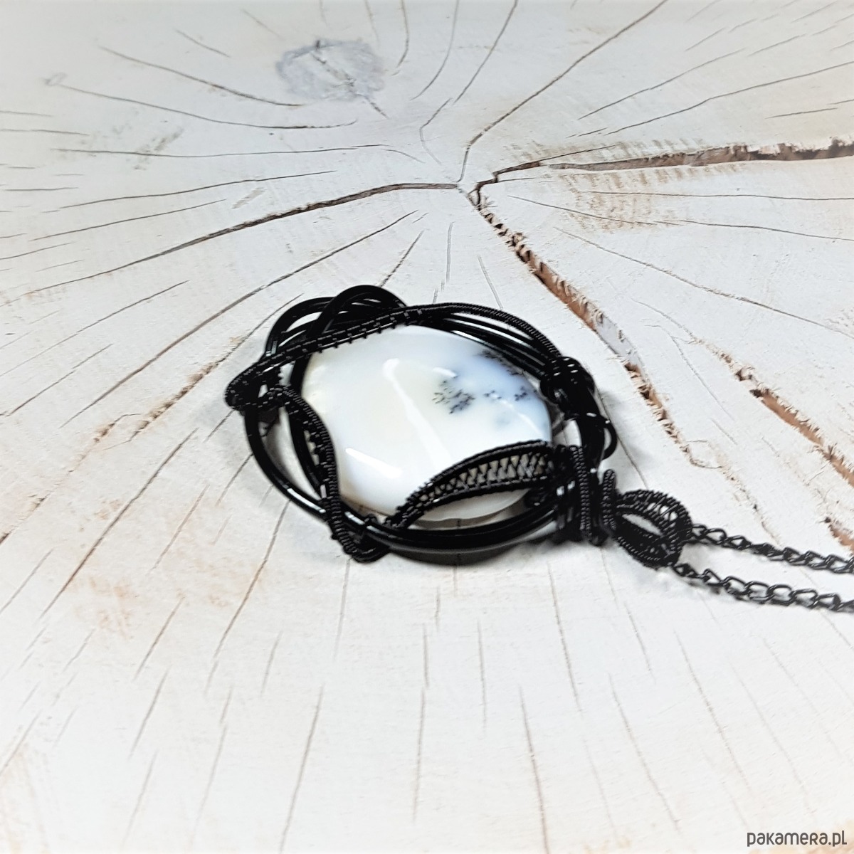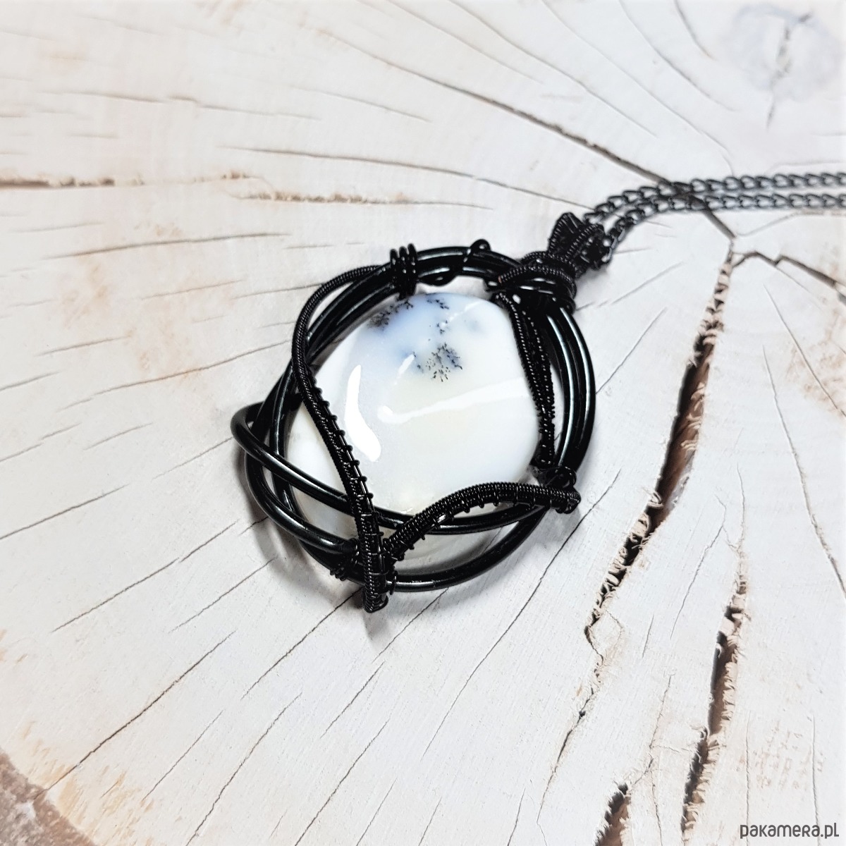 Zawieszka wykonana ręcznie w czarnym drucie powlekanym metodą wire-wrappingu której głównym elementem jest naturalny opal dendrytowy . Wymiary zawieszki 58x39mm z gratisowym łańcuszkiem długości około 48-50 cm lub rzemykiem do wyboru.