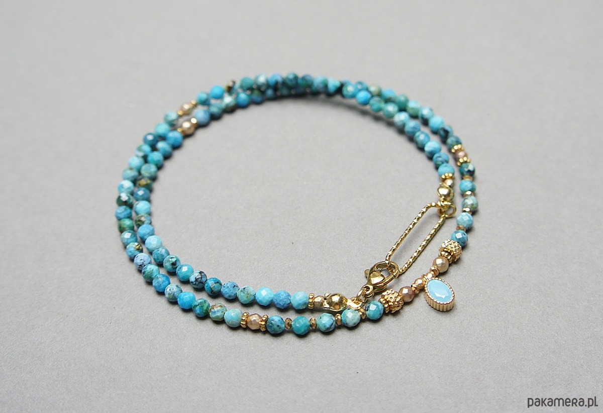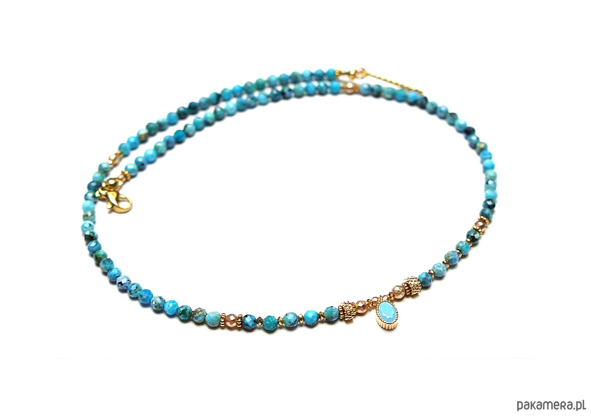 Krótki, delikatny naszyjnik wykonany w całości z pozłacanej stali szlachetnej oraz naturalnych, szlachetnych kamieni - fasetowanych, niebieskich opali [3mm], hematytu fasetowanego, platerowanego [2mm i 3mm], przekładek z hematytu [1mm] oraz zawieszki z cyrkonią w okuciu. Naszyjnik o długości ok. 42,1cm.
