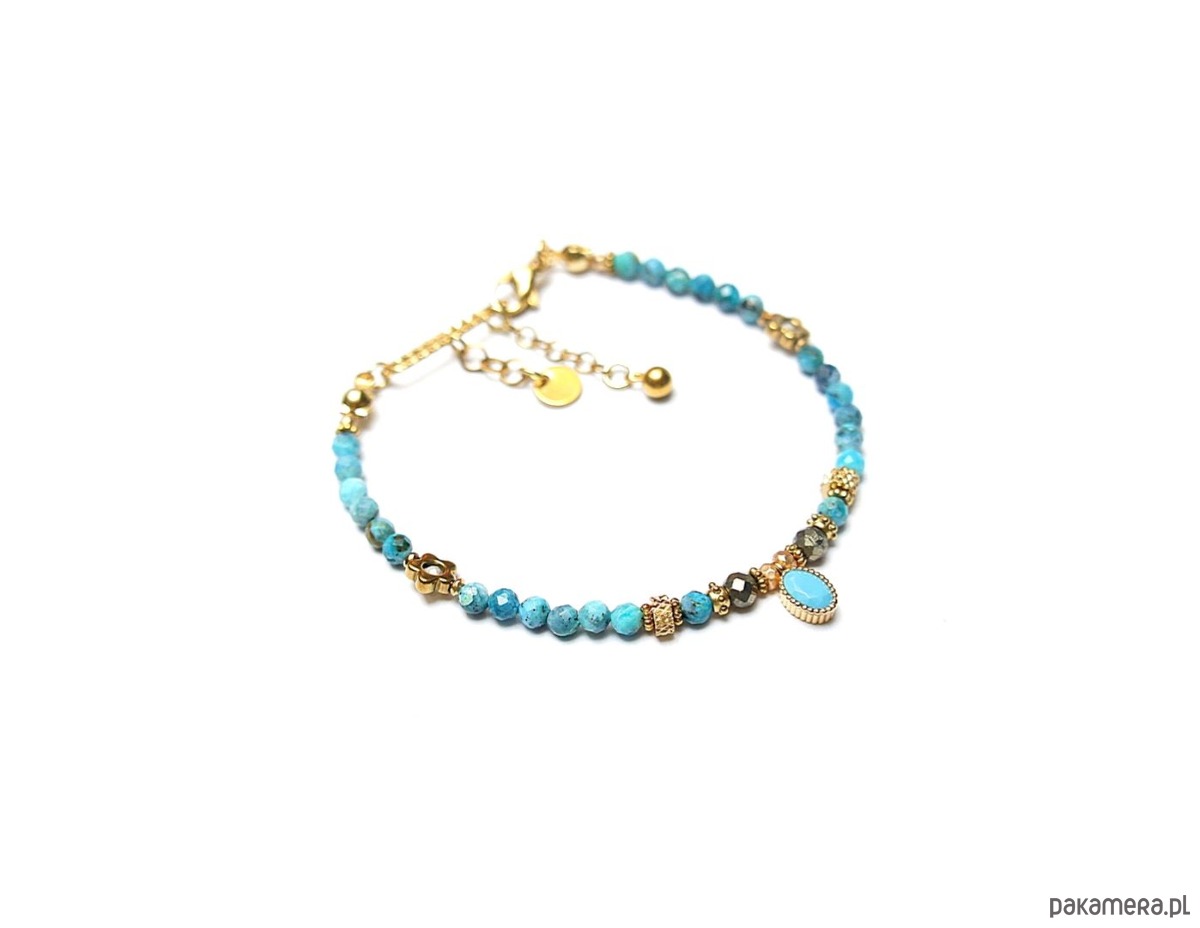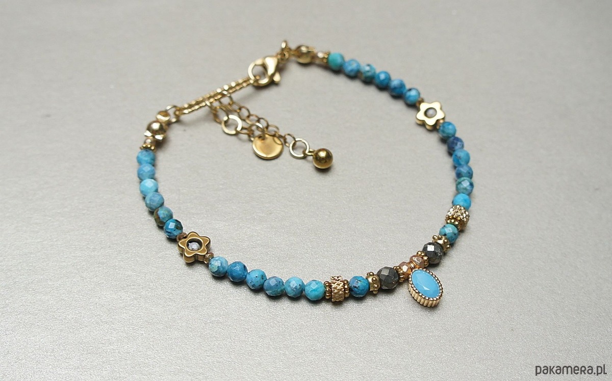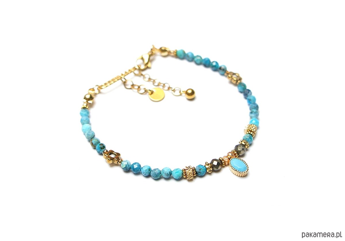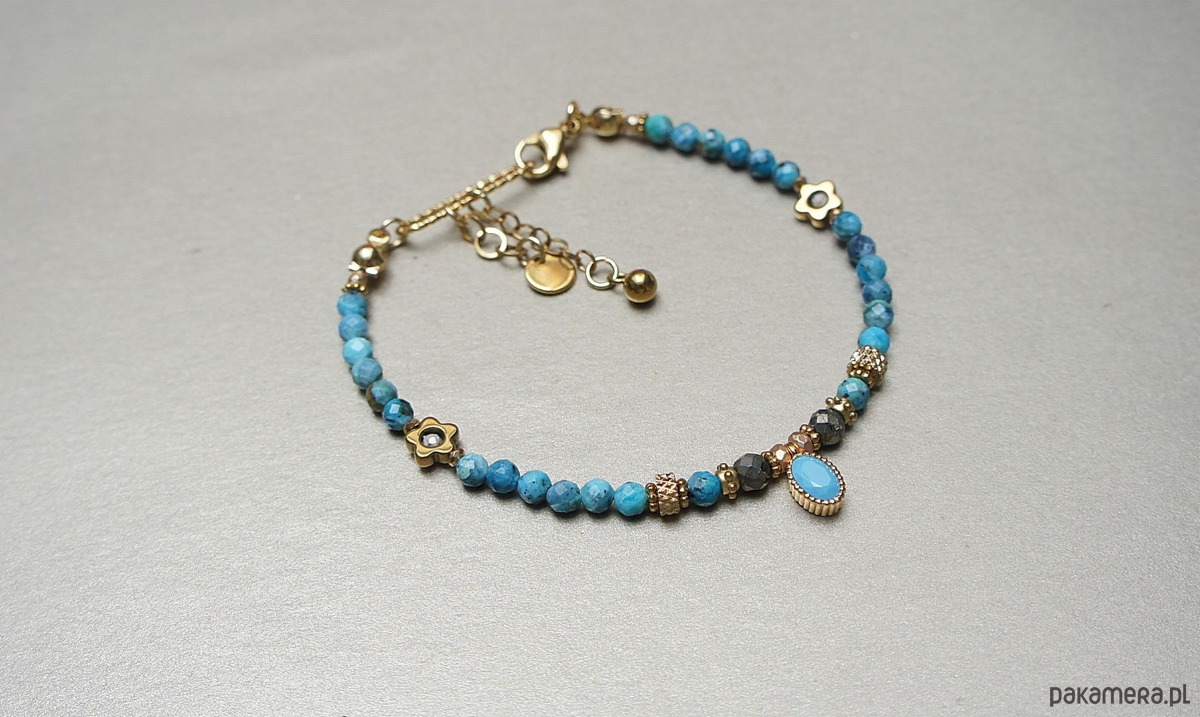Bransoletka wykonana w całości z pozłacanej stali szlachetnej oraz naturalnych, szlachetnych kamieni - fasetowanych, niebieskich opali [3mm], pirytu fasetowanego [3,5mm], szafirów [1,5mm], hematytu fasetowanego, platerowanego [3 x 2mm], przekładek z hematytu [6mm - kwiatki] oraz zawieszki z cyrkonią w okuciu. Bransoletka o długości ok.20cm.