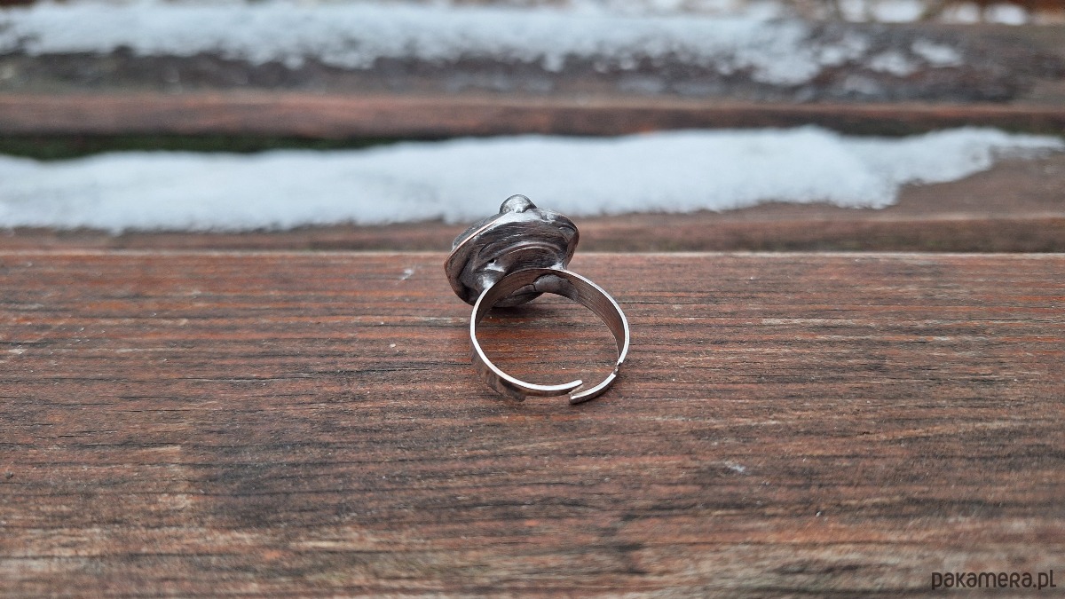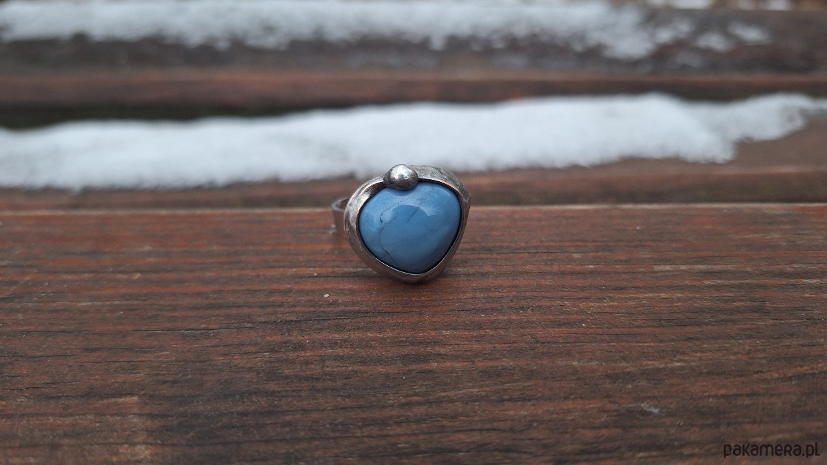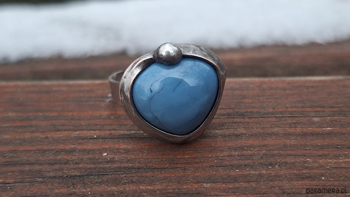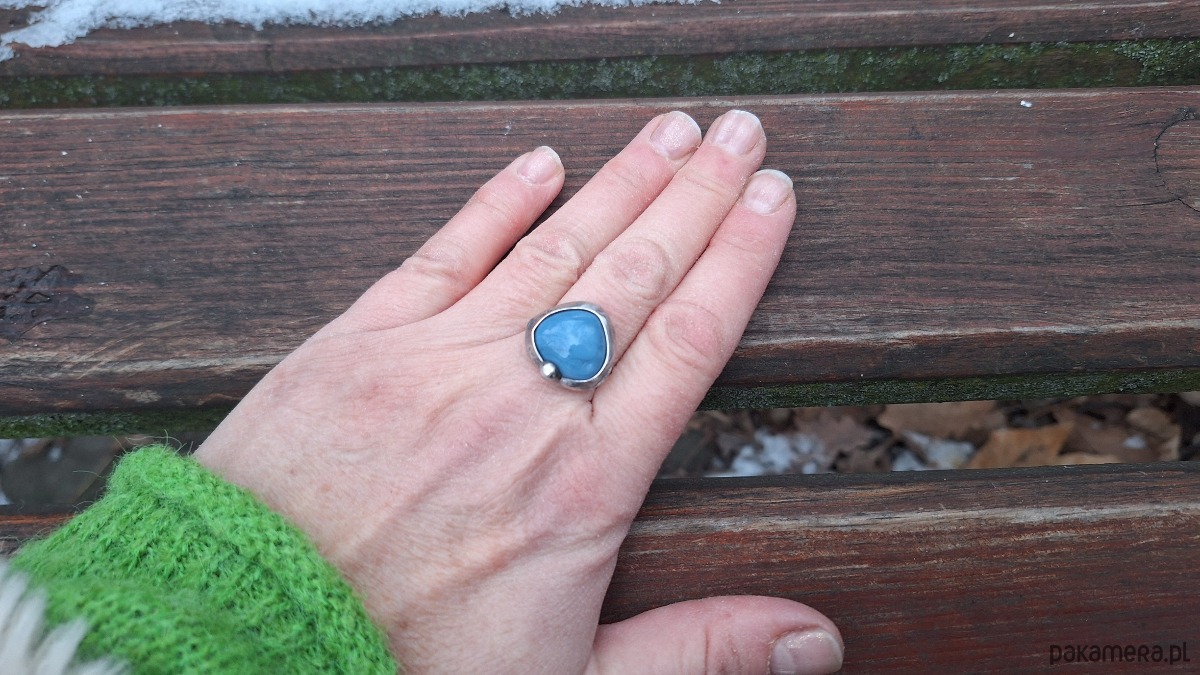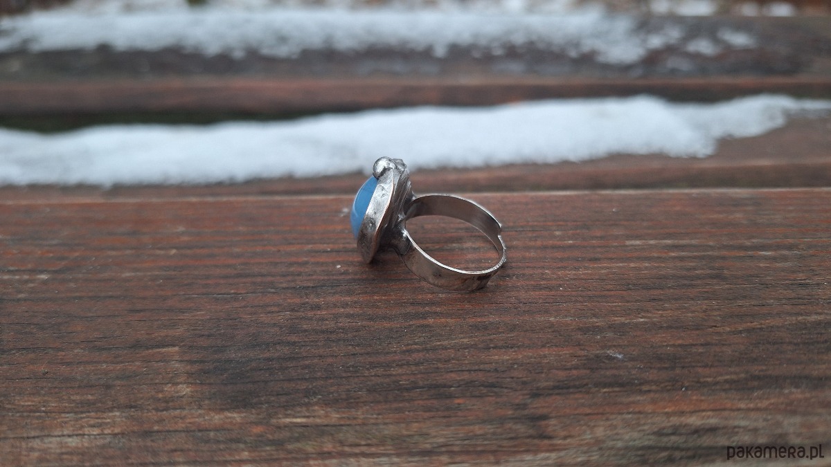 Pierścionek wykonany z miedzi, cyny i niebieskiego opala. Wymiary ok. 1.5 na 1.5 cm. Regulowany. Nie jest ciężki.