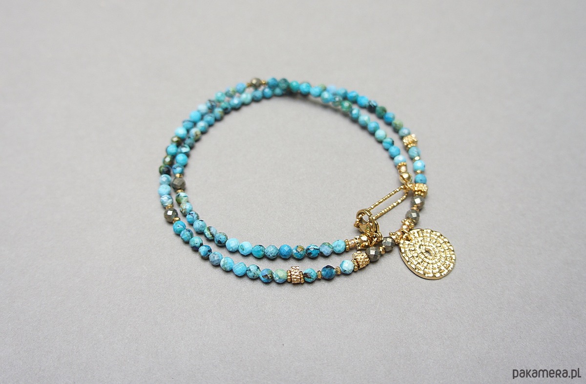 Krótki, delikatny naszyjnik wykonany w całości z pozłacanej stali szlachetnej oraz naturalnych, szlachetnych kamieni - fasetowanych, niebieskich opali [3mm], pirytu fasetowanego [3,5mm], hematytu fasetowanego, platerowanego [2mm], przekładek z hematytu [1mm]. Naszyjnik o długości ok. 43cm.