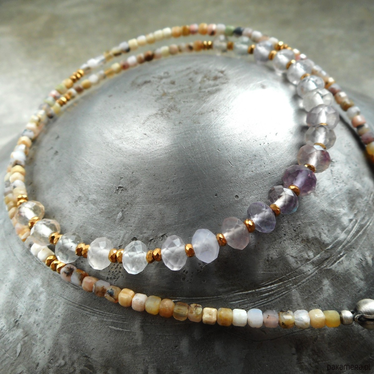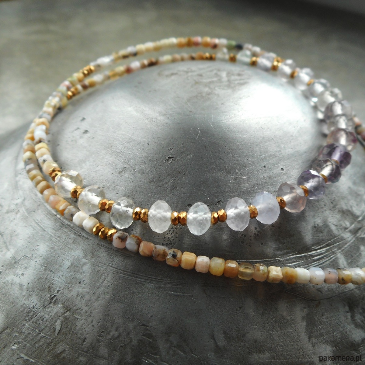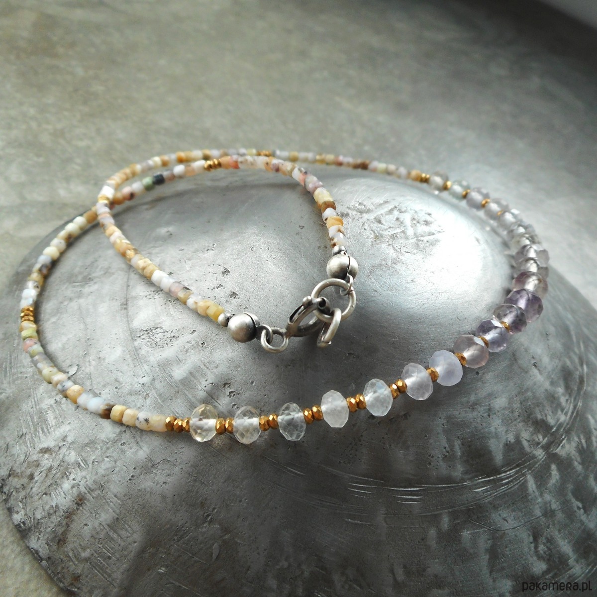 Piękny, krótki naszyjnik wykonany ze szlachetnego srebra i kamieni naturalnych; elegancki, prosty w formie, ale piękny poprzez mocno połyskujące złote kamyki hematytu i transparentne pastelowe fluoryty.