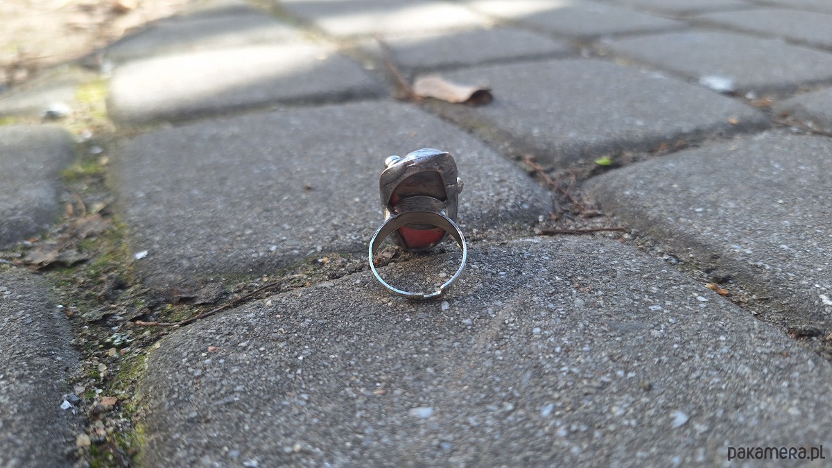 Pierścionek wykonany z miedzi, cyny i naturalnego opala. Wymiary ok. 3.2 na 1.5 cm. Regulowany. Nie jest ciężki.