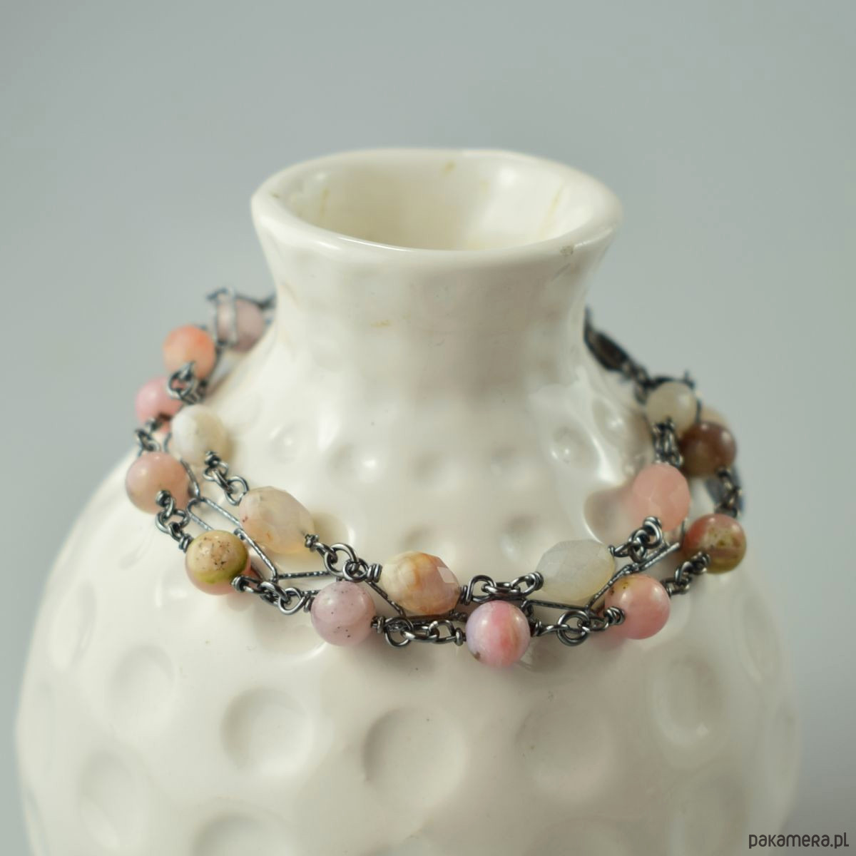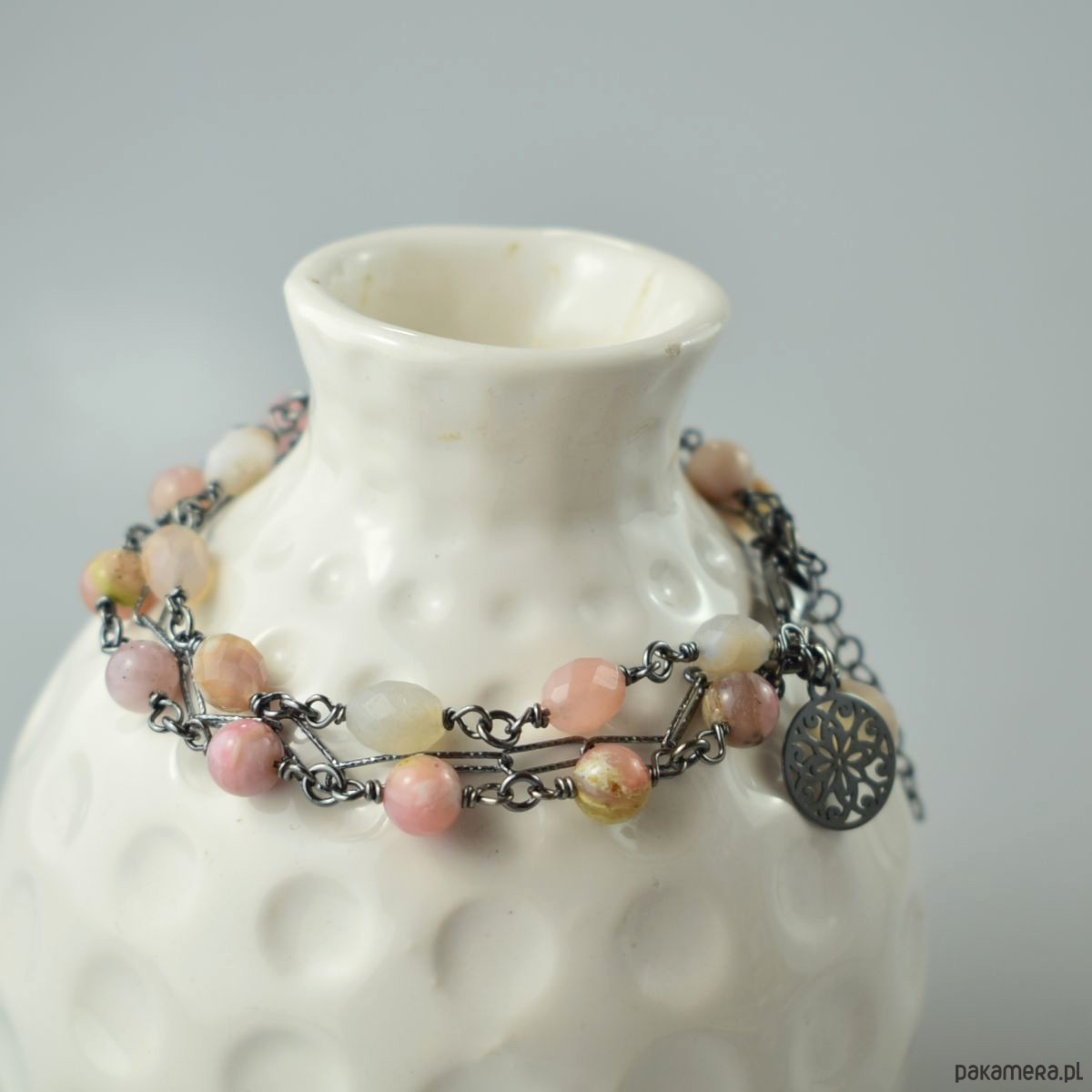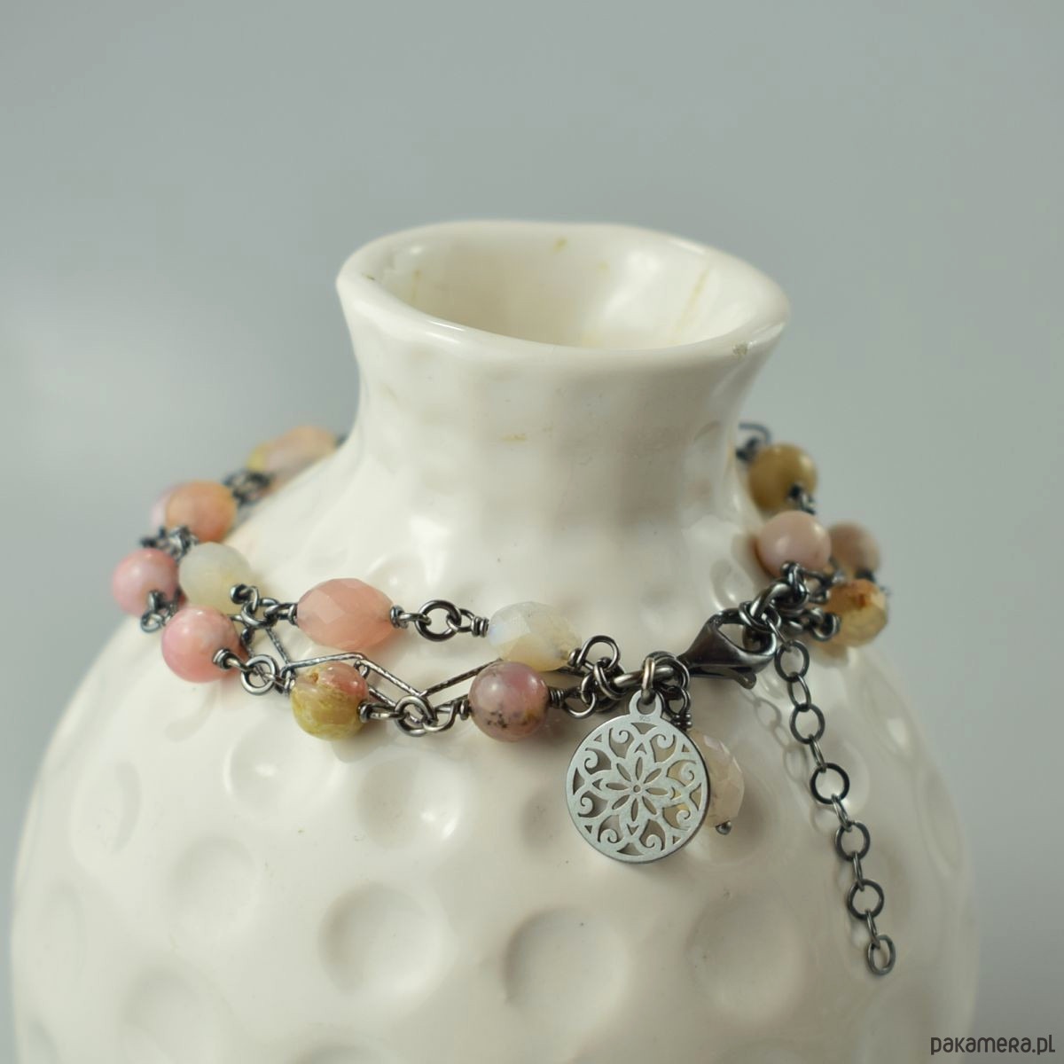 Bransoletka wykonana w całości ze srebra (próba 925) z różowym opalem i agatem sakura. Całość została zoksydowana (przyciemniona) i wypolerowana. Długość regulowana 19 - 22 cm. Biżuteria zostanie ozdobnie zapakowana.