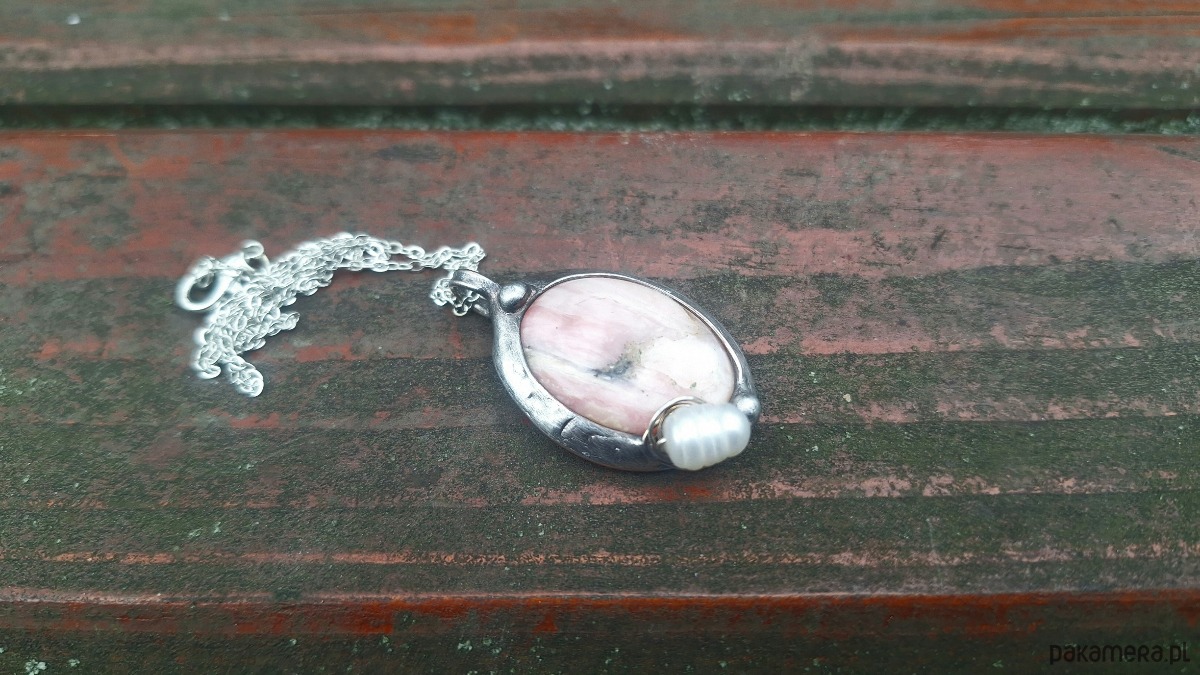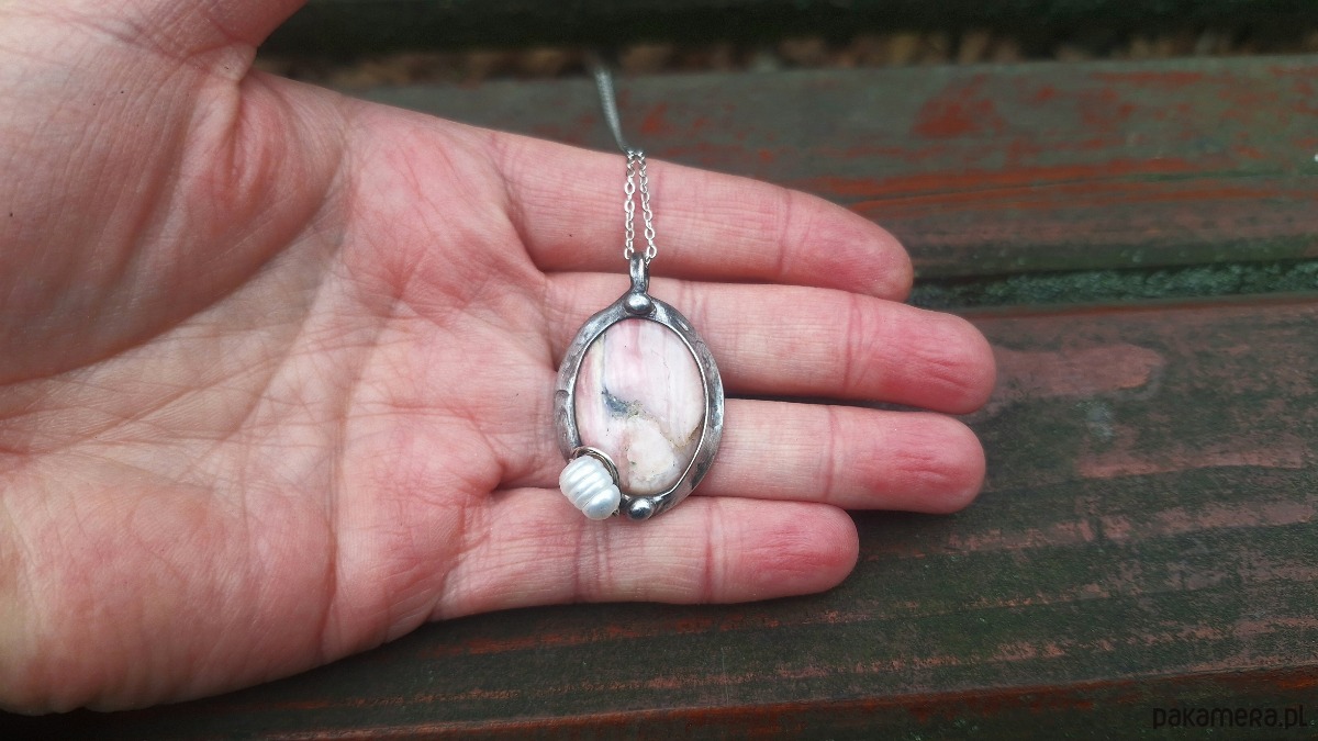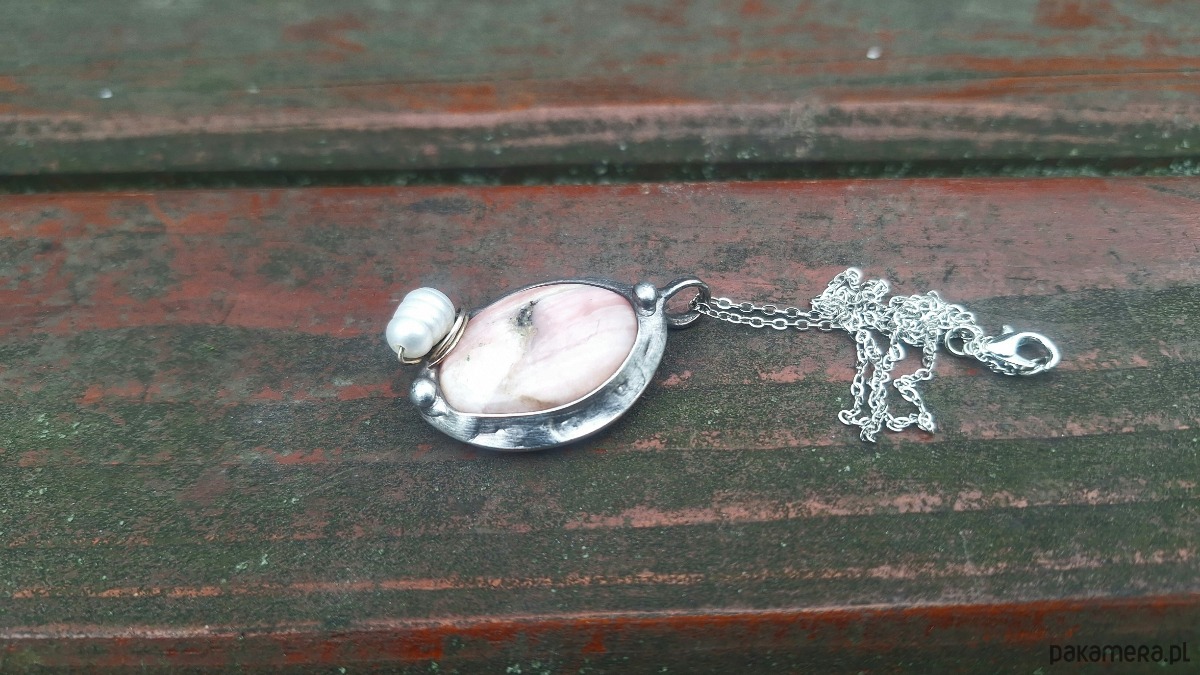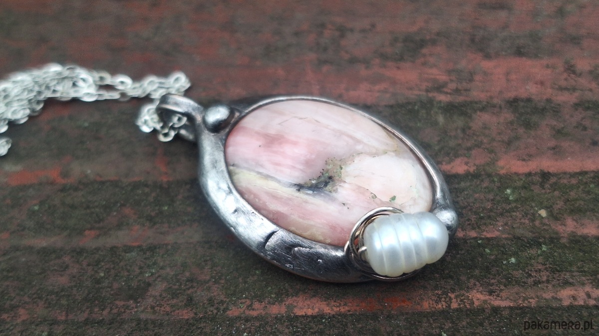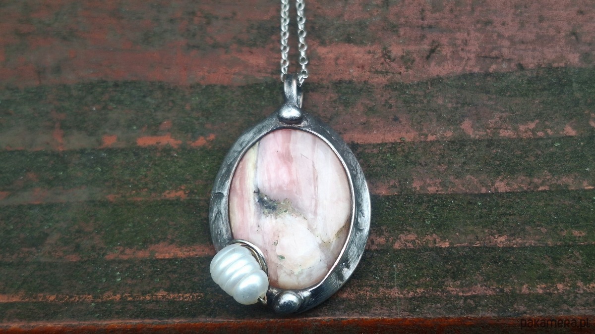 Wisiorek wykonany z miedzi, cyny, naturalnego, różowego opala i perły słodkowodnej. Wymiary ok. 3.2 na 2 4 cm. Zawieszony na łańcuszku o długości ok. 50 cm.