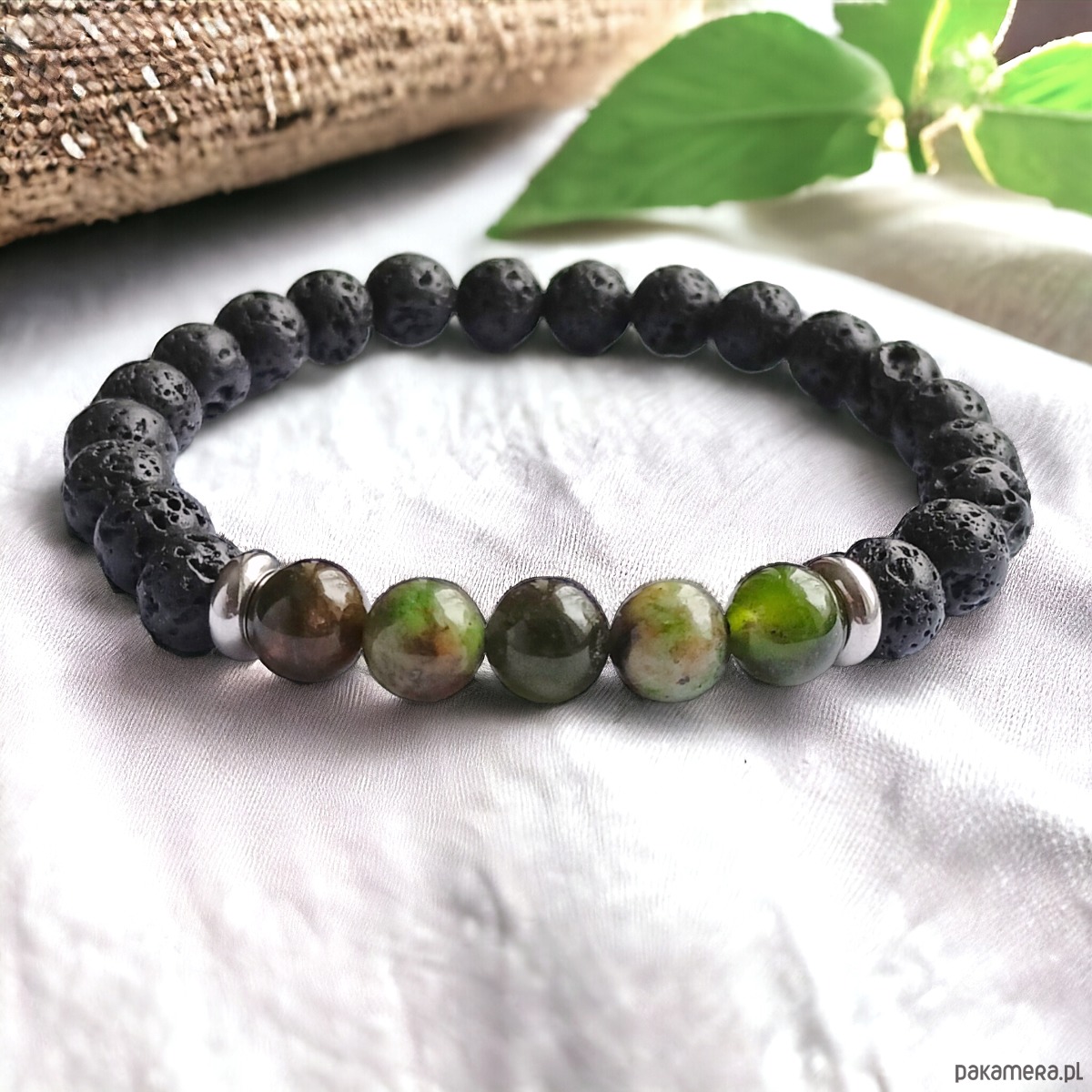 niezwykle ciekawa bransoletka- talizman wykonana z porowatej lawy wulkanicznej (8mm), opala zielonego 8mm, przekładek ze stali szlachetnej (nie uczula, kolor nie ściera się)