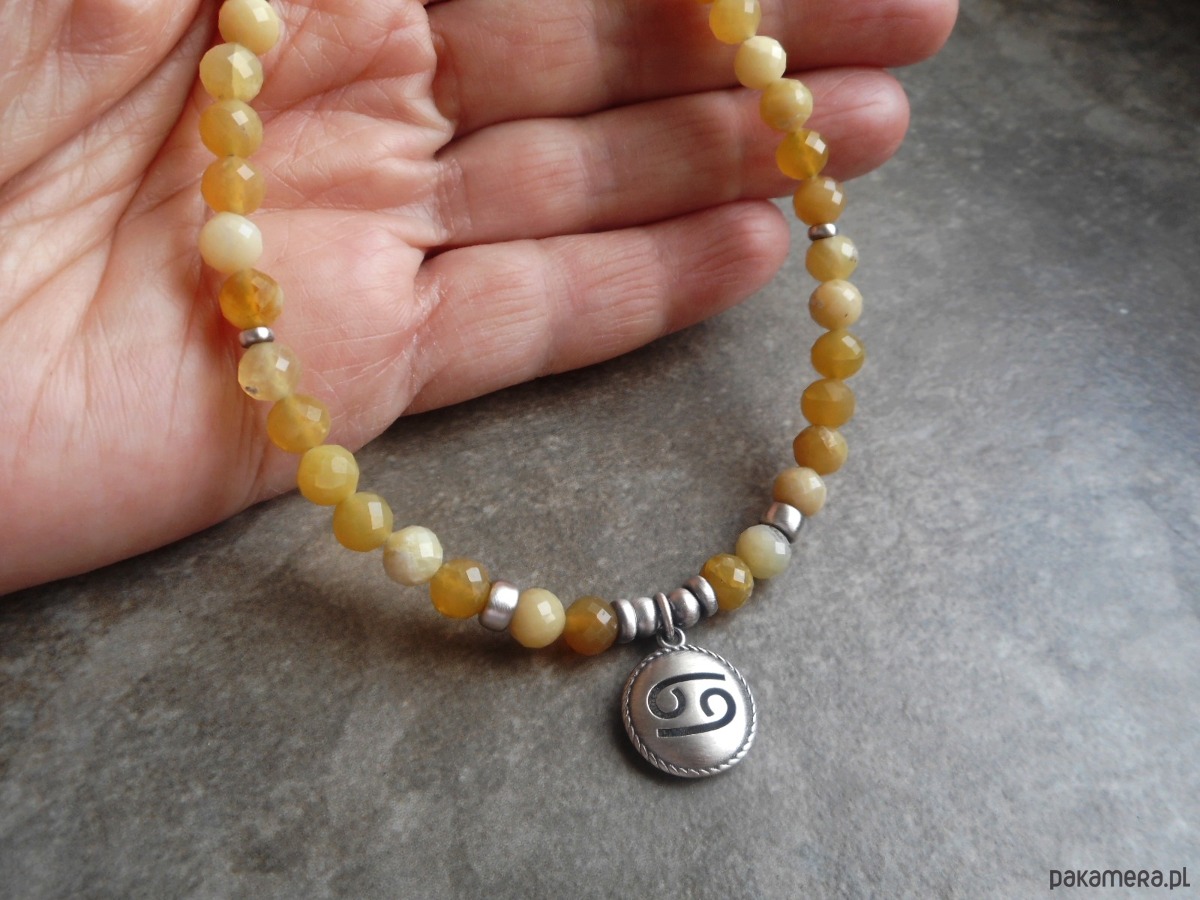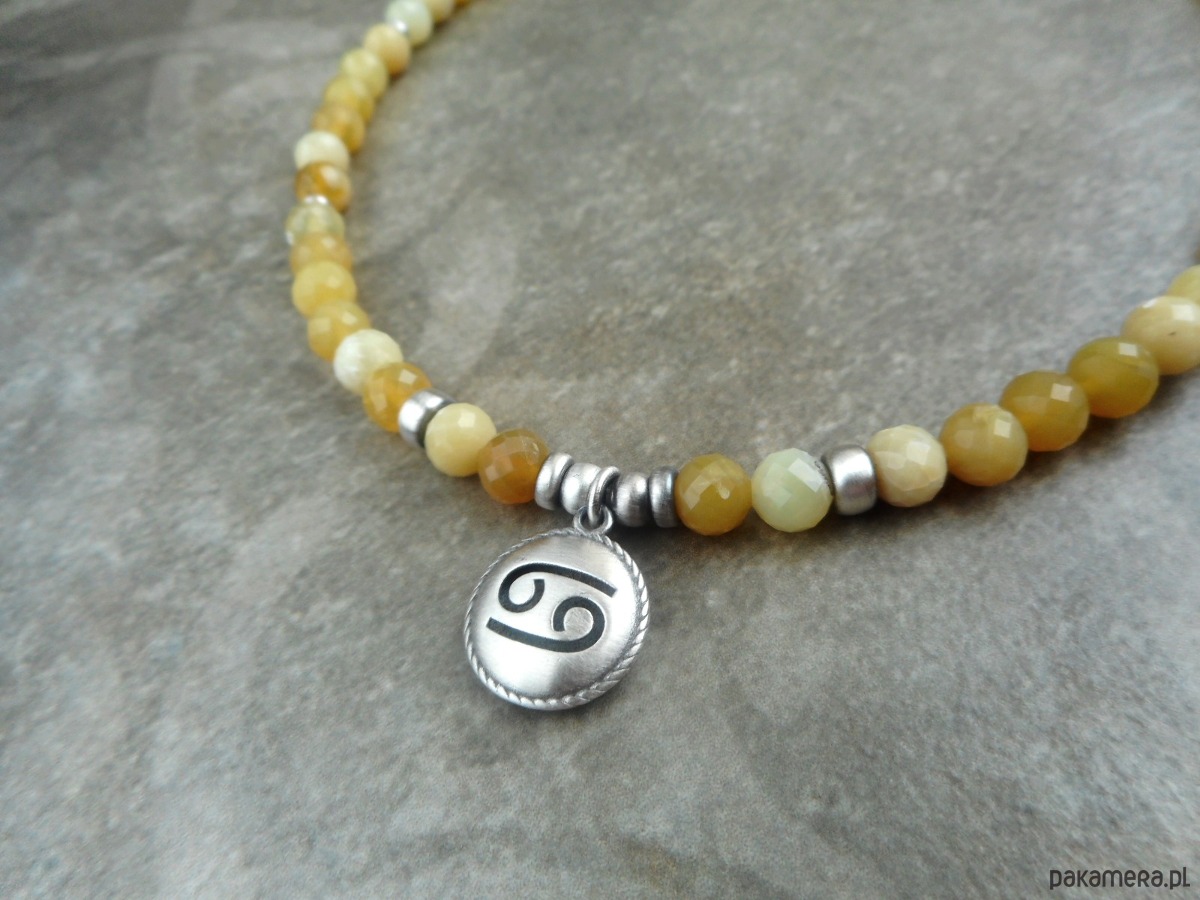 Naszyjnik wykonany ze szlachetnego srebra i kamieni naturalnych; dedykowany zodiakalnym rakom, z wypukłą zawieszką z wyciętym symbolem znaku raka; zawieszony na sznurze żółtych opali, które harmonizują również z tym znakiem.