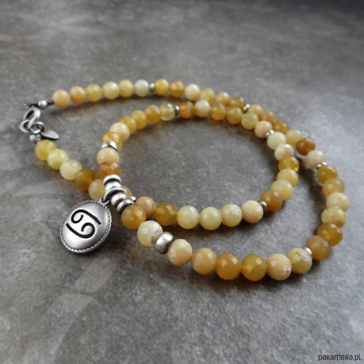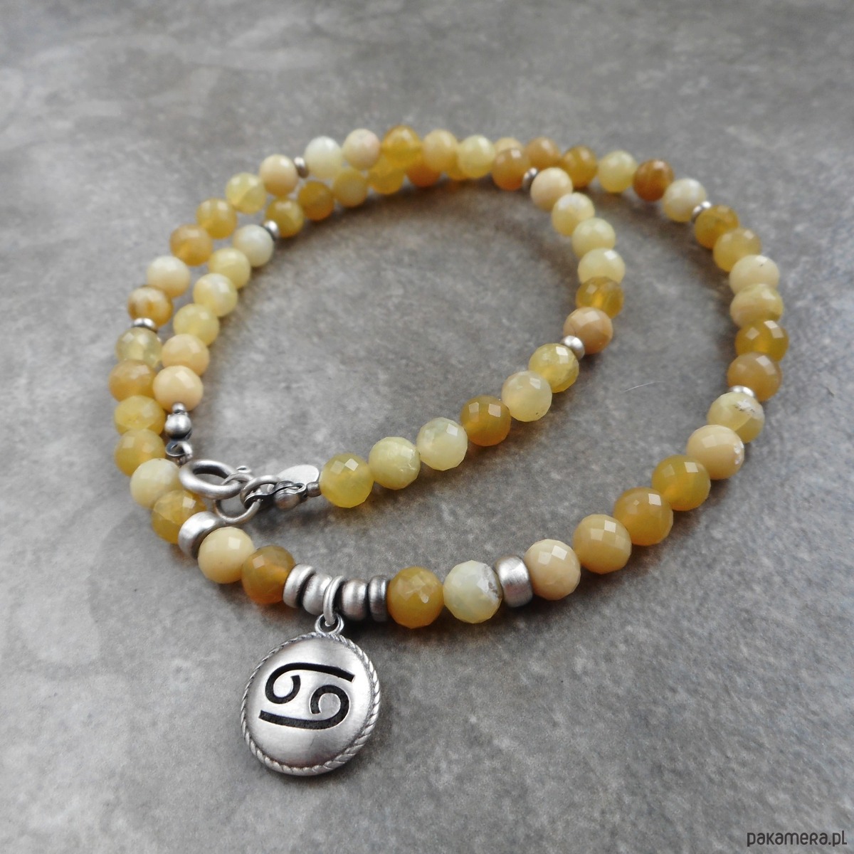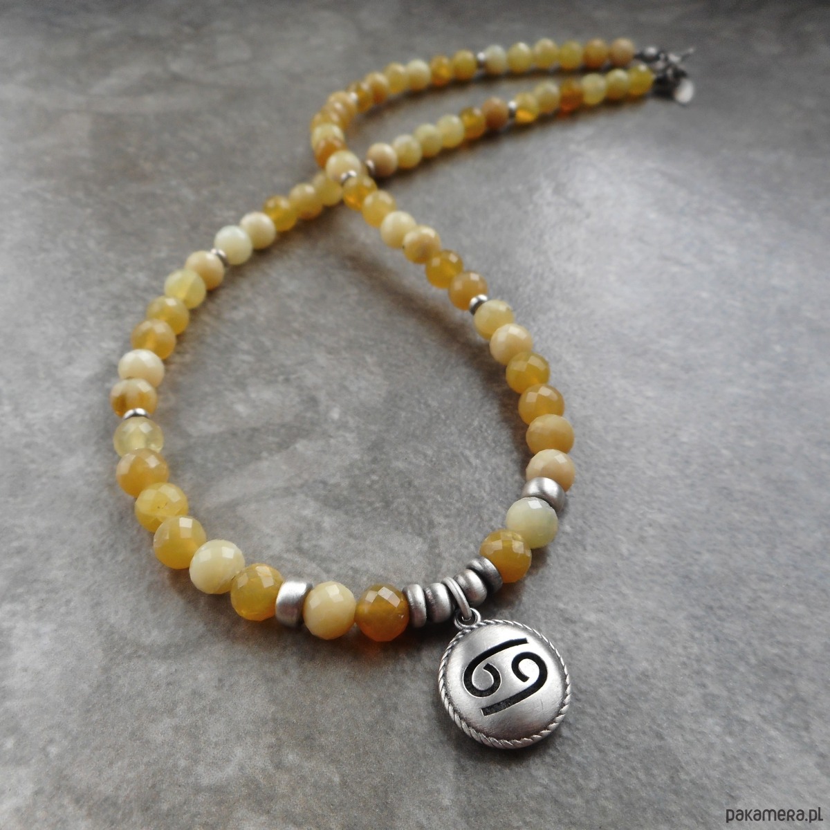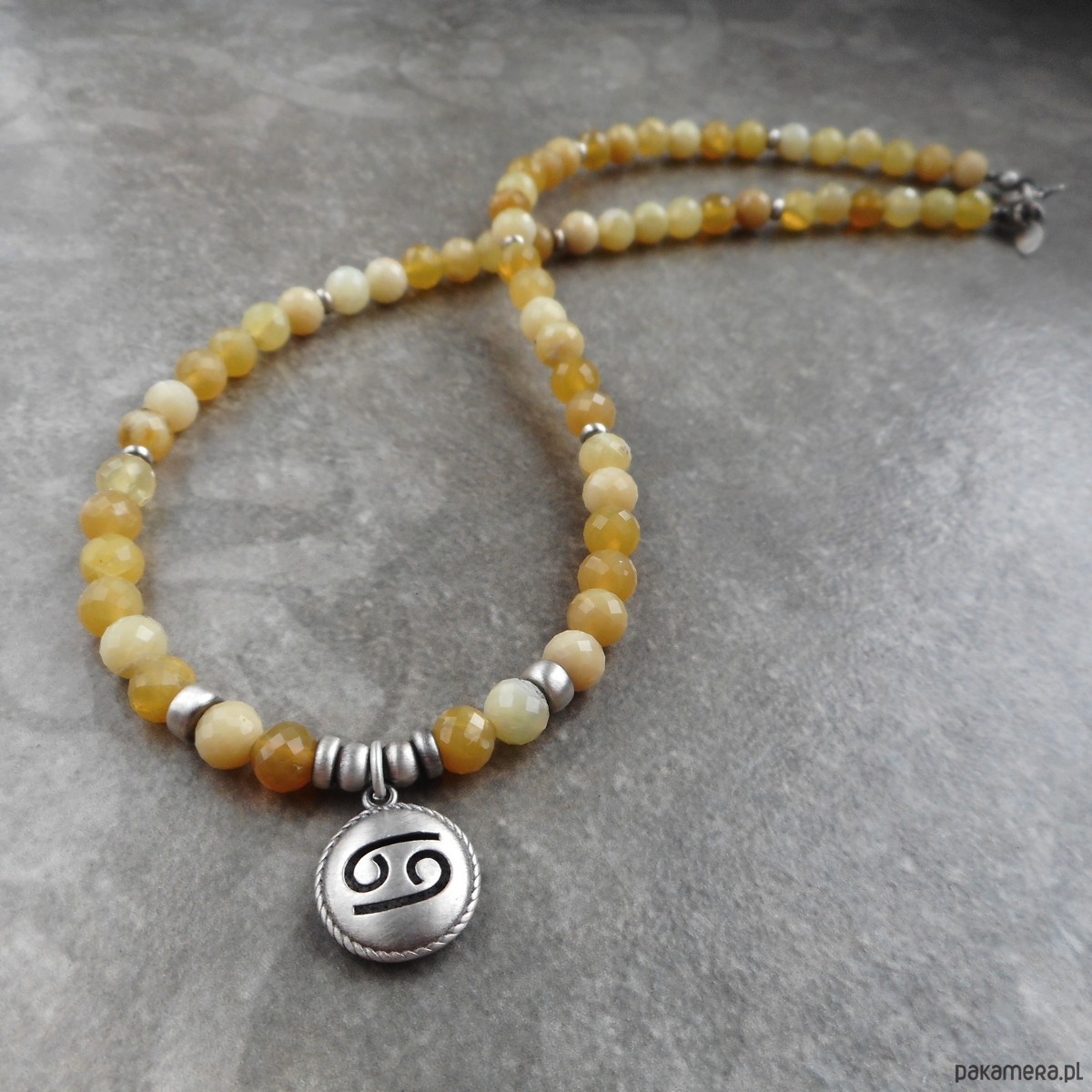 Naszyjnik wykonany ze szlachetnego srebra i kamieni naturalnych; dedykowany zodiakalnym rakom, z wypukłą zawieszką z wyciętym symbolem znaku raka; zawieszony na sznurze żółtych opali, które harmonizują również z tym znakiem.