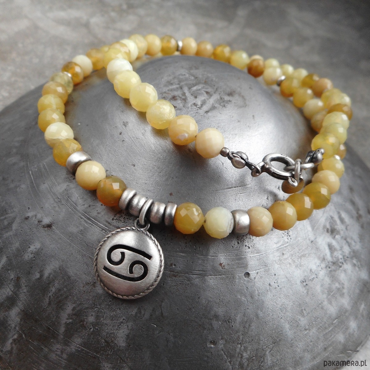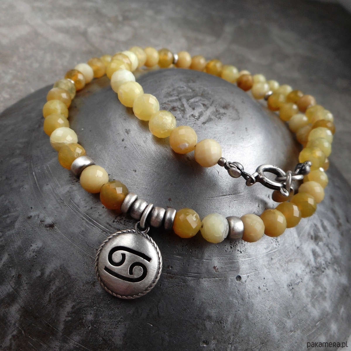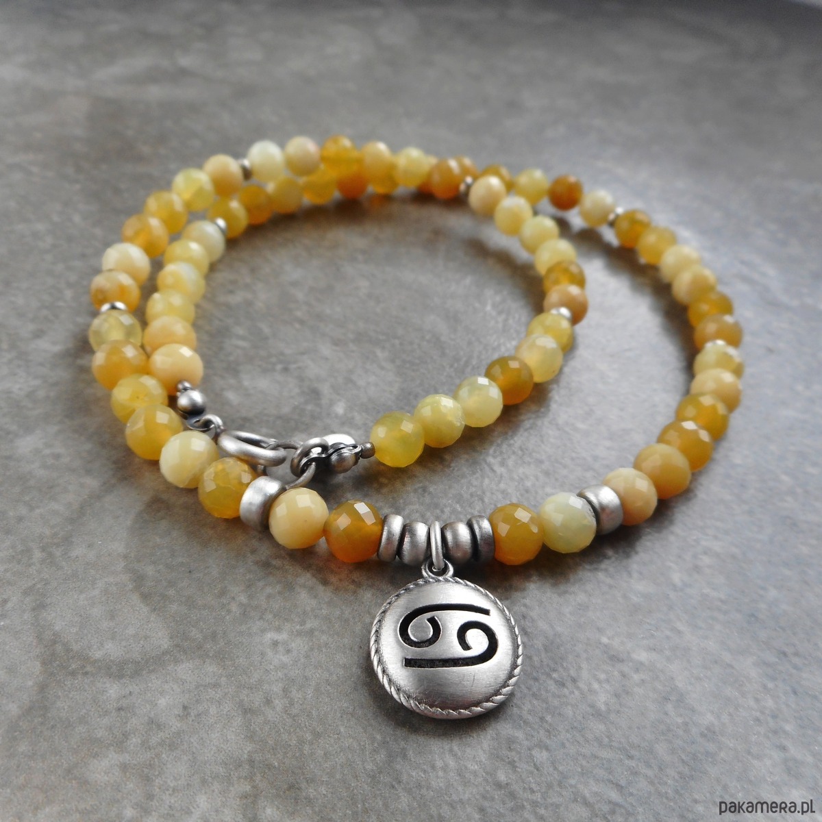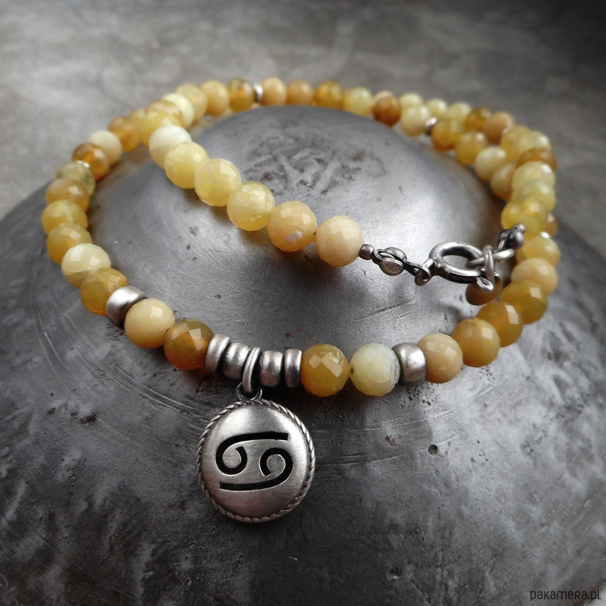 Naszyjnik wykonany ze szlachetnego srebra i kamieni naturalnych; dedykowany zodiakalnym rakom, z wypukłą zawieszką z wyciętym symbolem znaku raka; zawieszony na sznurze żółtych opali, które harmonizują również z tym znakiem.