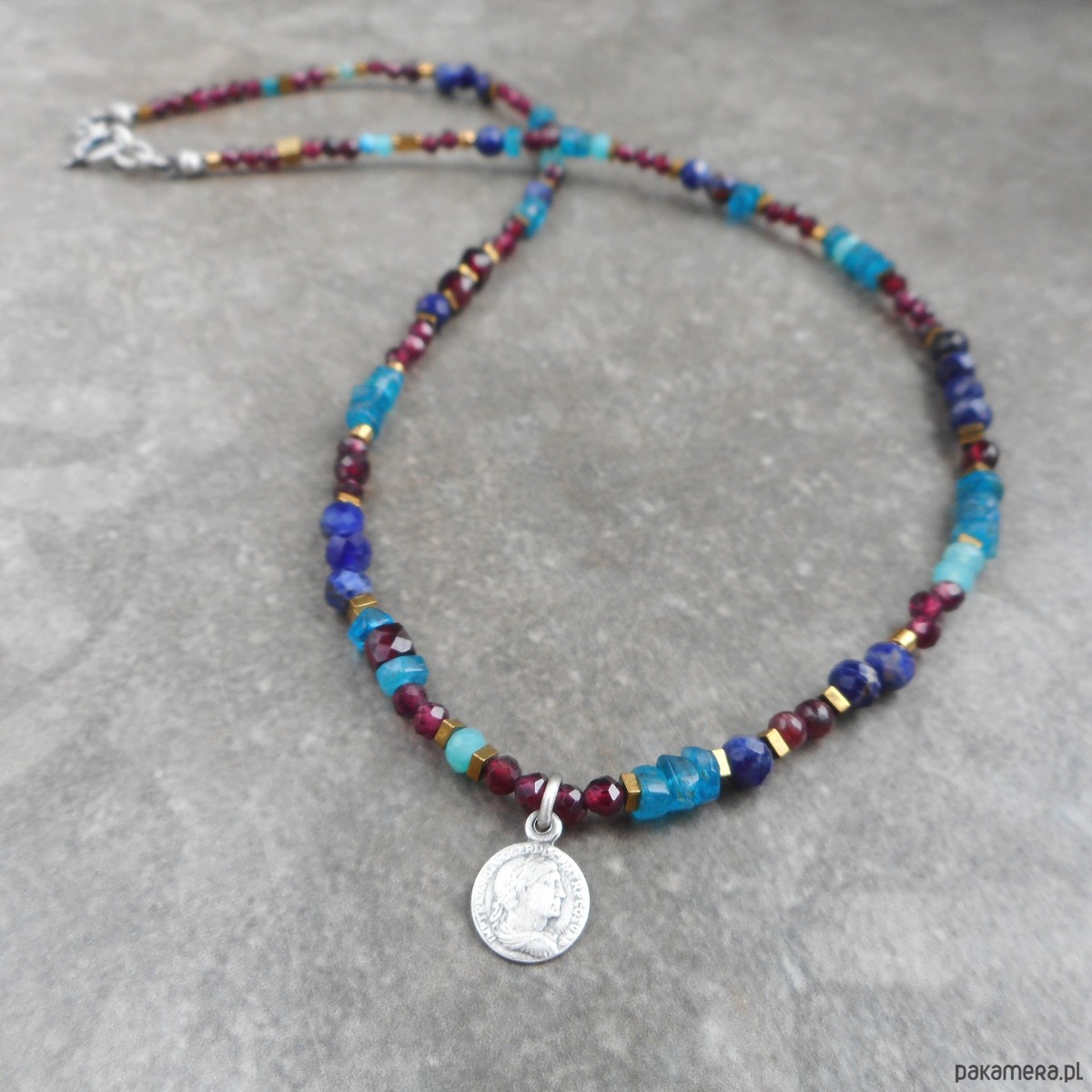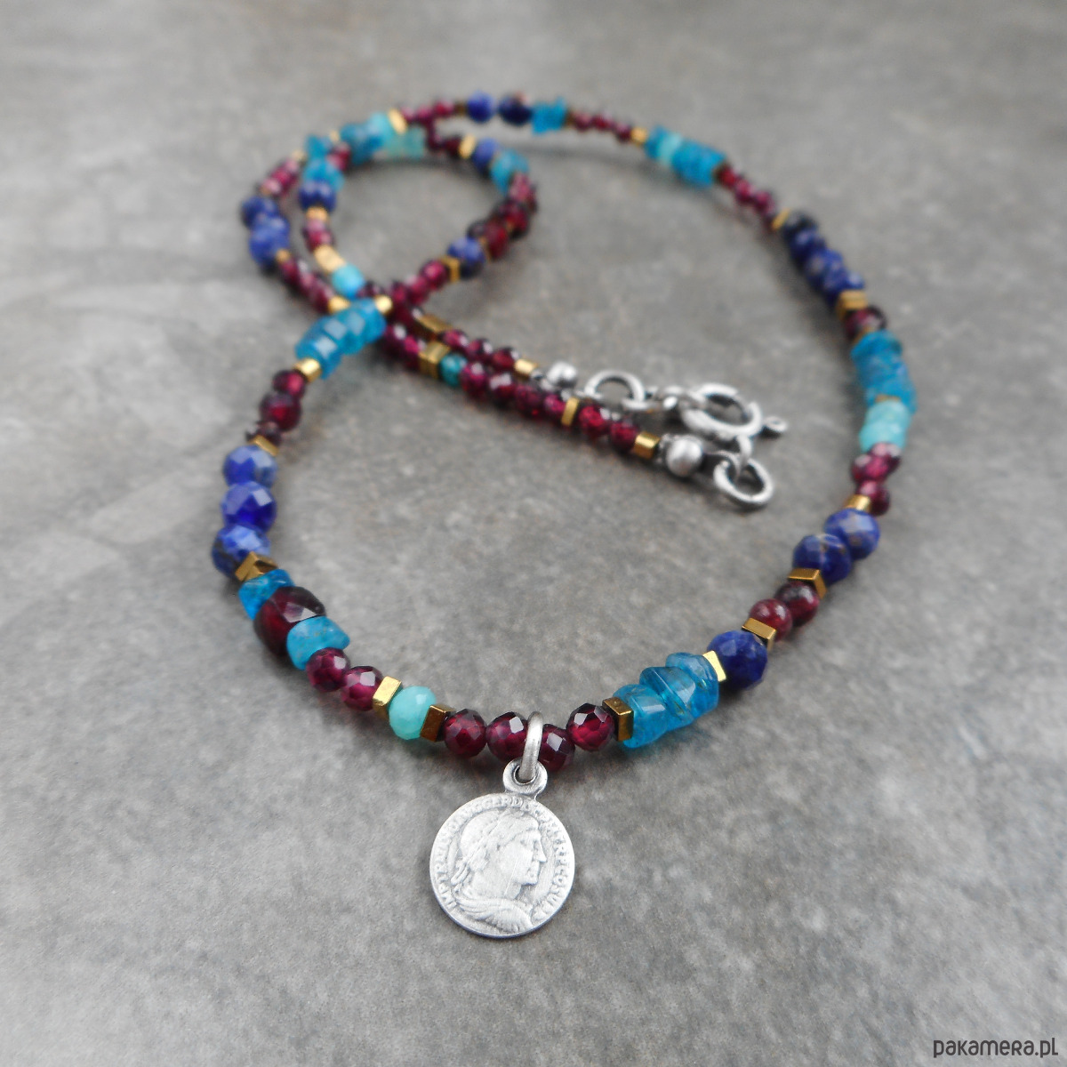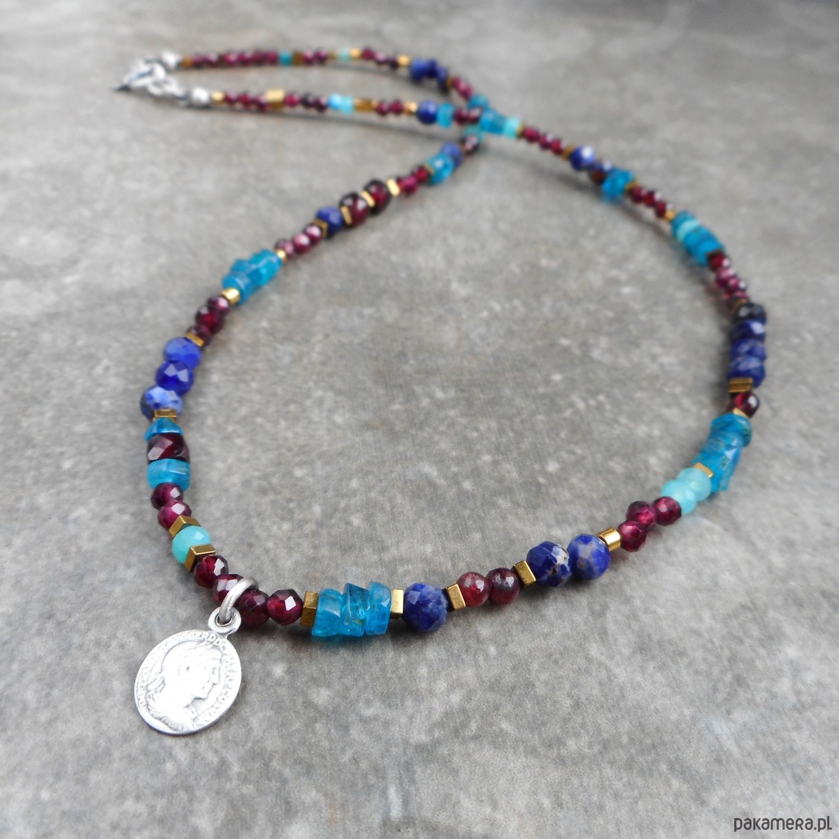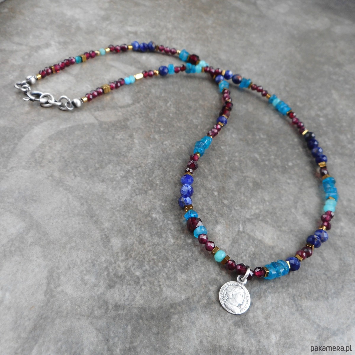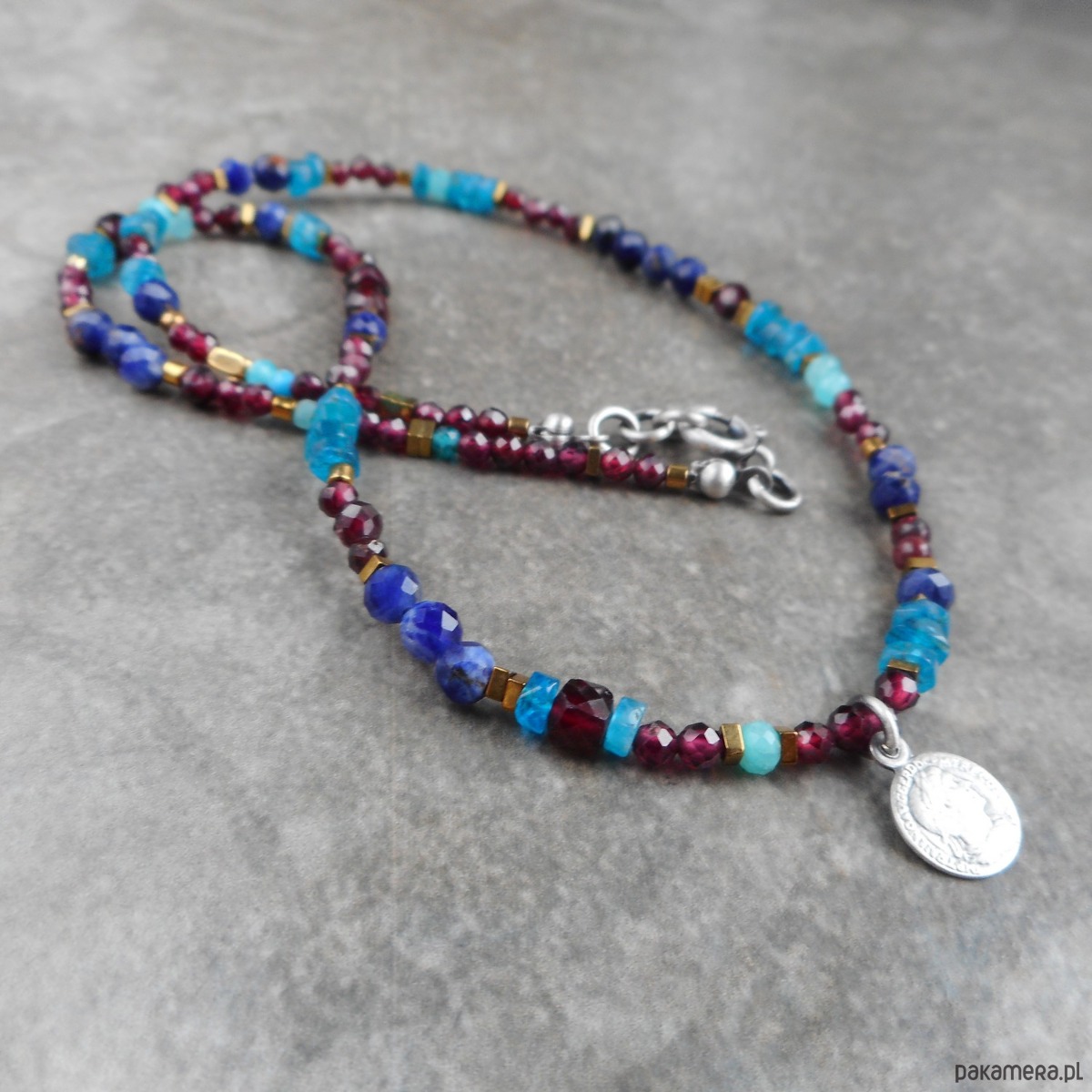 Piękny, krótki naszyjnik wykonany ze szlachetnego srebra i kamieni naturalnych; elegancki, lśniący, z połyskującymi granatami i apatytem, z małą zawieszką w formie monety.