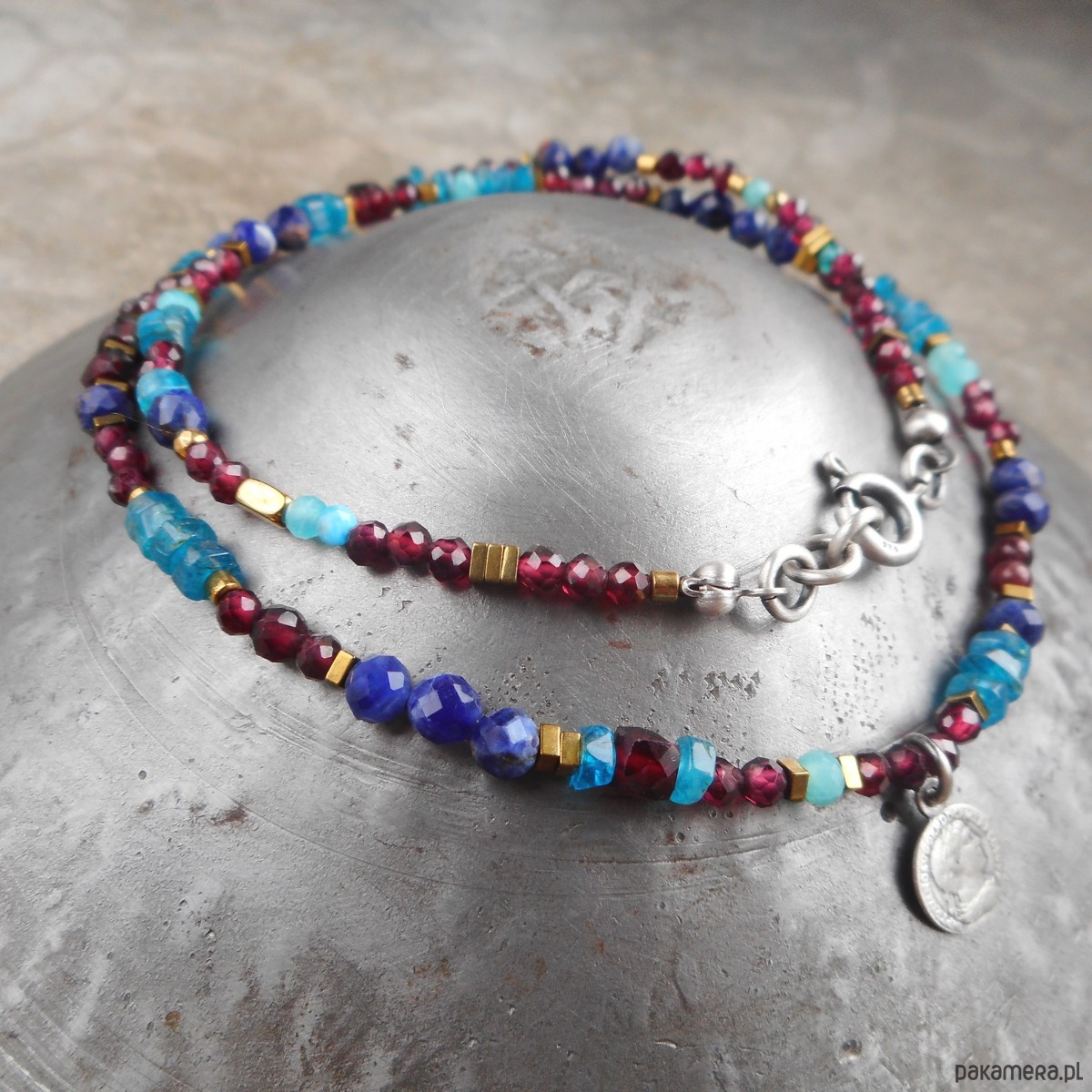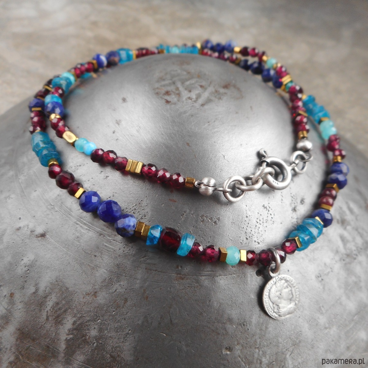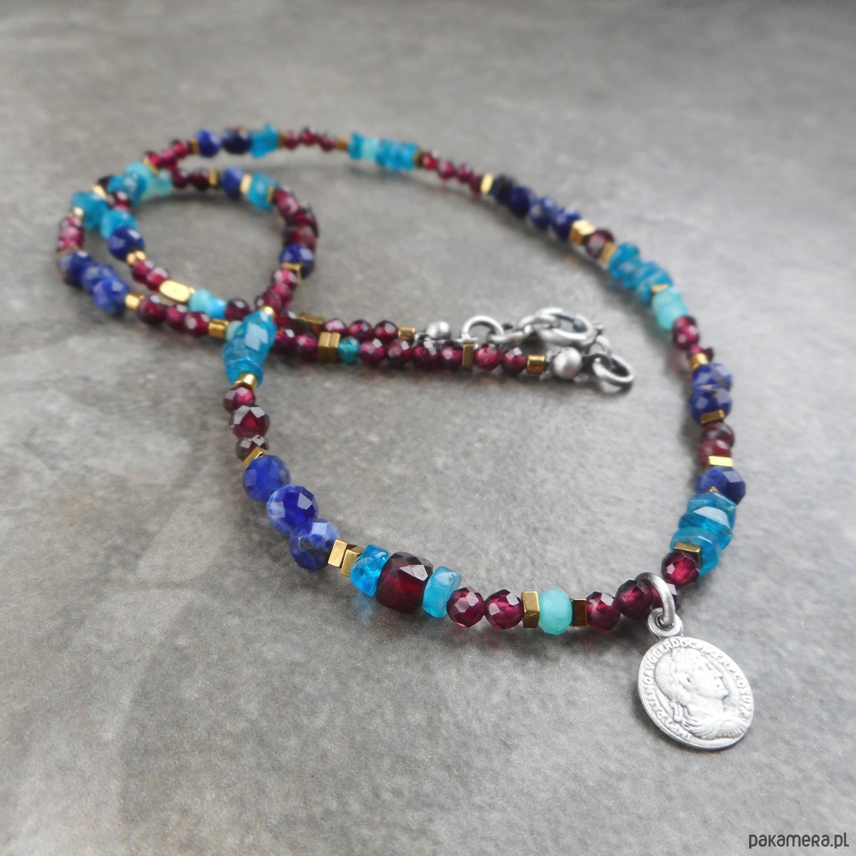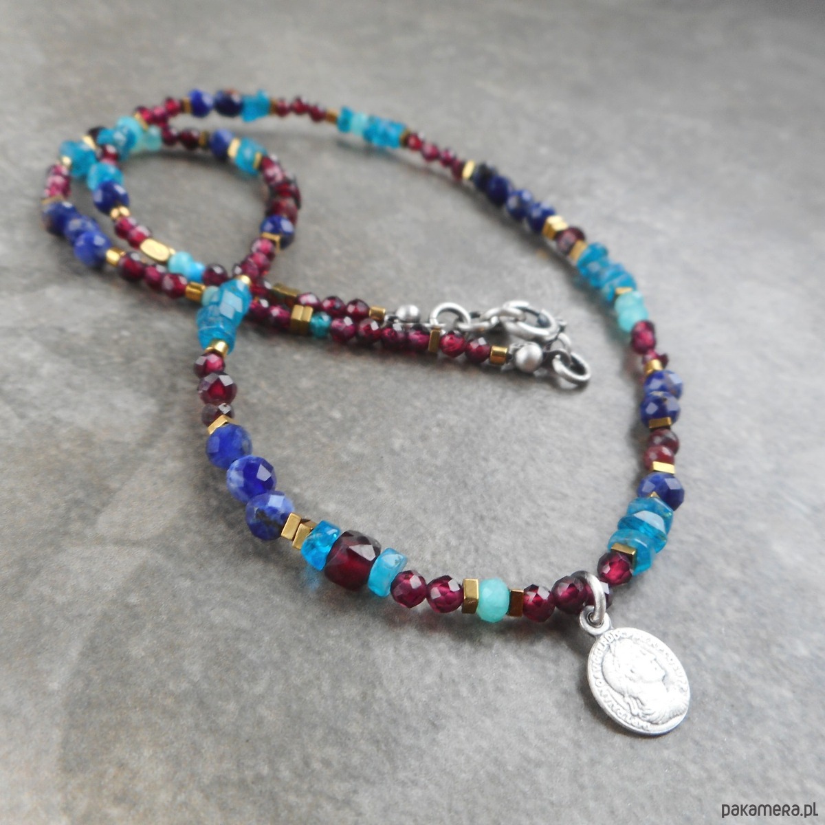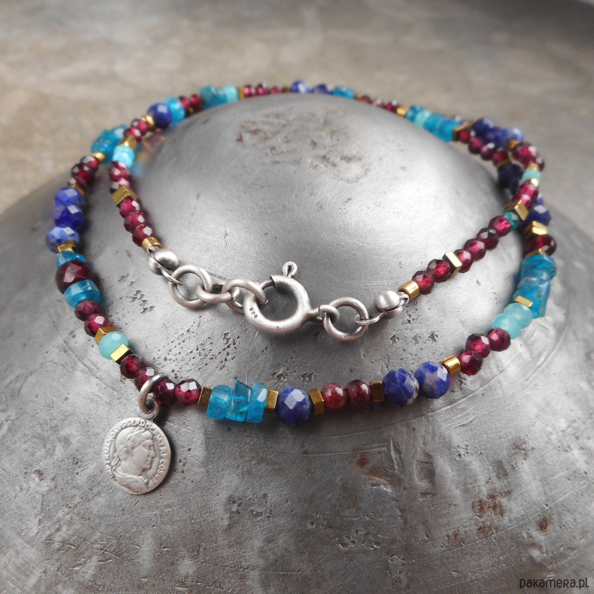 Piękny, krótki naszyjnik wykonany ze szlachetnego srebra i kamieni naturalnych; elegancki, lśniący, z połyskującymi granatami i apatytem, z małą zawieszką w formie monety.