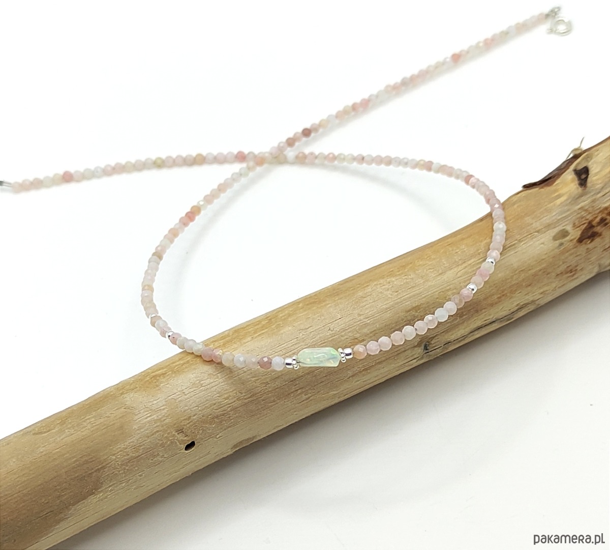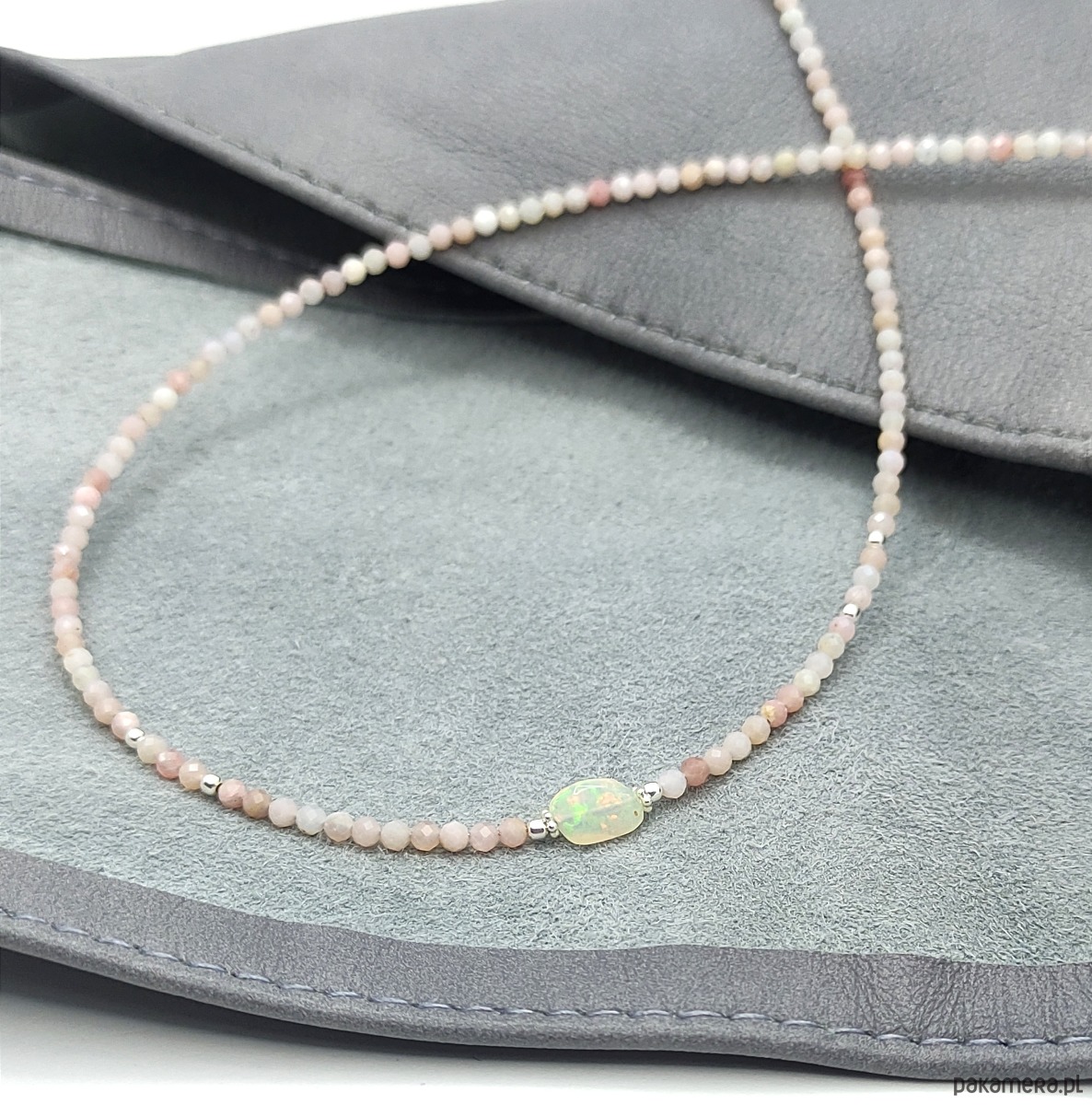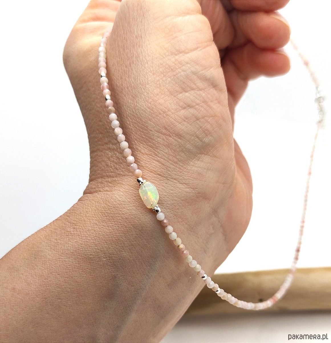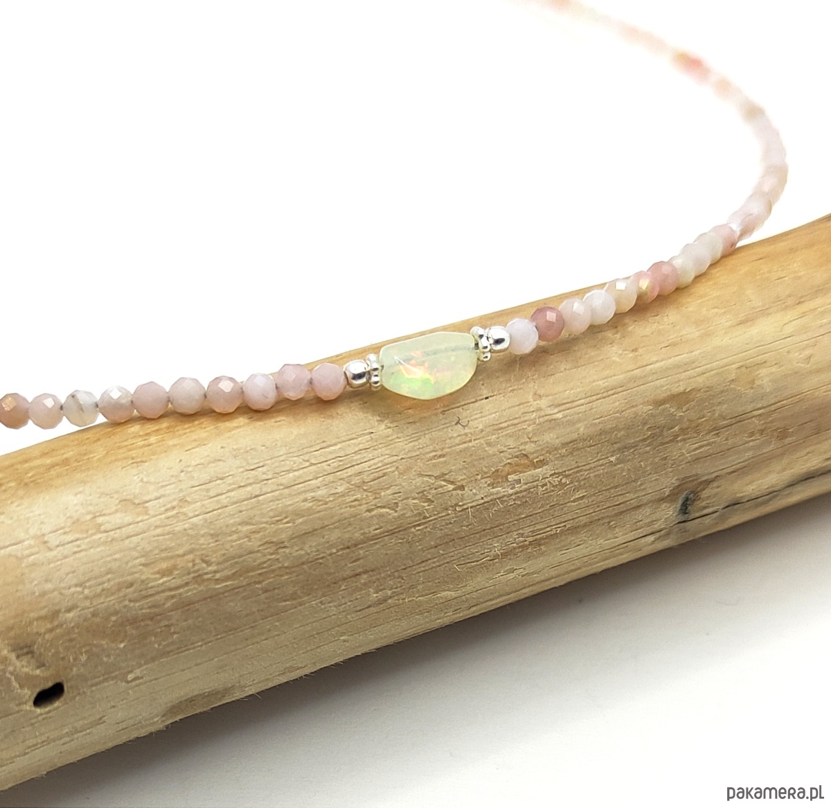 Delikalte róże, srebro i olśniewający opal etiopski - tak powstał delikatny, romantyczny naszyjnik. Fasetowane kuleczki opala peruwiańskiego delikatnie odbijają światło. Ułożony centralnie opal etiopski w zależności od kąta padania światła ukazuje różowe lub zielonkawe błyski. To jasny opal, więc nie tworzy dużych kontrastów. Naszyjnik będzie pięknym symbolem czułości - delikatny, dziewczęcy, pastelowy.
