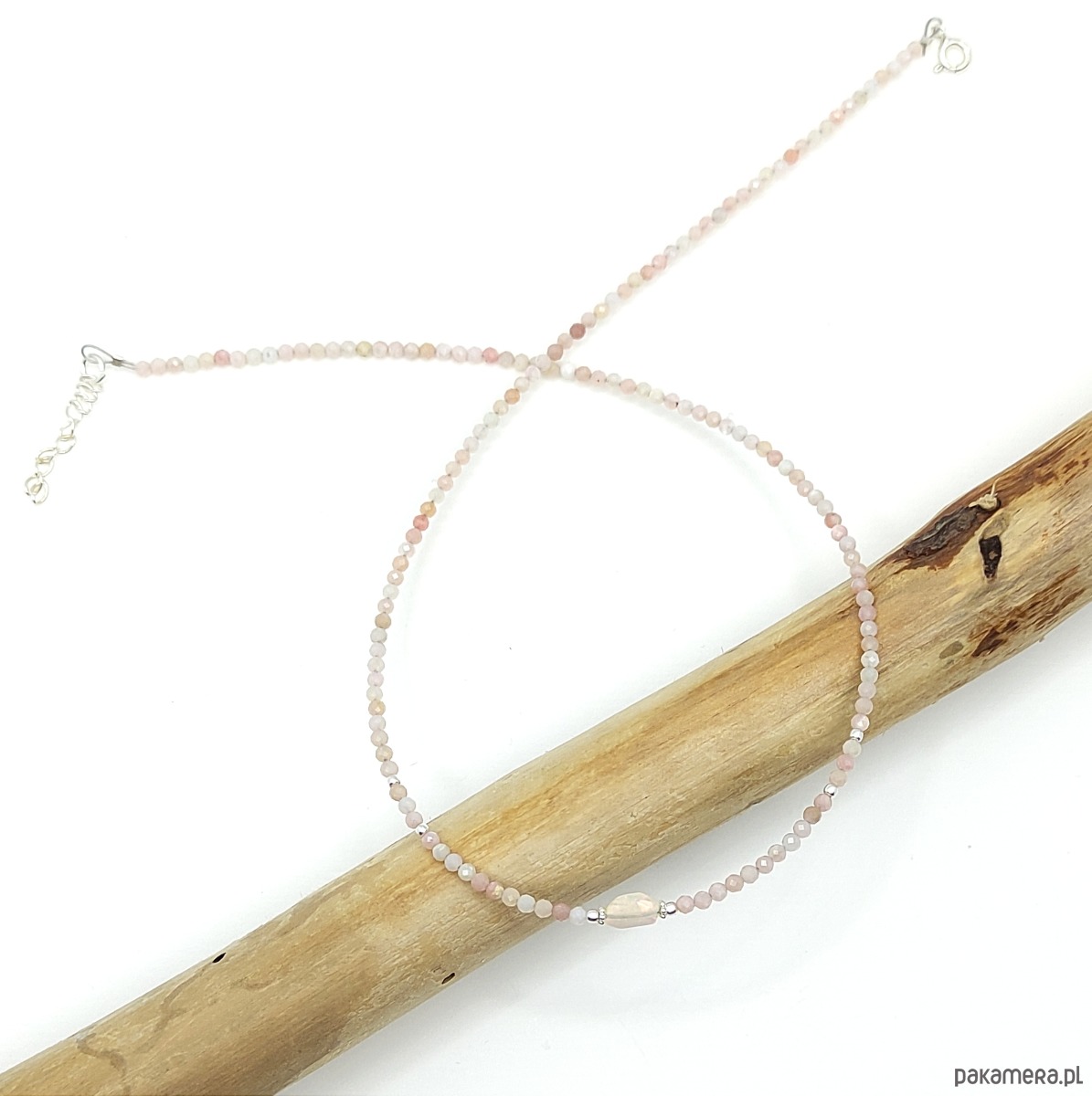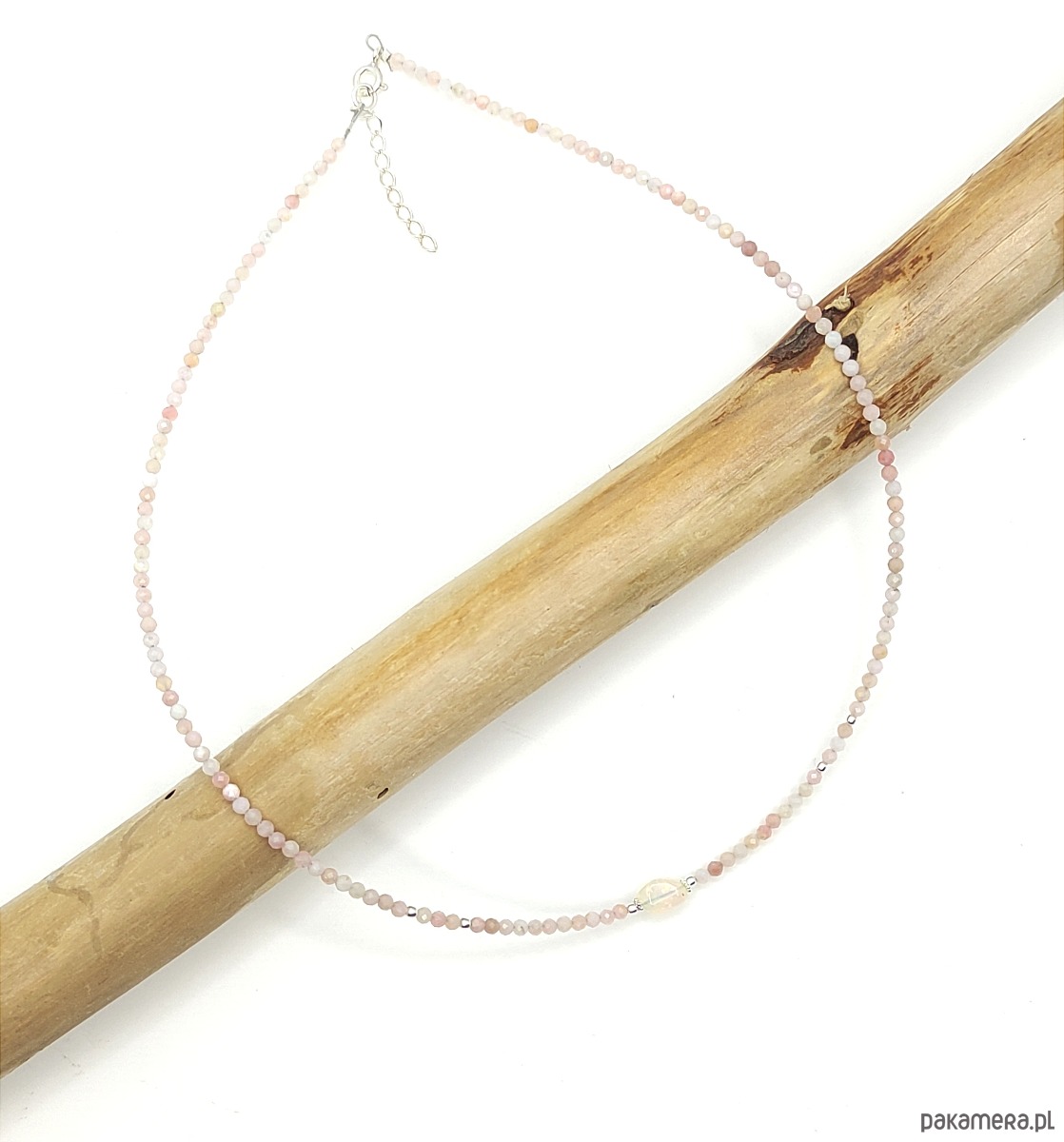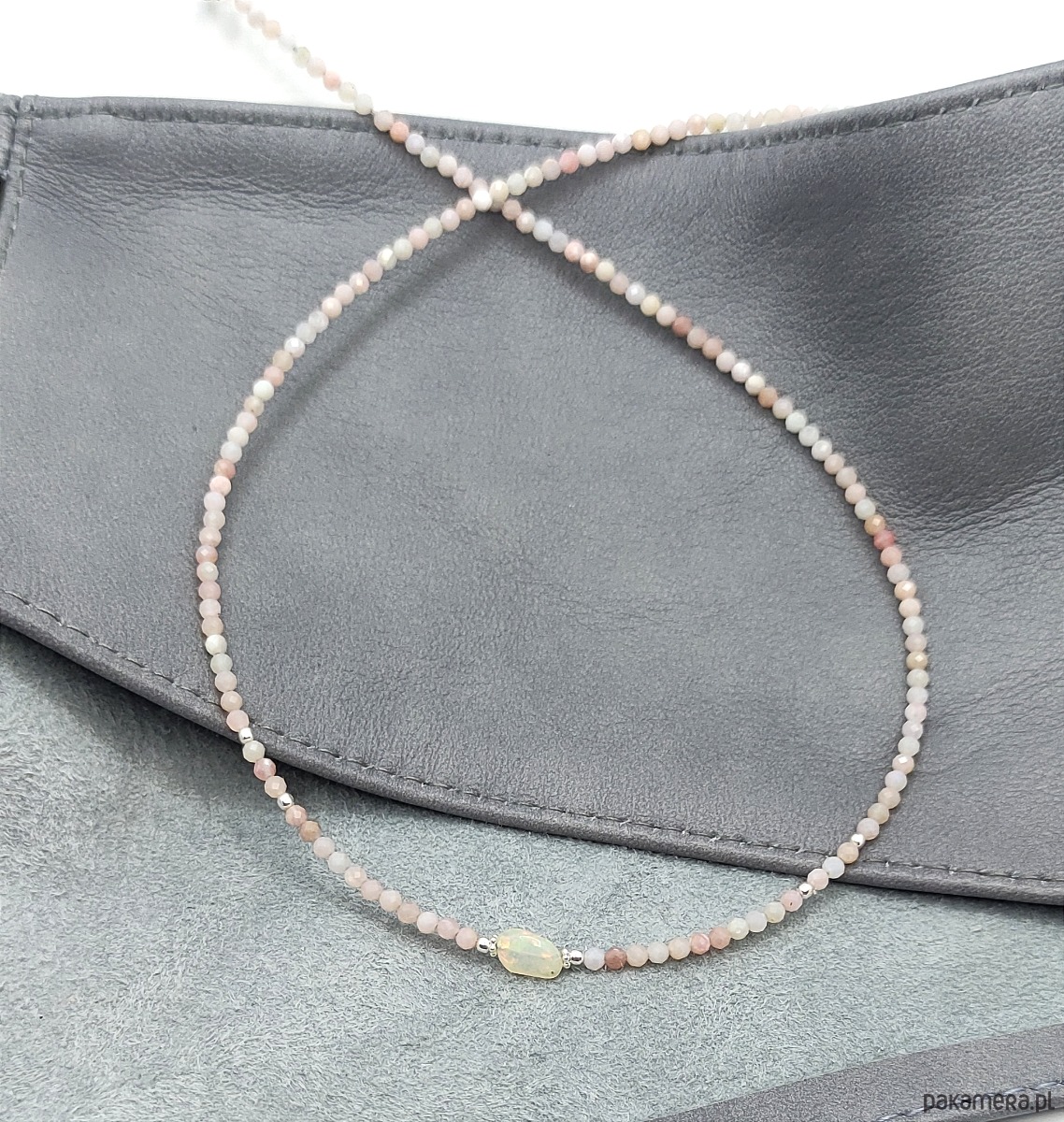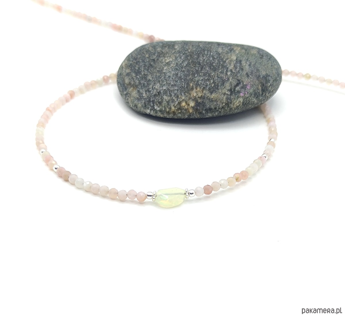 Delikalte róże, srebro i olśniewający opal etiopski - tak powstał delikatny, romantyczny naszyjnik. Fasetowane kuleczki opala peruwiańskiego delikatnie odbijają światło. Ułożony centralnie opal etiopski w zależności od kąta padania światła ukazuje różowe lub zielonkawe błyski. To jasny opal, więc nie tworzy dużych kontrastów. Naszyjnik będzie pięknym symbolem czułości - delikatny, dziewczęcy, pastelowy.