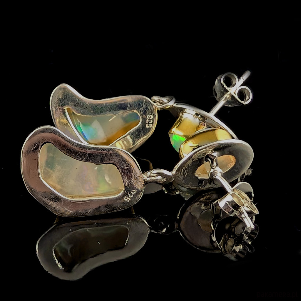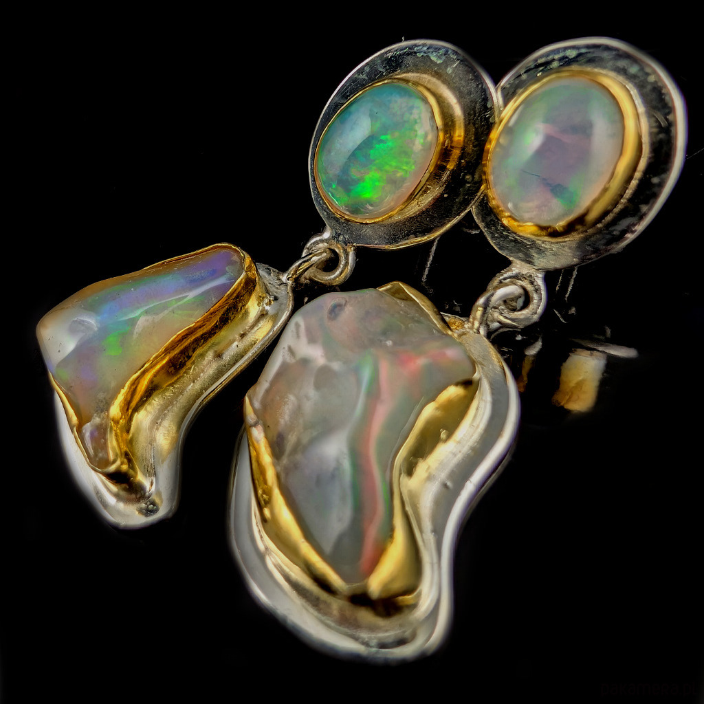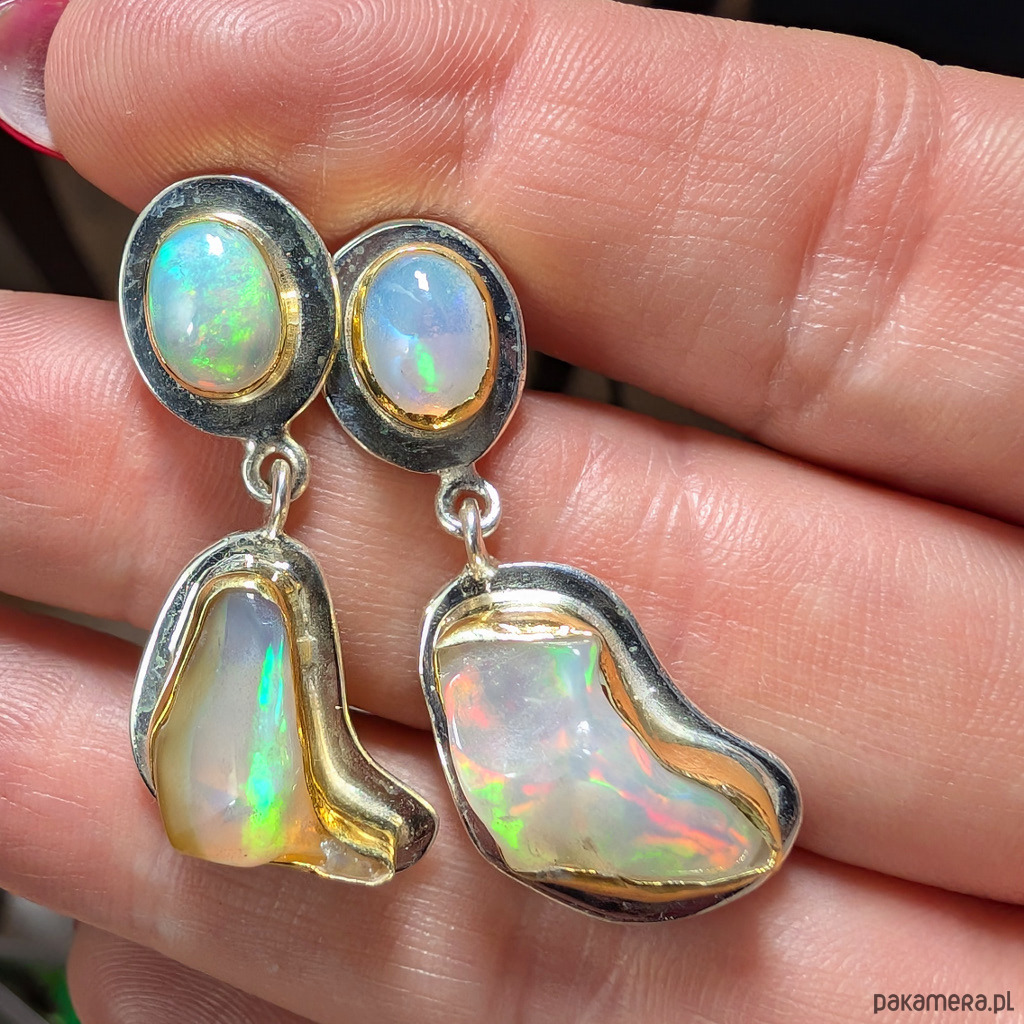 Barokowe sztyfty wykonane ze srebra 925 oraz przepięknych szlachetnych opali z Etiopii. Srebro w oprawie kamieni zostąło pozłocone, są to delikatne powłoki, które z czasem mogą się ścierać. Wymiary oprawy górnego elementu 13 x 9 mm. Dolnego 18 x 12mm. Waga jednego kolczyka 4,39 grama. Długość 35 mm. Bardzo oryginalne.Wykonane przez dostawcę kamieni, Kolczyki zostaną zapakowane w ozdobne pudełeczko.