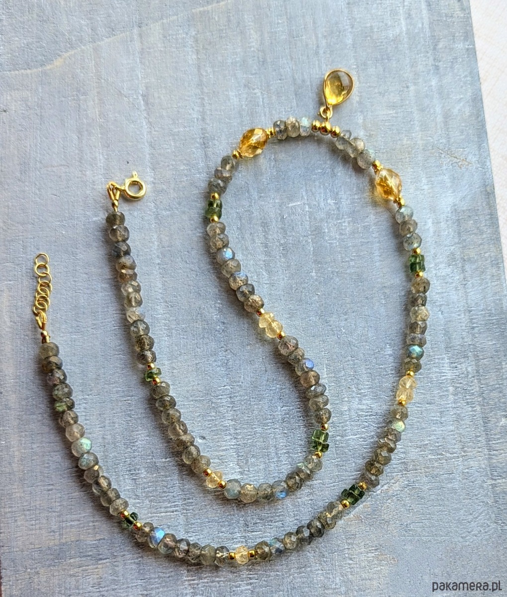 Naszyjnik z pięknie opalizującego labradorytu, słonecznego cytrynu i kilku akcentów zielonego apatytu. Wykończony pozłacanym srebrem i śliczną zawieszką ze szlifowanej kropli cytrynu. Naszyjnik emanuje delikatnym światłem i spokojem. Jest bardzo podatny na światło, uwodzi zmiennymi blaskami. Na zdjęciu tylko częściowo uchwycono jego energetyczny potencjał.