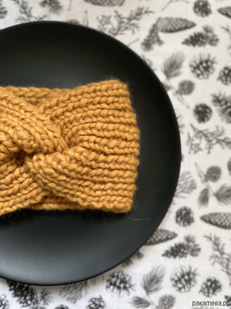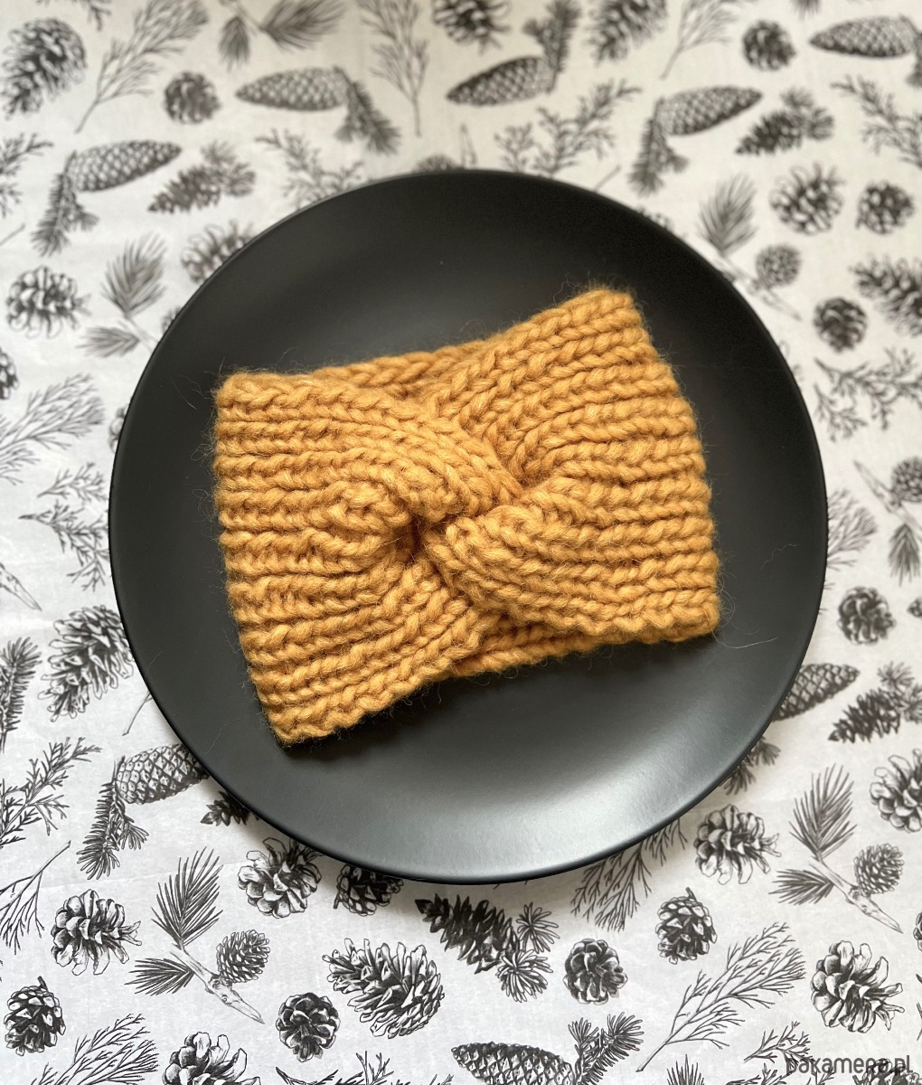 Musztardowa opaska wykonana z naturalnej mieszkanki 50% alpaki, 17% wełny merino i 33% bawełny.