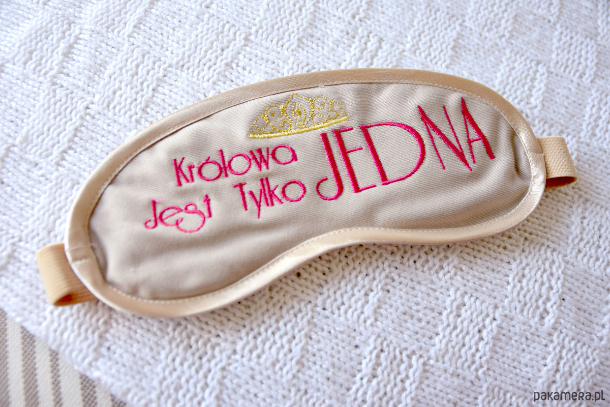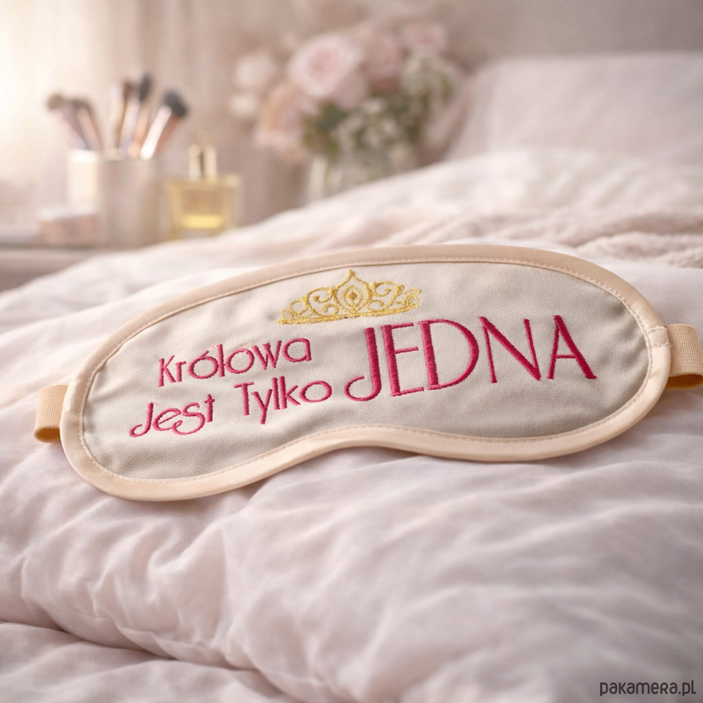 Maska posiada zabawny, wysokiej jakości haft komputerowy z napisem „Królowa jest tylko JEDNA” oraz złotą koroną. Elegancji dodaje jej staranne wykończenie satynową lamówką. Dzięki elastycznej gumce opaska idealnie dopasowuje się do głowy, zapewniając wygodę przez całą noc.