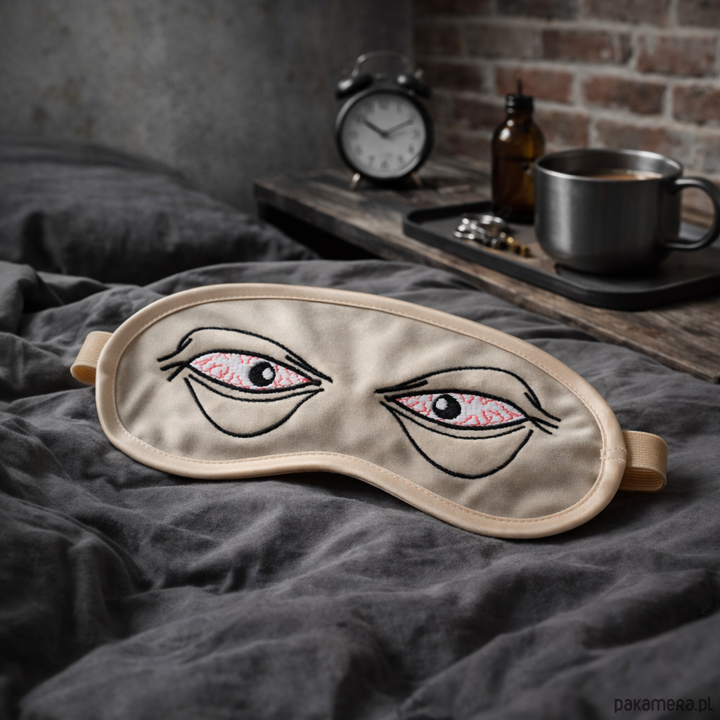 Maska wyróżnia się zabawnym, wysokiej jakości haftem komputerowym przedstawiającym zmęczone, przekrwione oczy – idealnie oddaje stan każdego, kto marzy o jeszcze jednej godzinie snu. Całość została elegancko obszyta satynową lamówką, która chroni przed podrażnieniami. Elastyczna gumka gwarantuje perfekcyjne dopasowanie do głowy bez zbędnego ucisku.