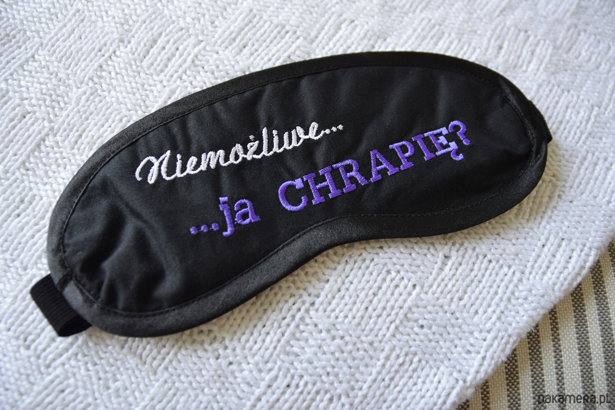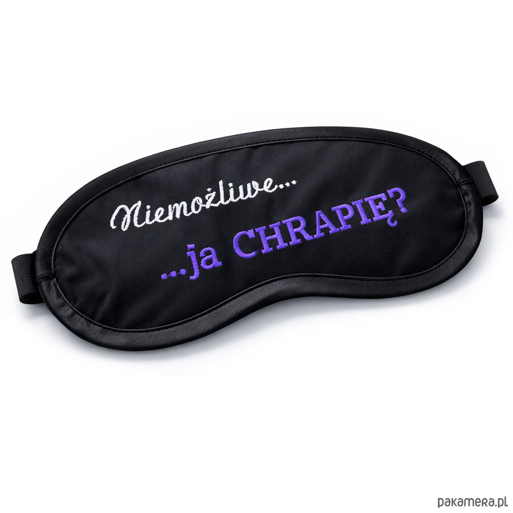 Maska posiada zabawny, wysokiej jakości haft komputerowy w kolorach białym i fioletowym o treści: „Niemożliwe... ja CHRAPIĘ?”. Całość została starannie obszyta czarną satynową lamówką, która chroni przed podrażnieniami i dodaje produktowi klasy. Elastyczna gumka sprawia, że opaska idealnie dopasowuje się do głowy, nie uciskając skroni.