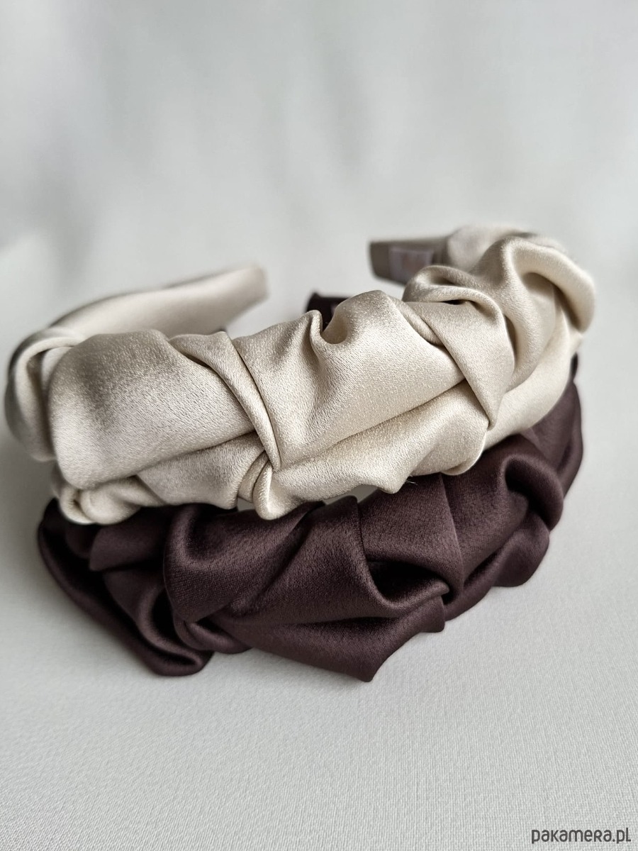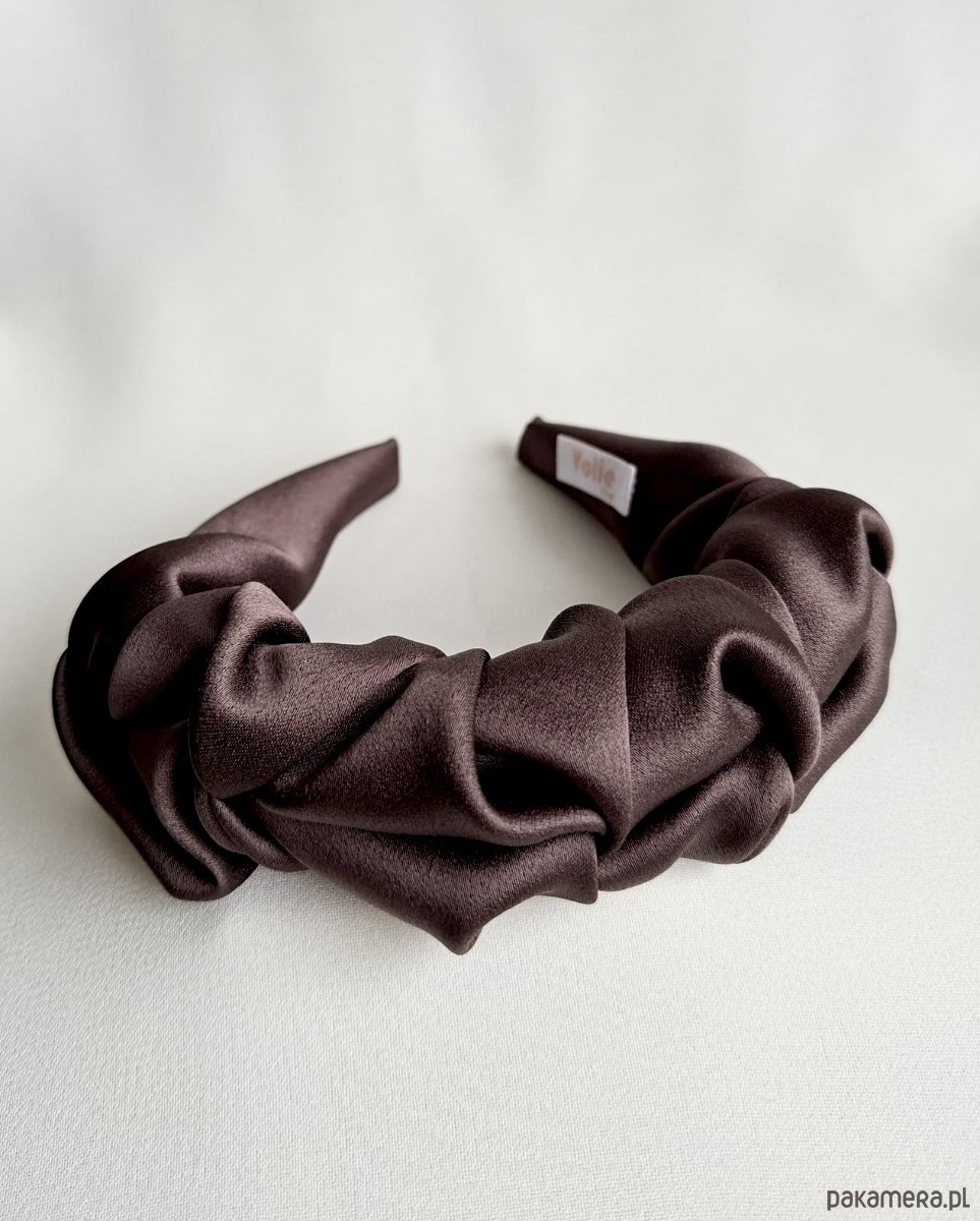 Opaska Chocolate Mousse to elegancki dodatek w głębokim, czekoladowym odcieniu brązu. Wykonana z miękkiej, subtelnie połyskującej tkaniny, pięknie układa się na głowie i zapewnia komfort noszenia przez cały dzień.