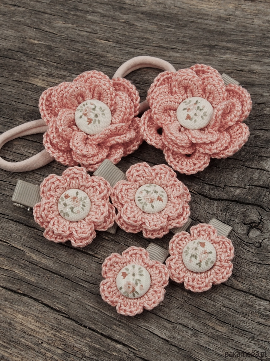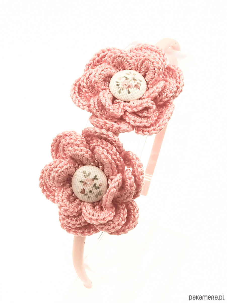 Kwiatki wykonane na szydełku z bawełnianej włóczki , ozdobione ręcznie robionymi guzikami.