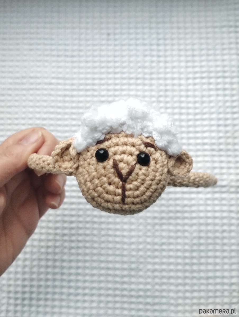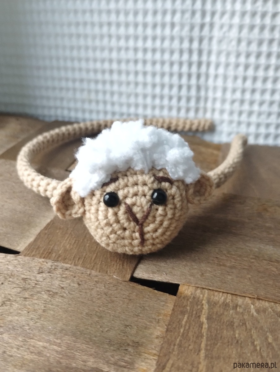Wnętrze opaski stanowi metalowa baza, która została przeze mnie pokryta włóczkowym tunelem. Dzięki temu nie będzie drapać, będzie delikatnie przylegać do włosów. Ozdobę opaski stanowi przyszyta głowa owieczki