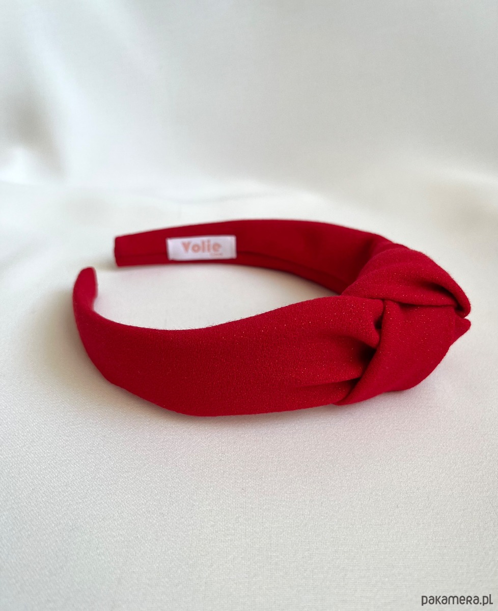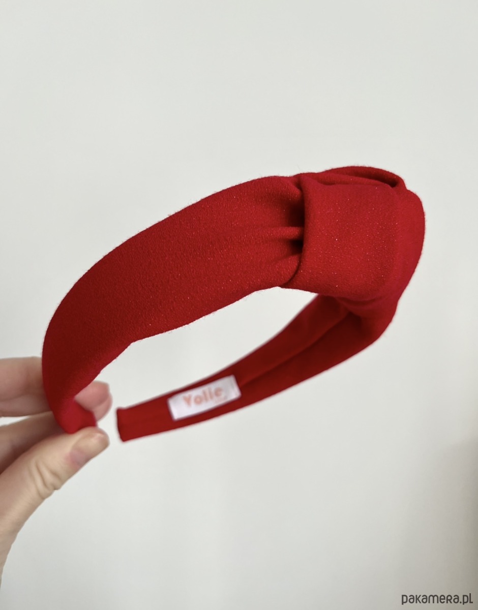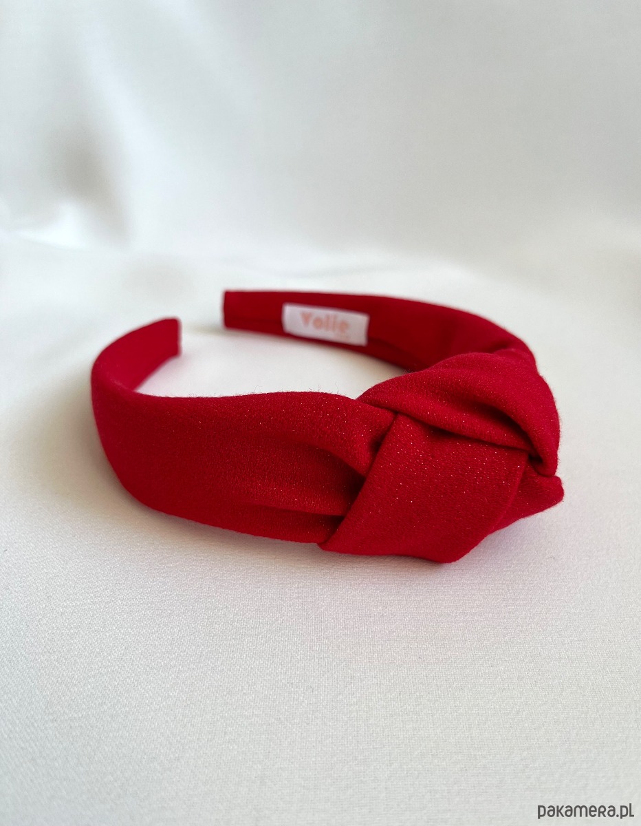 Opaska została wykonana z miękkiej tkaniny w soczystym odcieniu czerwieni z delikatnie mieniącymi się drobinkami, które przy ruchu światła tworzą subtelny, elegancki blask.