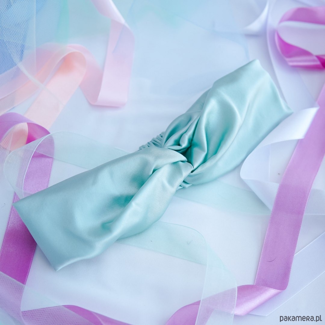 Opaska została uszyta z satyny jedwabnej w kolorze letniej mięty. Model tej opaski stworzony jest z dwóch kawałków jedwabiu, które pośrodku tworzą supełek. W trakcie noszenia powinien on układać się na czubku głowy. Opaska posiada gumkę, która rozciąga się dopasowując do obwodu głowy. Nie ściska włosów i nie odgniata ich. Materiał nie ślizga się po włosach, sprawdzi się zarówno na prostych, jak i kręconych włosach.