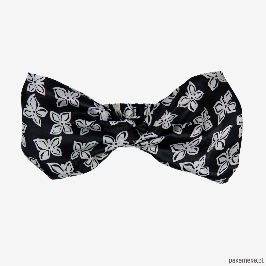 Na jedwabiu widać motyw białych kwiatów. Model tej opaski stworzony jest z dwóch kawałków jedwabiu, które pośrodku tworzą supełek. W trakcie noszenia powinien on układać się na czubku głowy. Opaska posiada gumkę, która rozciąga się dopasowując do obwodu głowy. Nie ściska włosów i nie odgniata ich. Materiał nie ślizga się po włosach, sprawdzi się zarówno na prostych, jak i kręconych włosach.