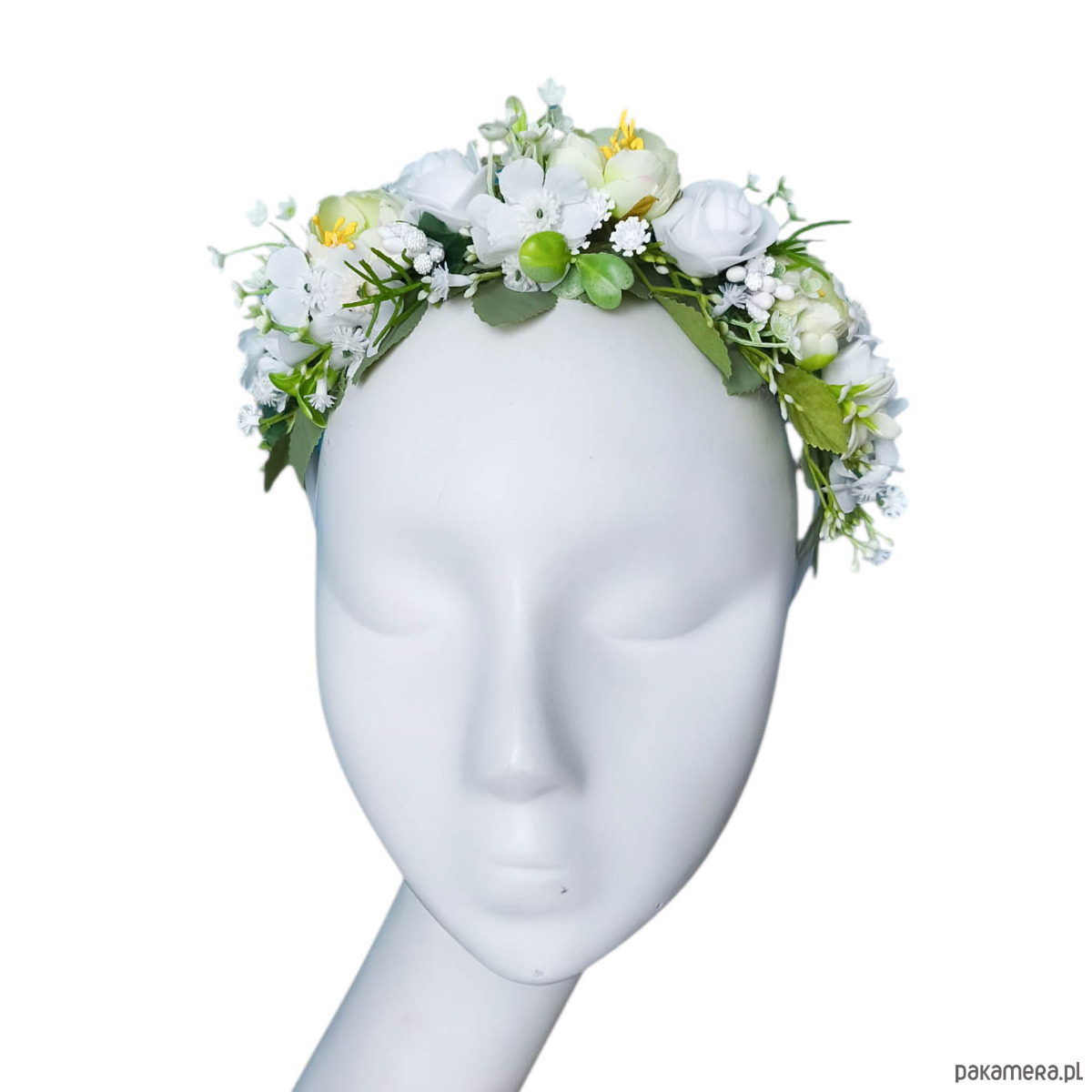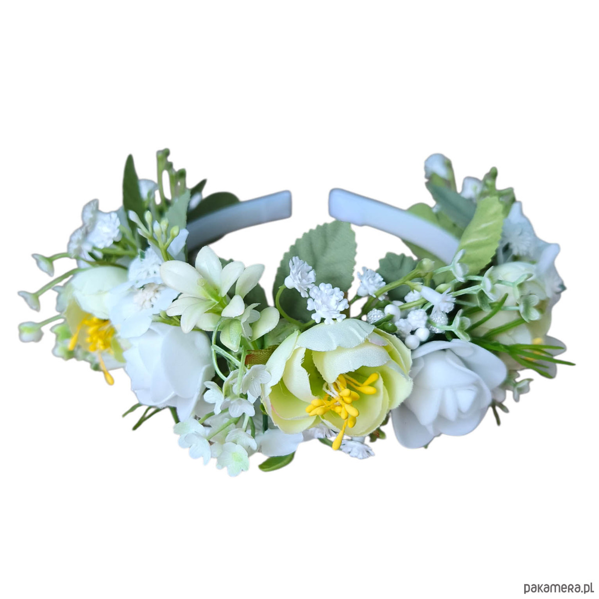 Opaska komunijna lub ślubna, rozmiar uniwersalny dla dziecka i osoby dorosłej. Opaska wykonana z wysokiej jakości sztucznych kwiatów, które do złudzenia przypominają żywe kwiaty. Opaska w formie korony jest świetną alternatywą dla wianka.