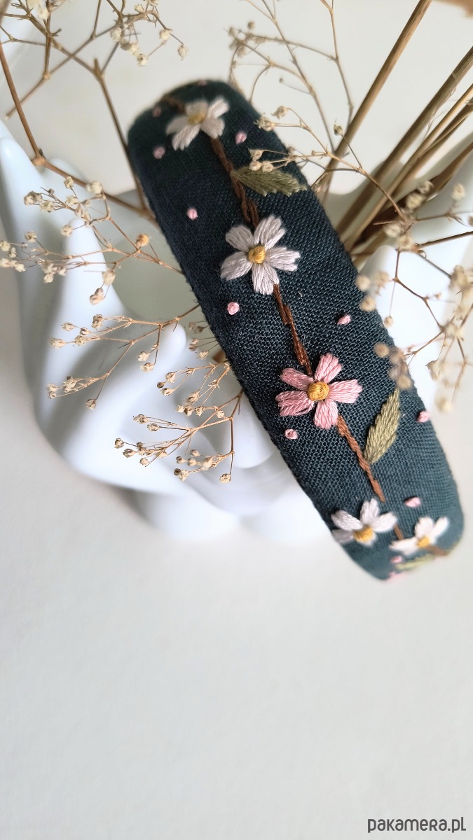 Delikatne wzory haftu dodają charakteru i sprawiają, że opaska świetnie komponuje się z codziennymi oraz eleganckimi stylizacjami.