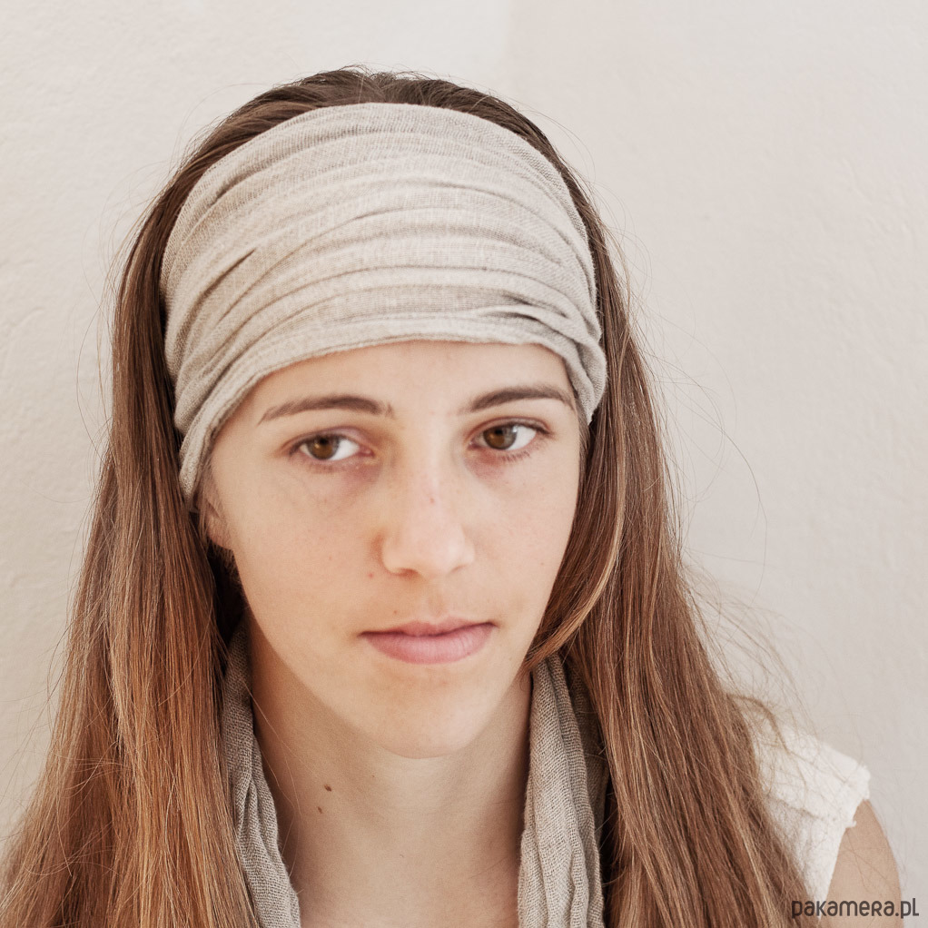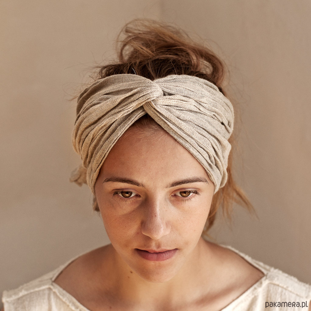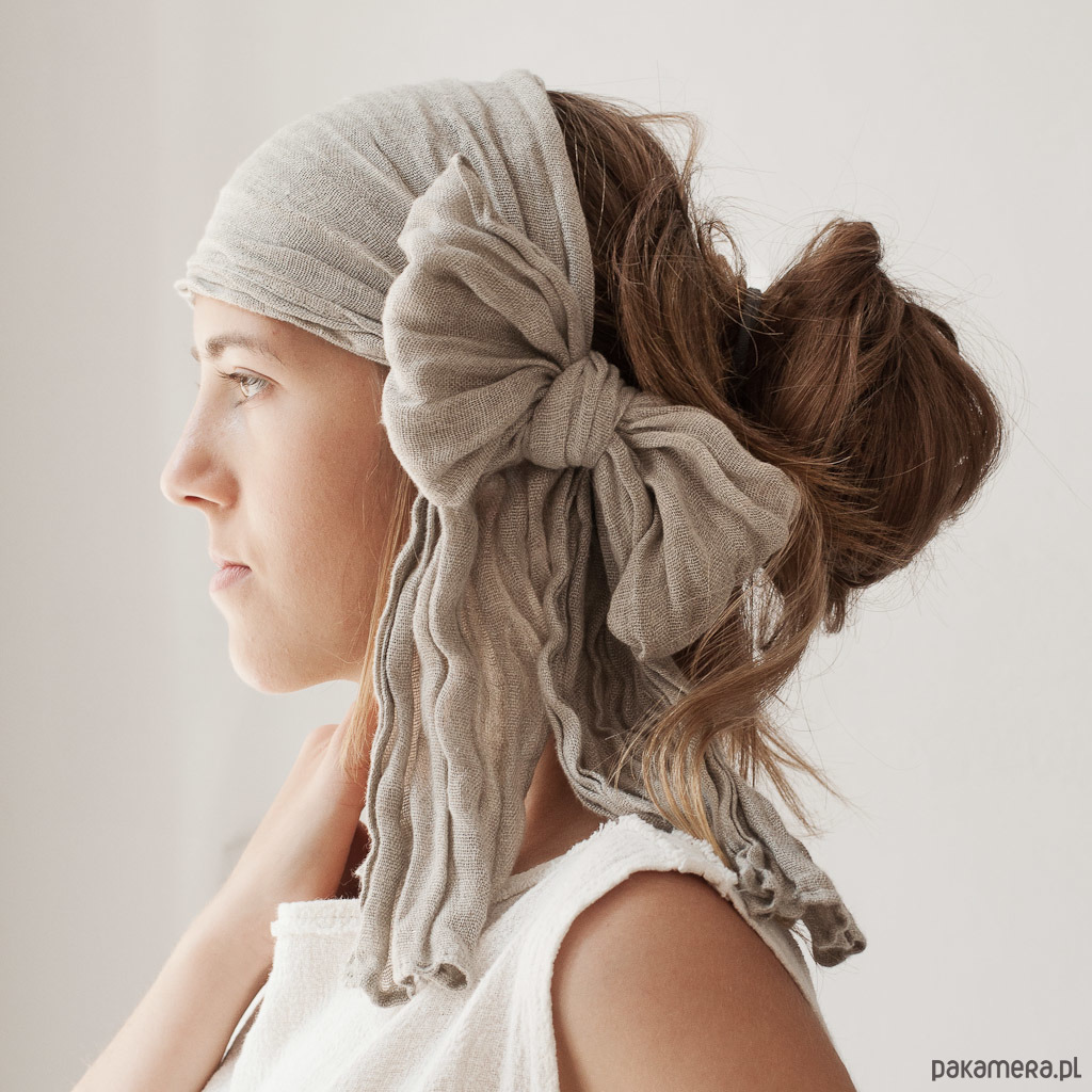 Opaska lniana, turban lniany, mini-szal wykonana jest z cieniutkiego, zmiękczanego, kreszowanego lnu w kolorze naturalnym.