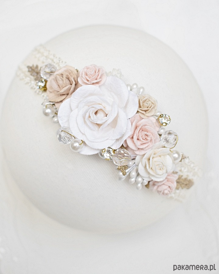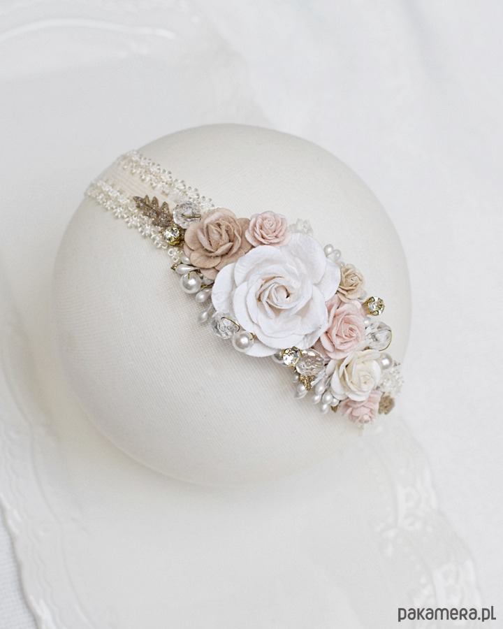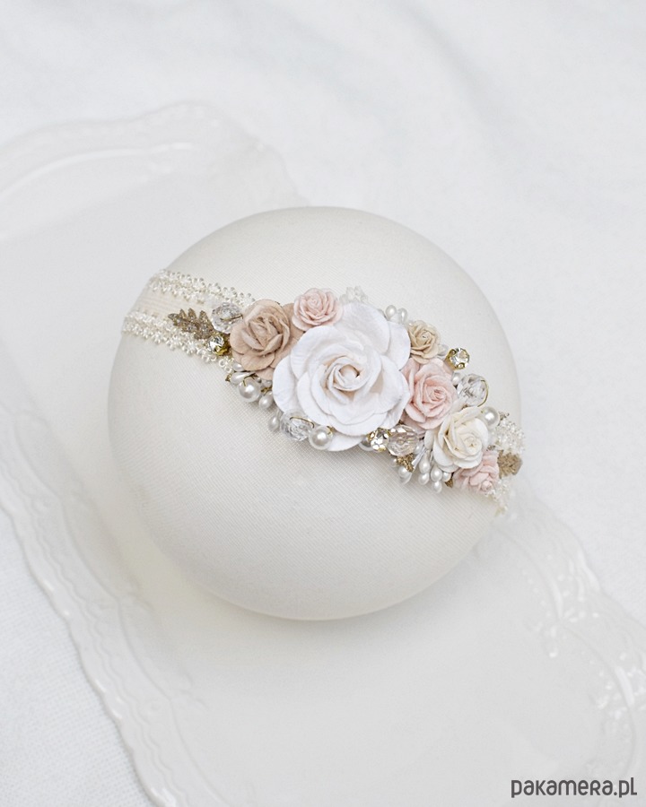 Delikatny wianuszek z kwiatami dla dziewczynki, niemowlaka w kremowej bieli beżu, różu oraz złocie.