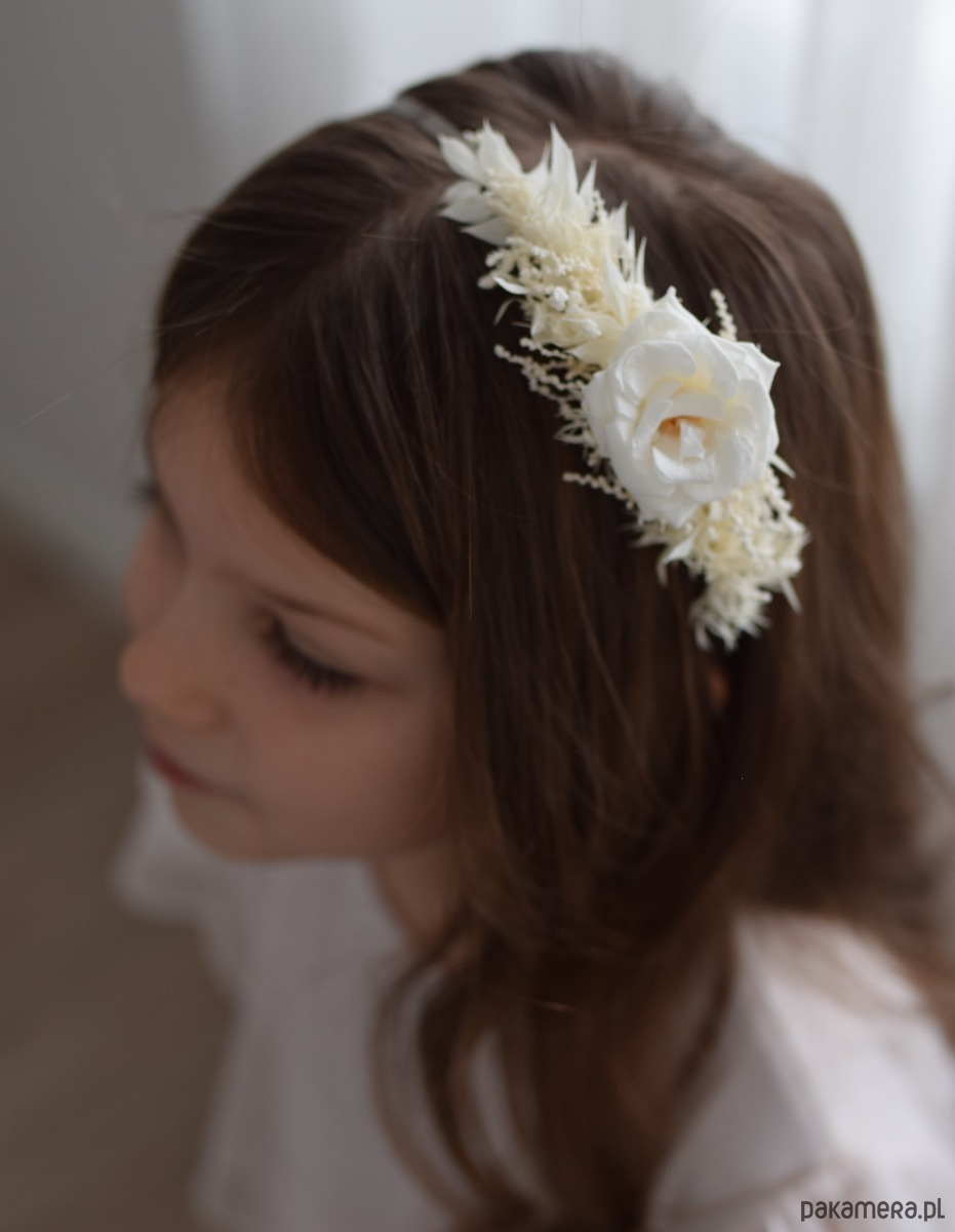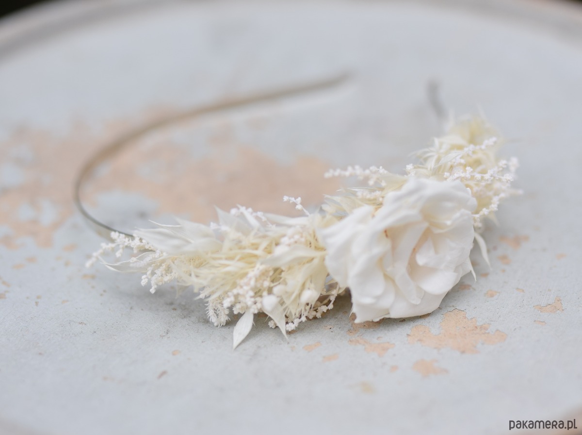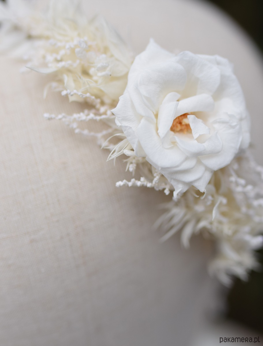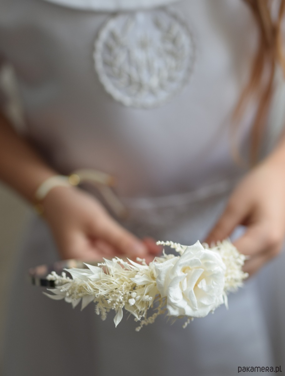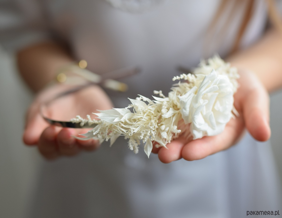 Opaska na głowę z białych stabilizowanych i suszonych kwiatów