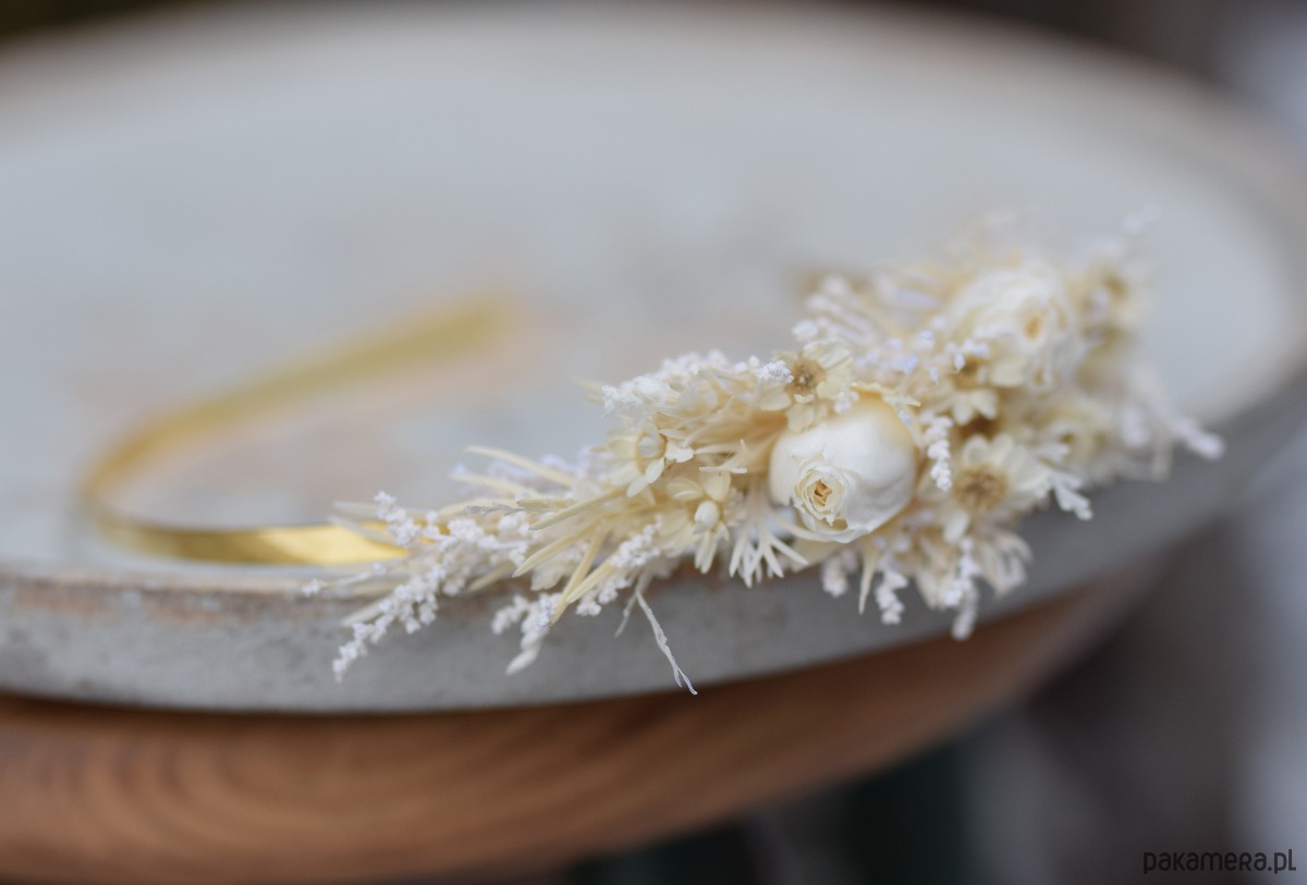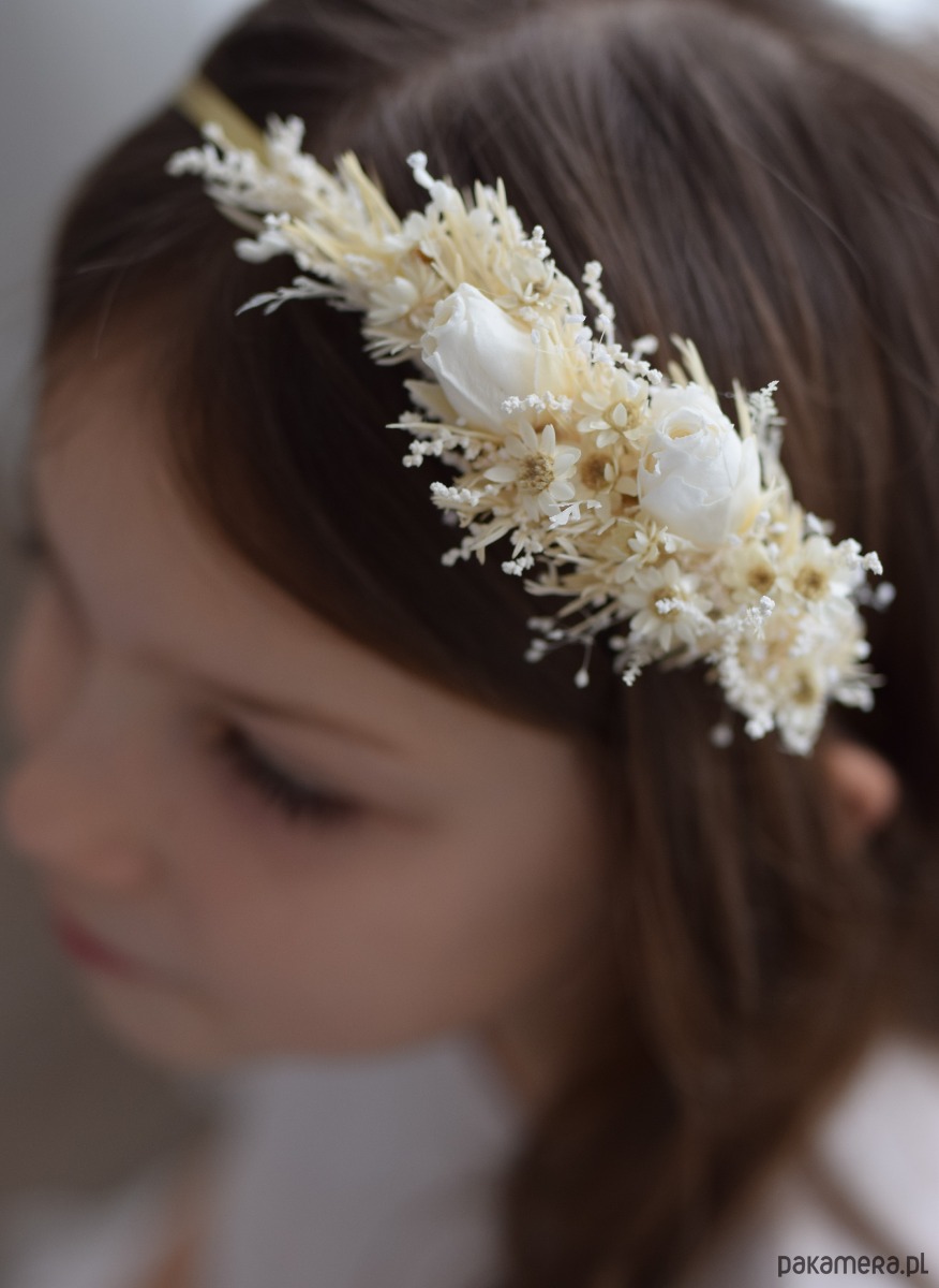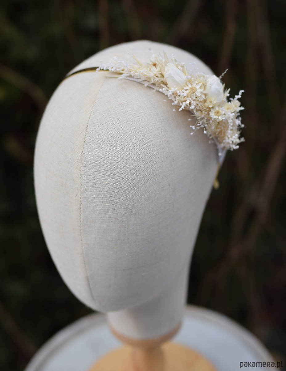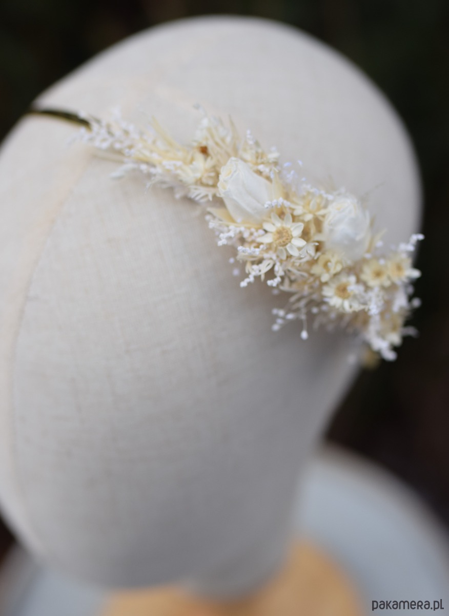 Opaska na głowę z białych stabilizowanych i suszonych kwiatów