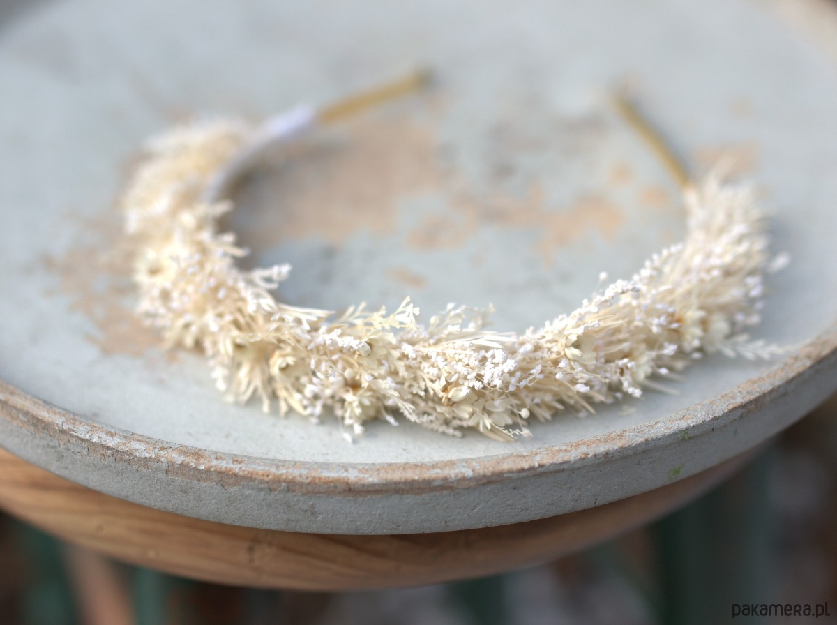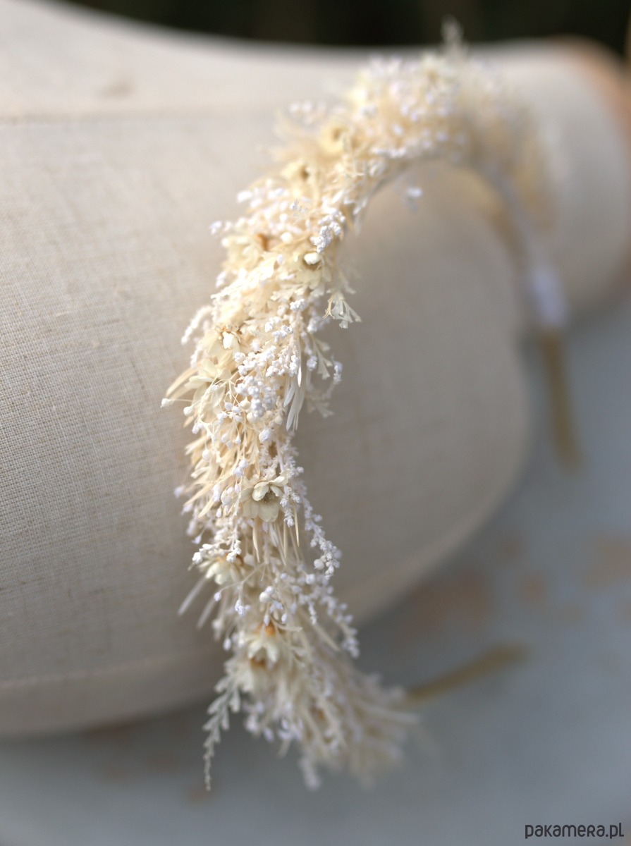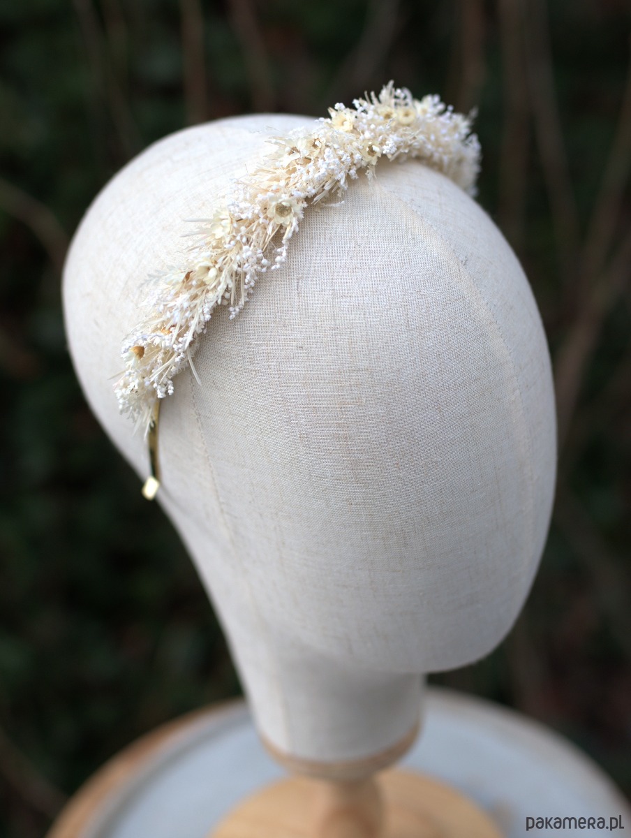 Opaska na głowę z białych stabilizowanych i suszonych kwiatów