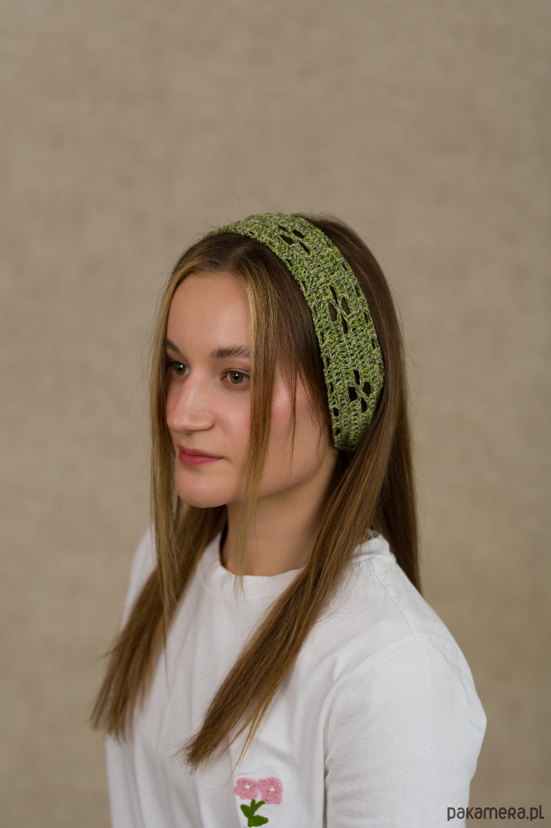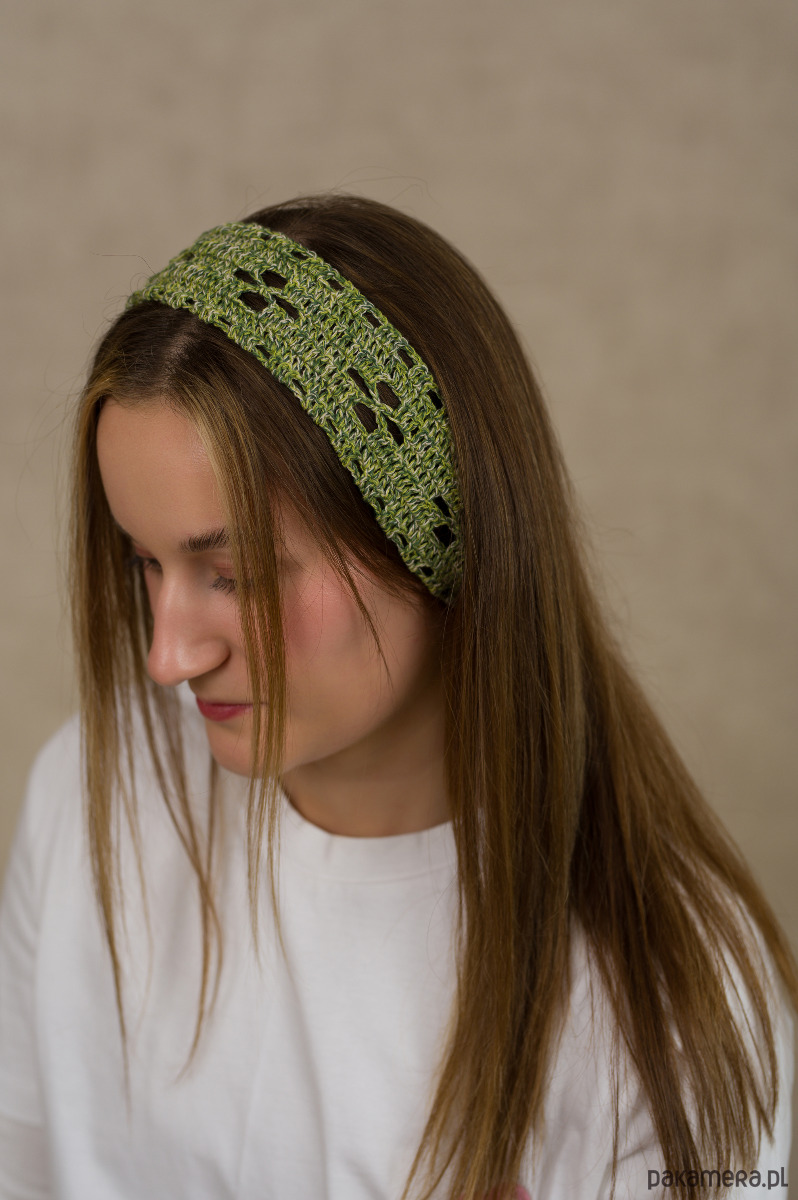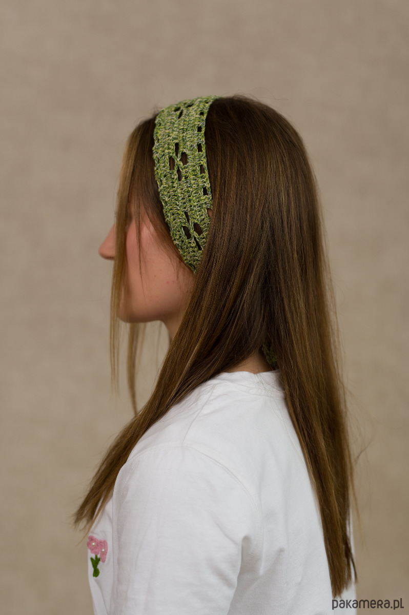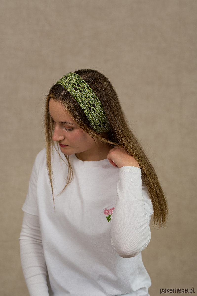 Chustka wykonana w 100% z bawełny organicznej w wyjątkowym zielonym melanżu, ozdobiona subtelnym wzorem przypominającym kwiatki lub koniczynki - interpretacja należy do Ciebie 🌿