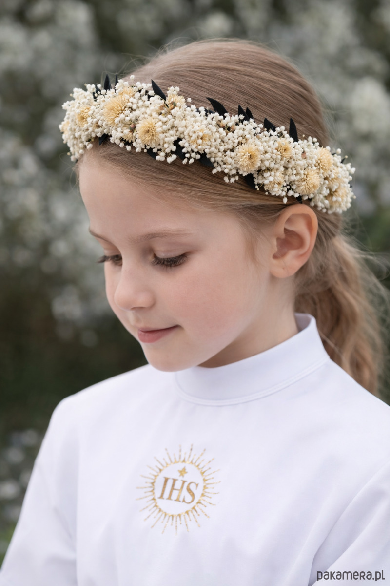 Subtelna przepaska komunijna wykonana z suszonych i stabilizowanych kwiatów na bazie metalowej opaski w kolorze złota.