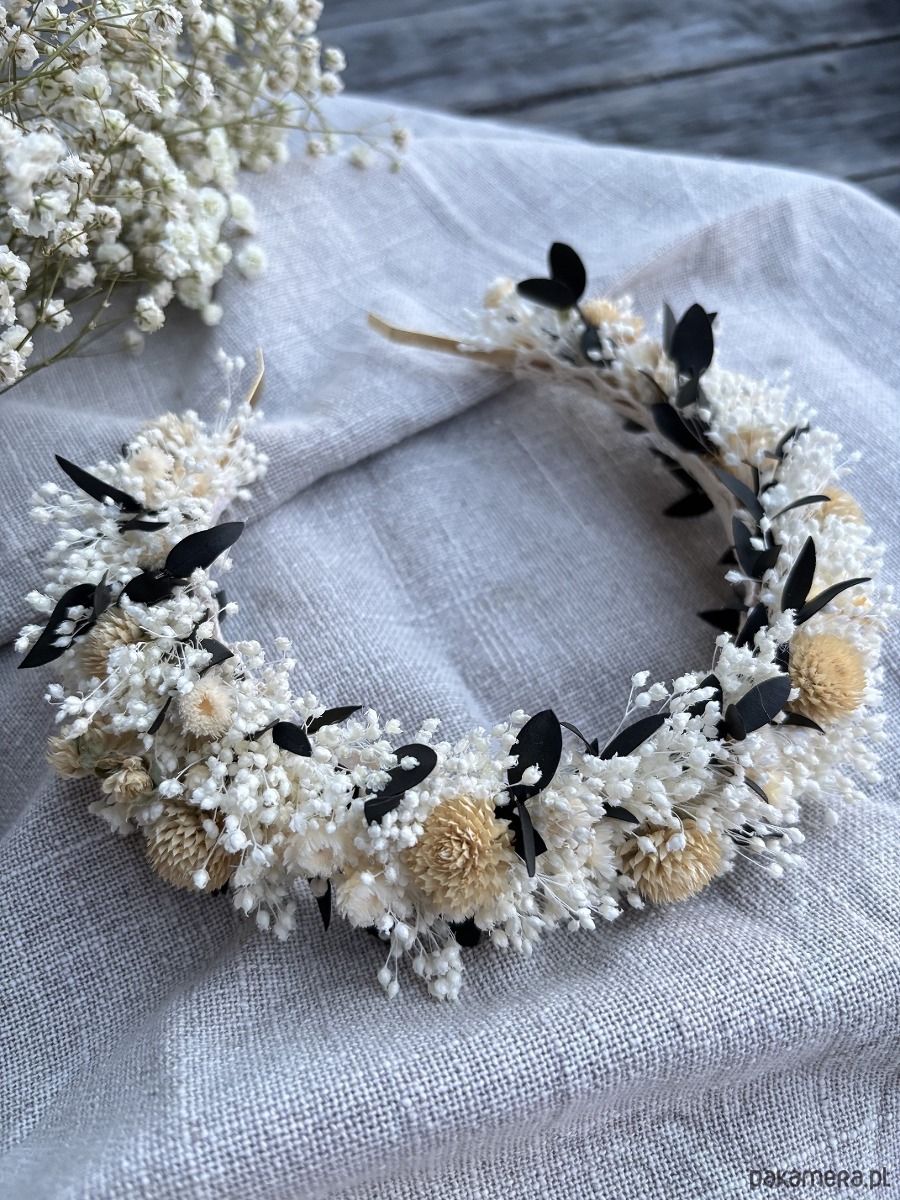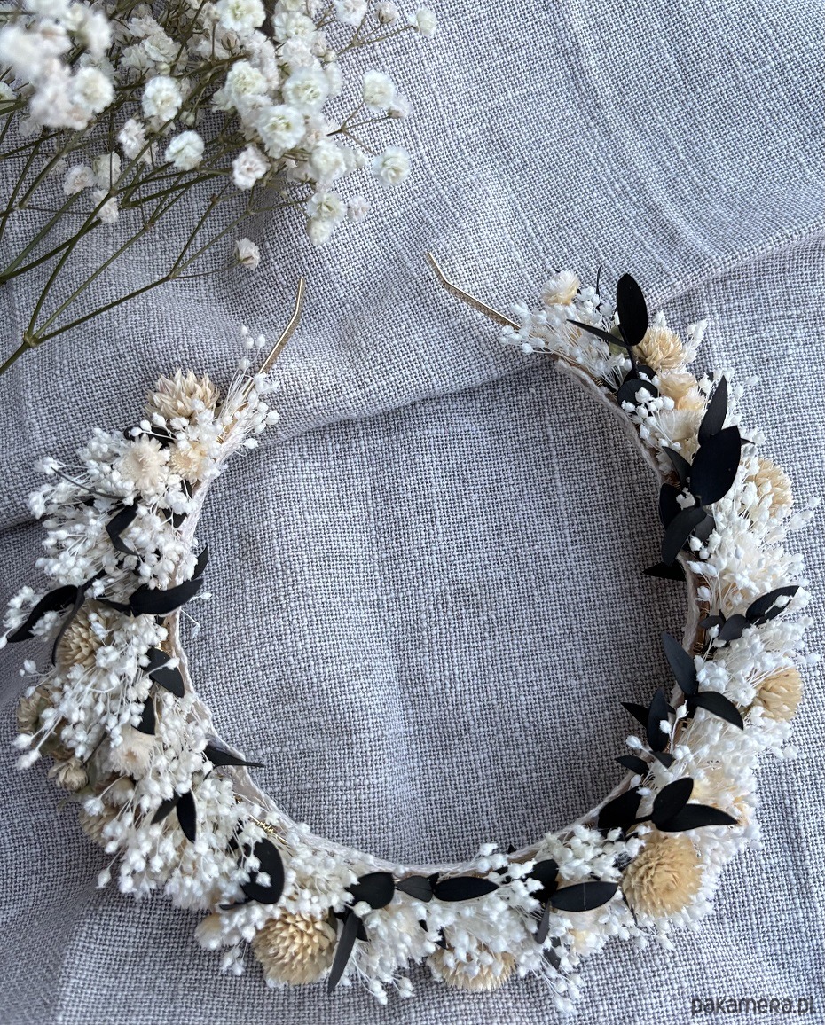 Opaska z suszonych i stabilizowanych kwiatów nie wymaga specjalnego traktowania, ani przechowywania w lodówce.