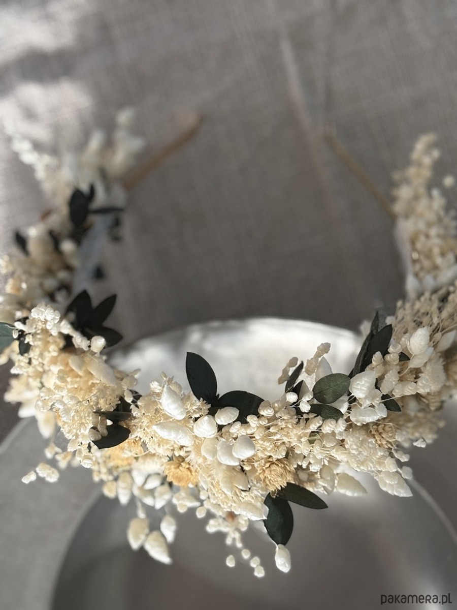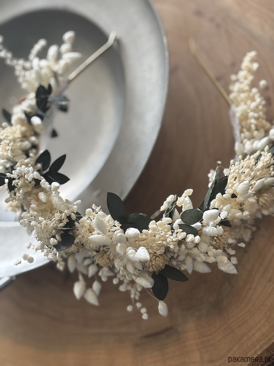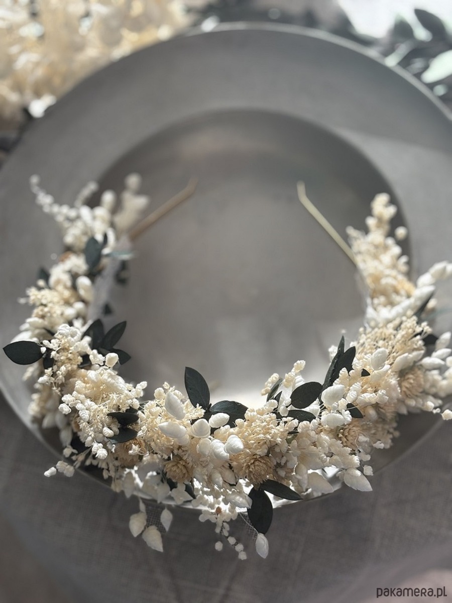 Opaska na komunię/wesele z suszonych i stabilizowanych kwiatów biel zieleń