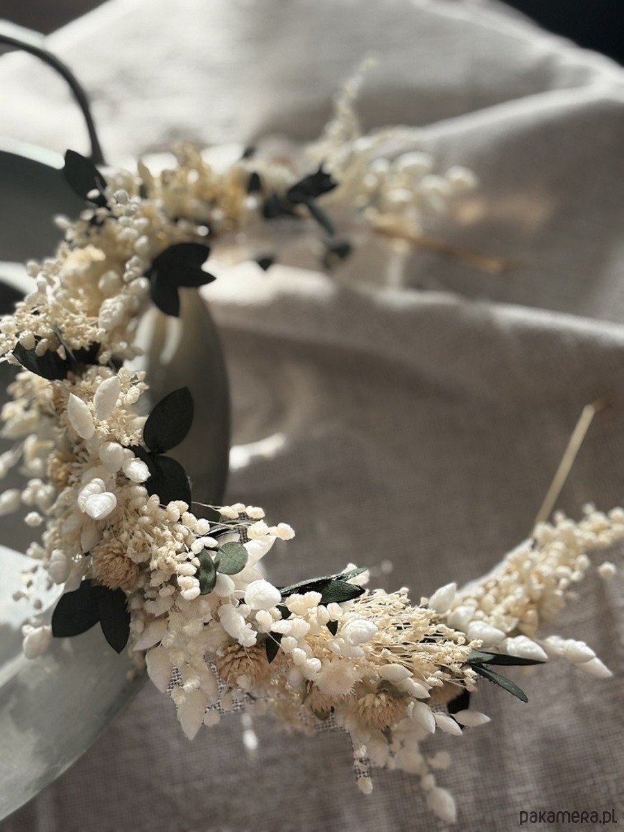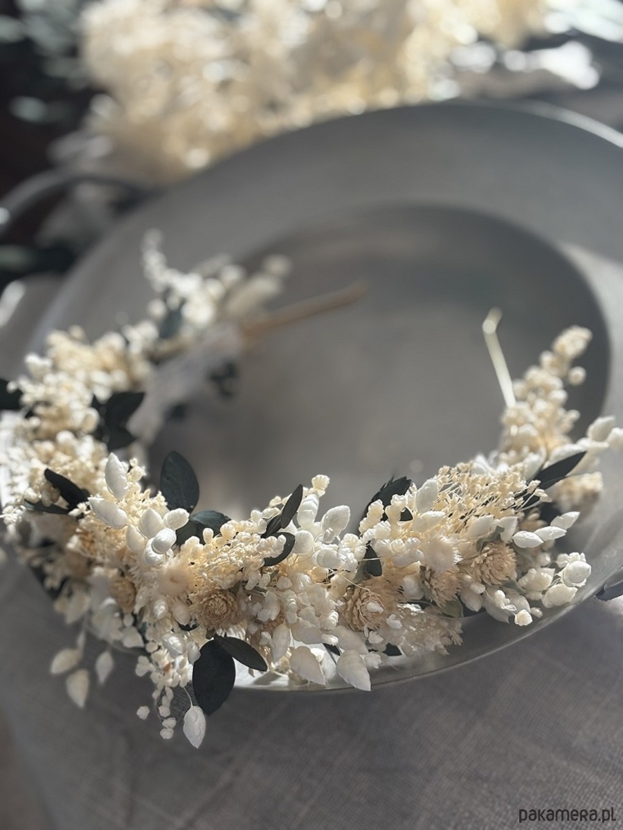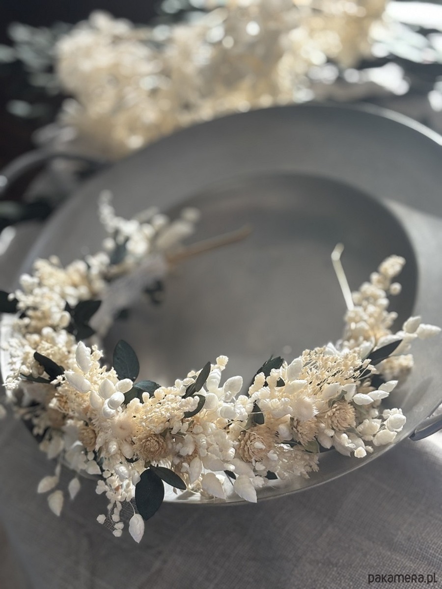 Opaska na komunię/wesele z suszonych i stabilizowanych kwiatów biel zieleń
