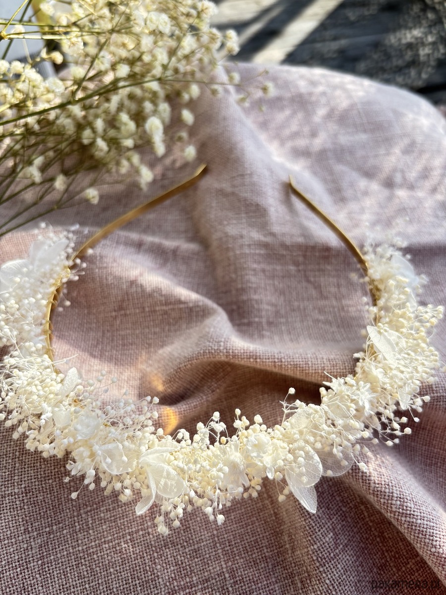 Subtelna i bardzo delikatna przepaska komunijna/weselna wykonana z suszonych i stabilizowanych kwiatów na bazie metalowej opaski w kolorze złota.