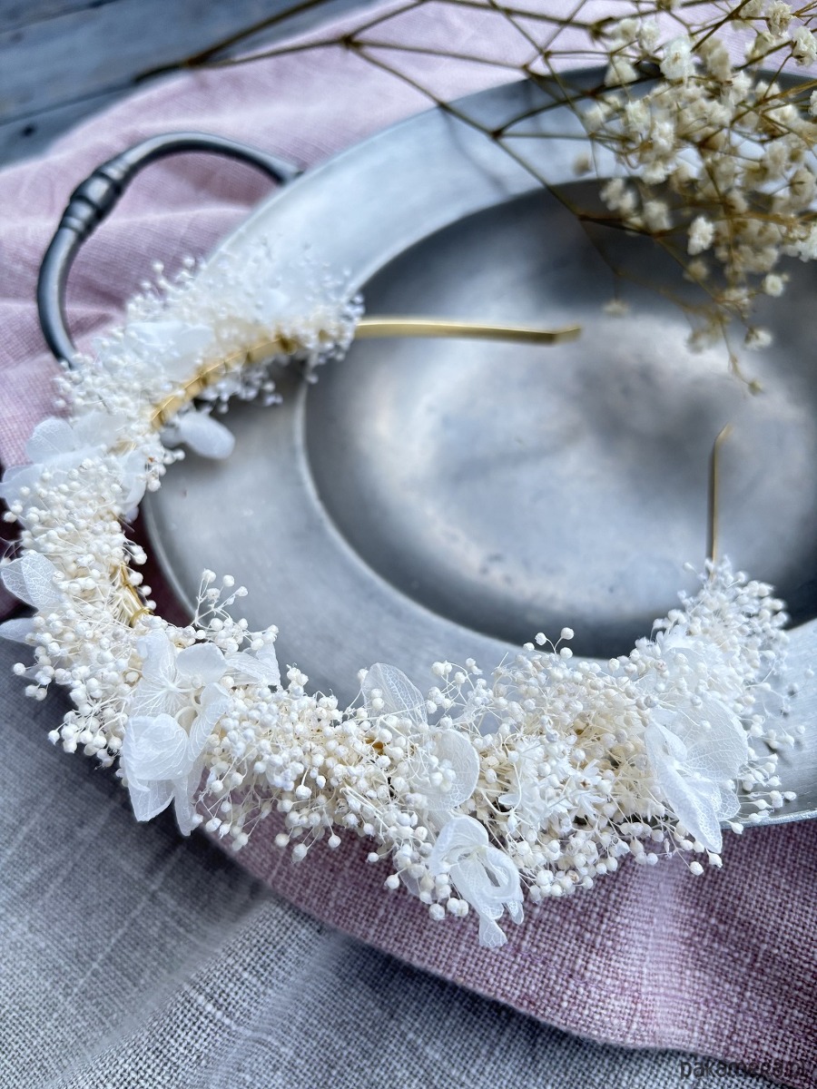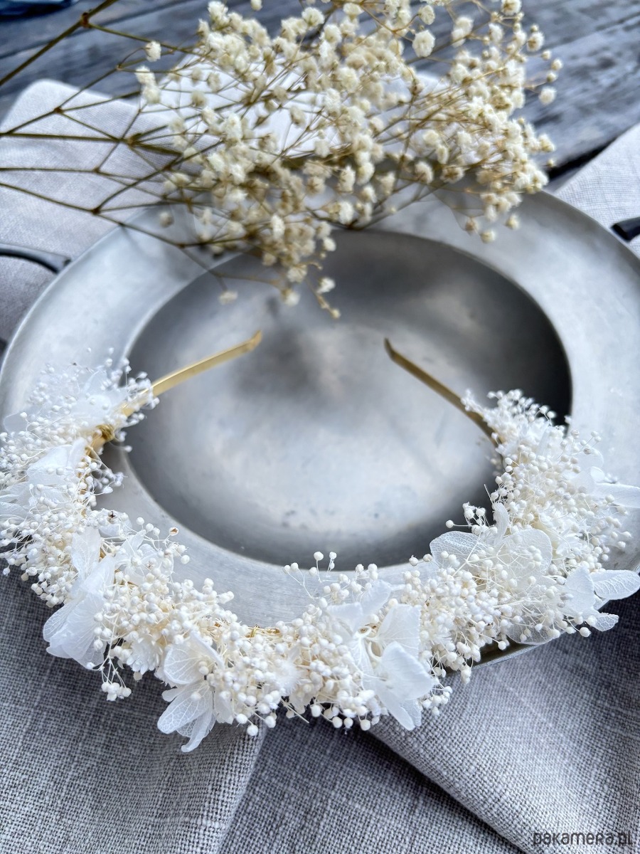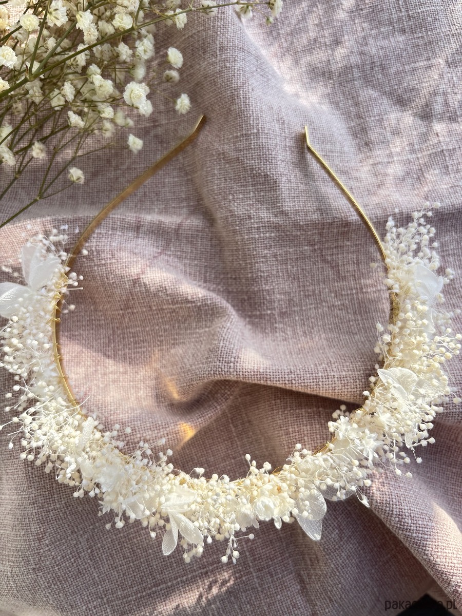Naturalna opaska wykonana ze stabilizowanej drobnej gipsówki, glixi i hortensji w kolorze złamanej bieli.