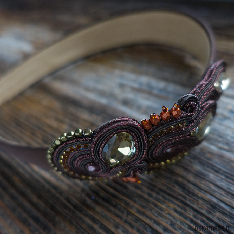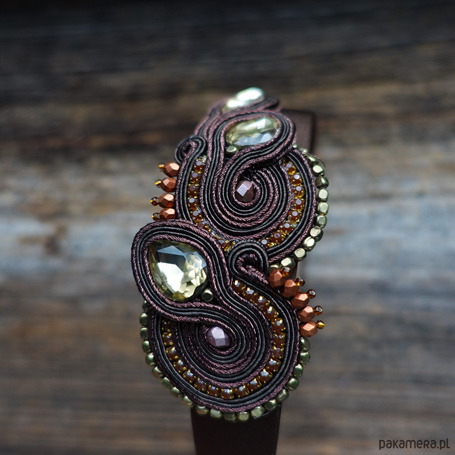Ozdobiona eleganckim haftem soutache w odcieniach czekoladowego brązu i starego złota.